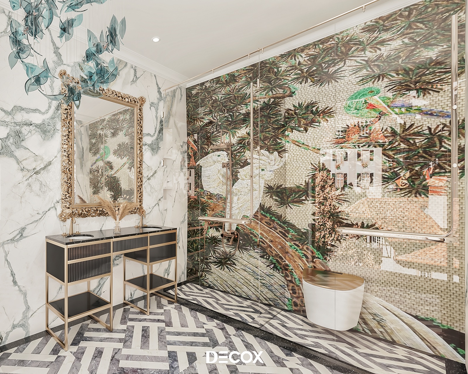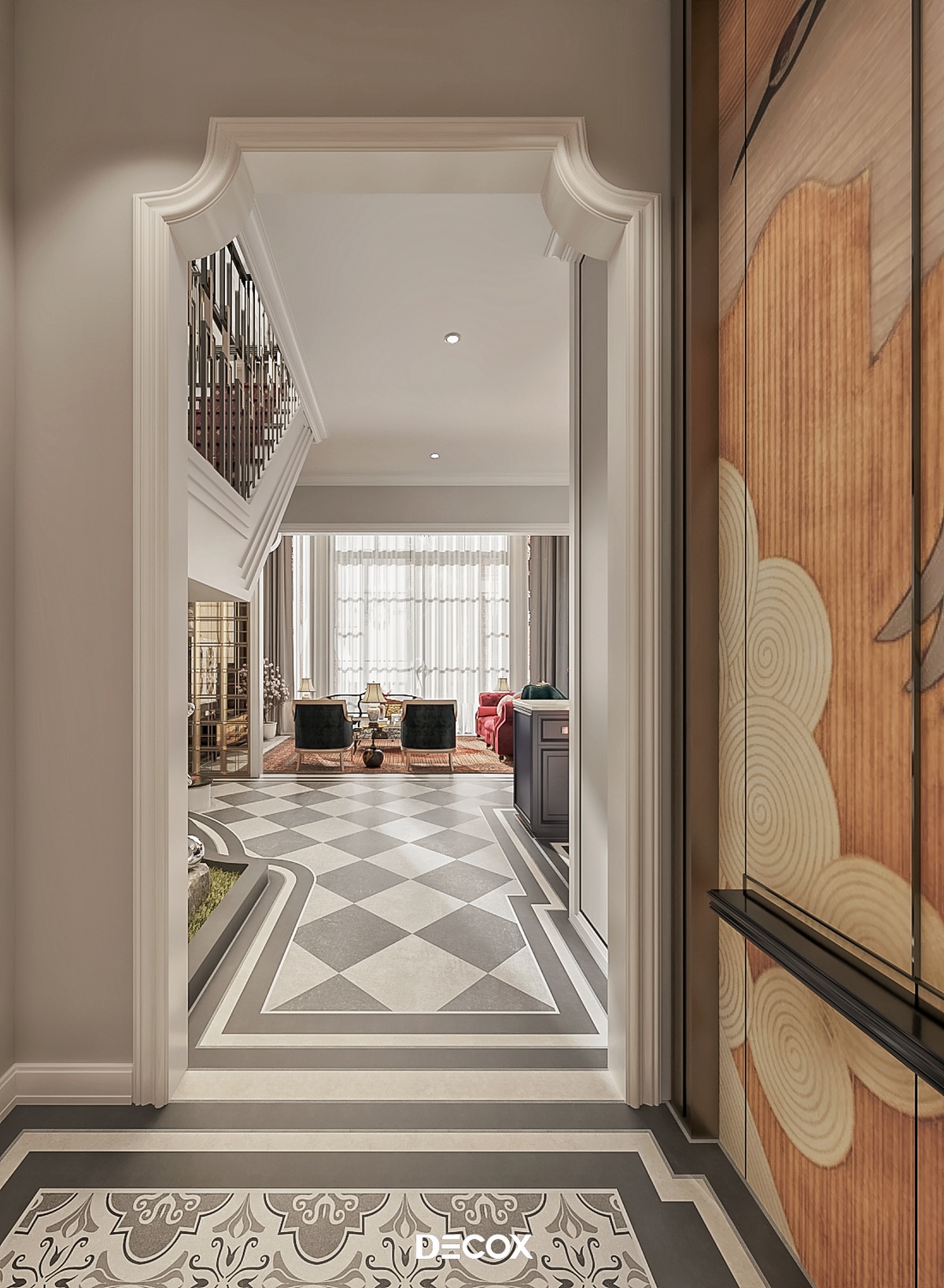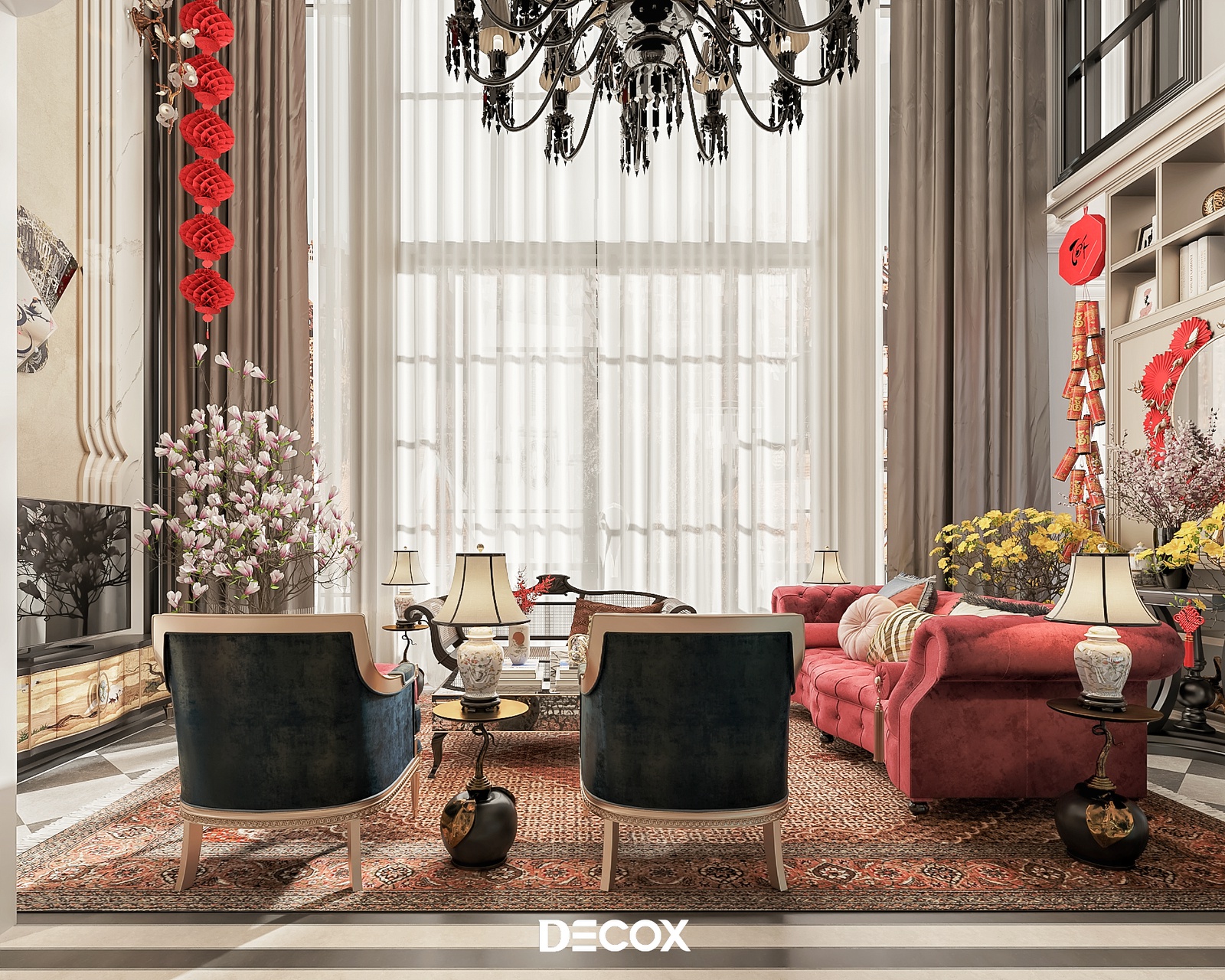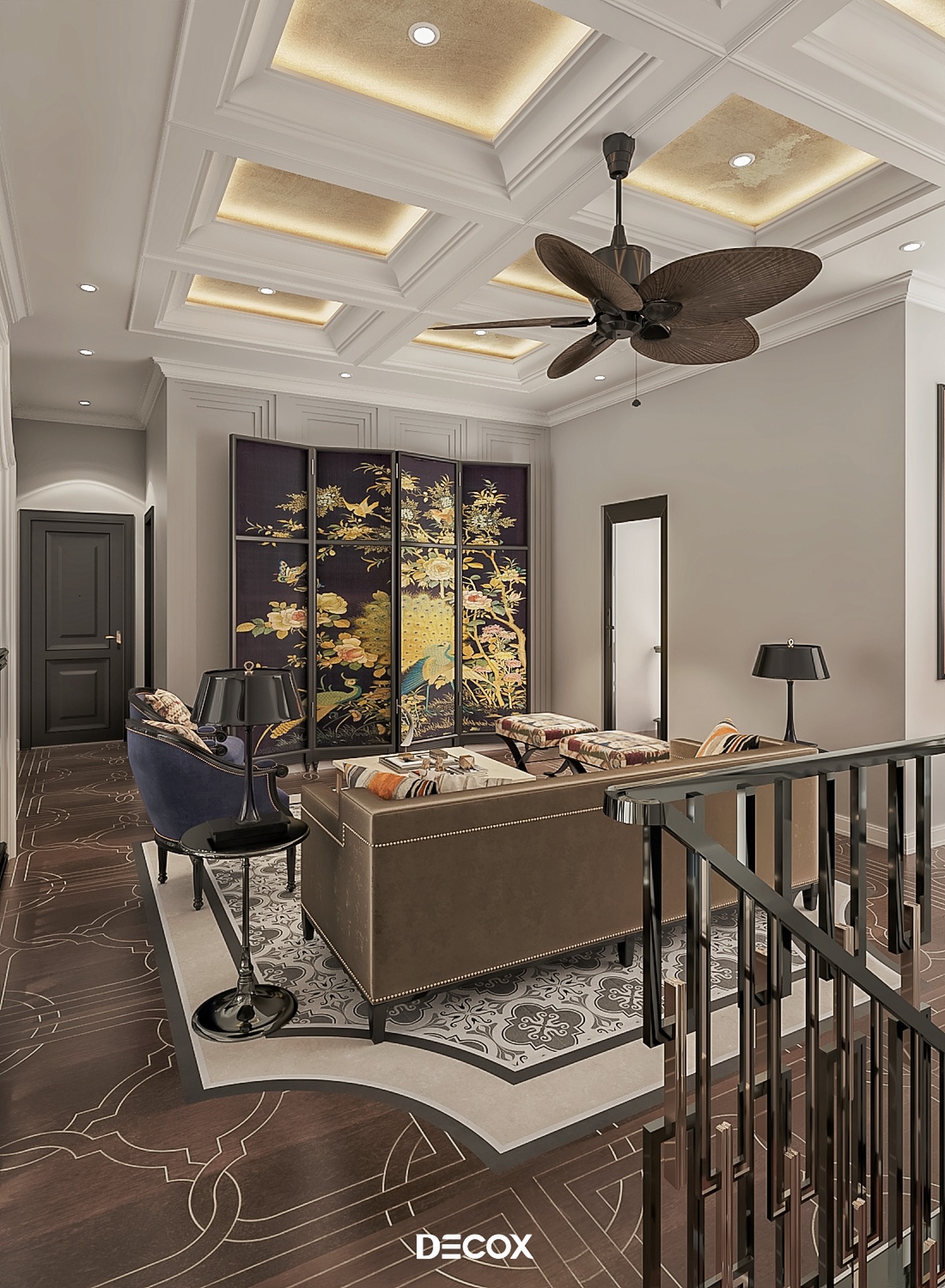 Văn hóa Việt được ví von như một cô gái đẹp, với góc nhìn đó KTS của Decox Design đã giữ nguyên dáng dấp Á Đông thông qua những đường nét đặc tả, chi tiết đặc trưng như tranh sơn dầu, sắc màu nhiệt đới, bình phong trang trí, biểu tượng chim hạc mang ý nghĩa may mắn, tốt lành. Đồng thời làm nên diện mạo mới cho văn hóa truyền thống cùng dòng chảy tân cổ điển sang trọng, vương giả. Đó như một chiếc áo mới mà cô gái khoác lên, vừa mới mẻ nhưng không phai mờ đi bản chất ban đầu.