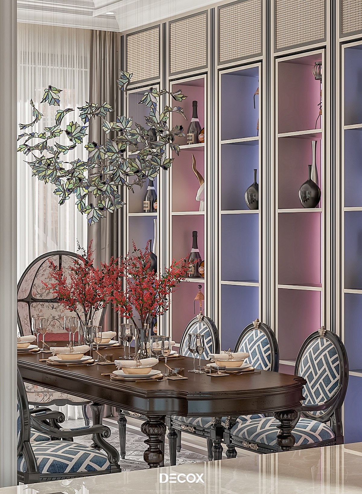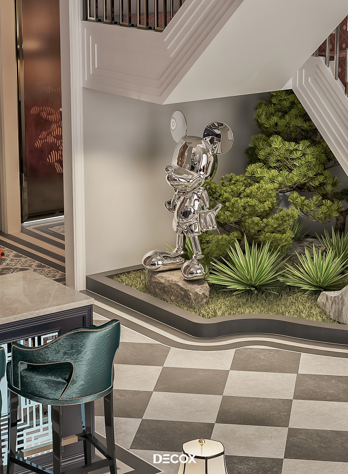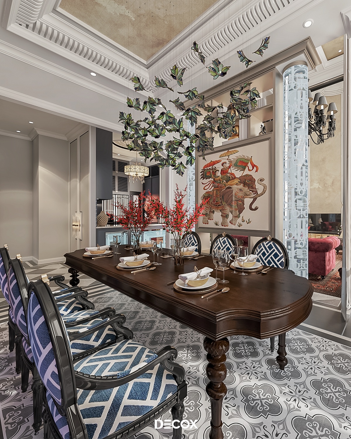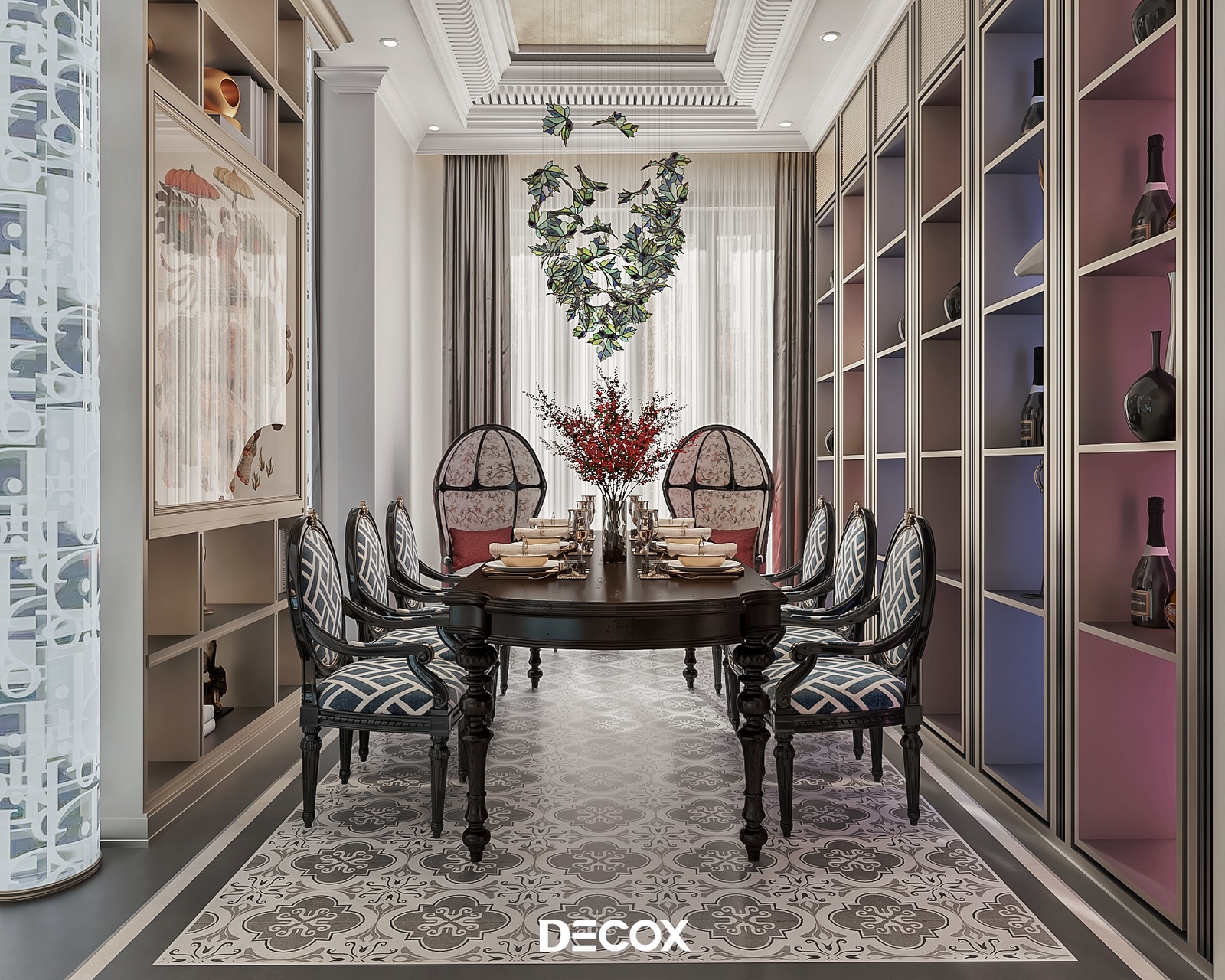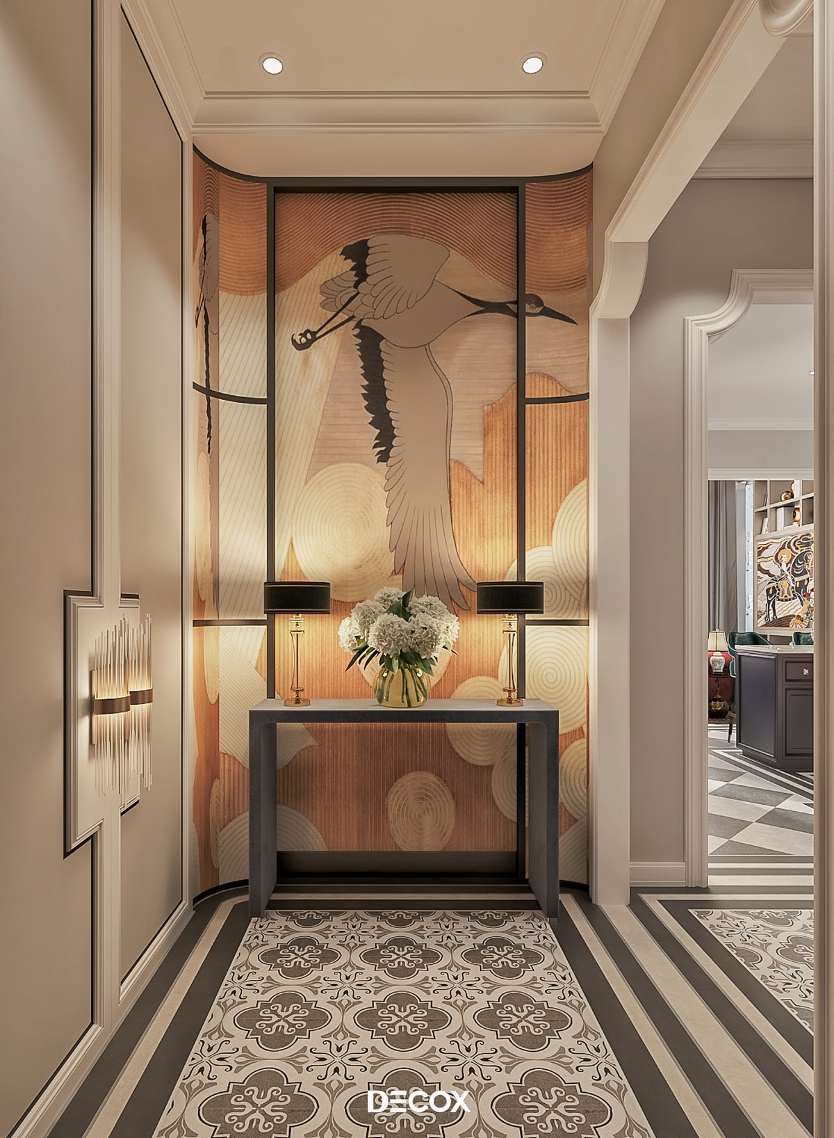 Văn hóa Việt được ví von như một cô gái đẹp, với góc nhìn đó KTS của Decox Design đã giữ nguyên dáng dấp Á Đông thông qua những đường nét đặc tả, chi tiết đặc trưng như tranh sơn dầu, sắc màu nhiệt đới, bình phong trang trí, biểu tượng chim hạc mang ý nghĩa may mắn, tốt lành. Đồng thời làm nên diện mạo mới cho văn hóa truyền thống cùng dòng chảy tân cổ điển sang trọng, vương giả. Đó như một chiếc áo mới mà cô gái khoác lên, vừa mới mẻ nhưng không phai mờ đi bản chất ban đầu.