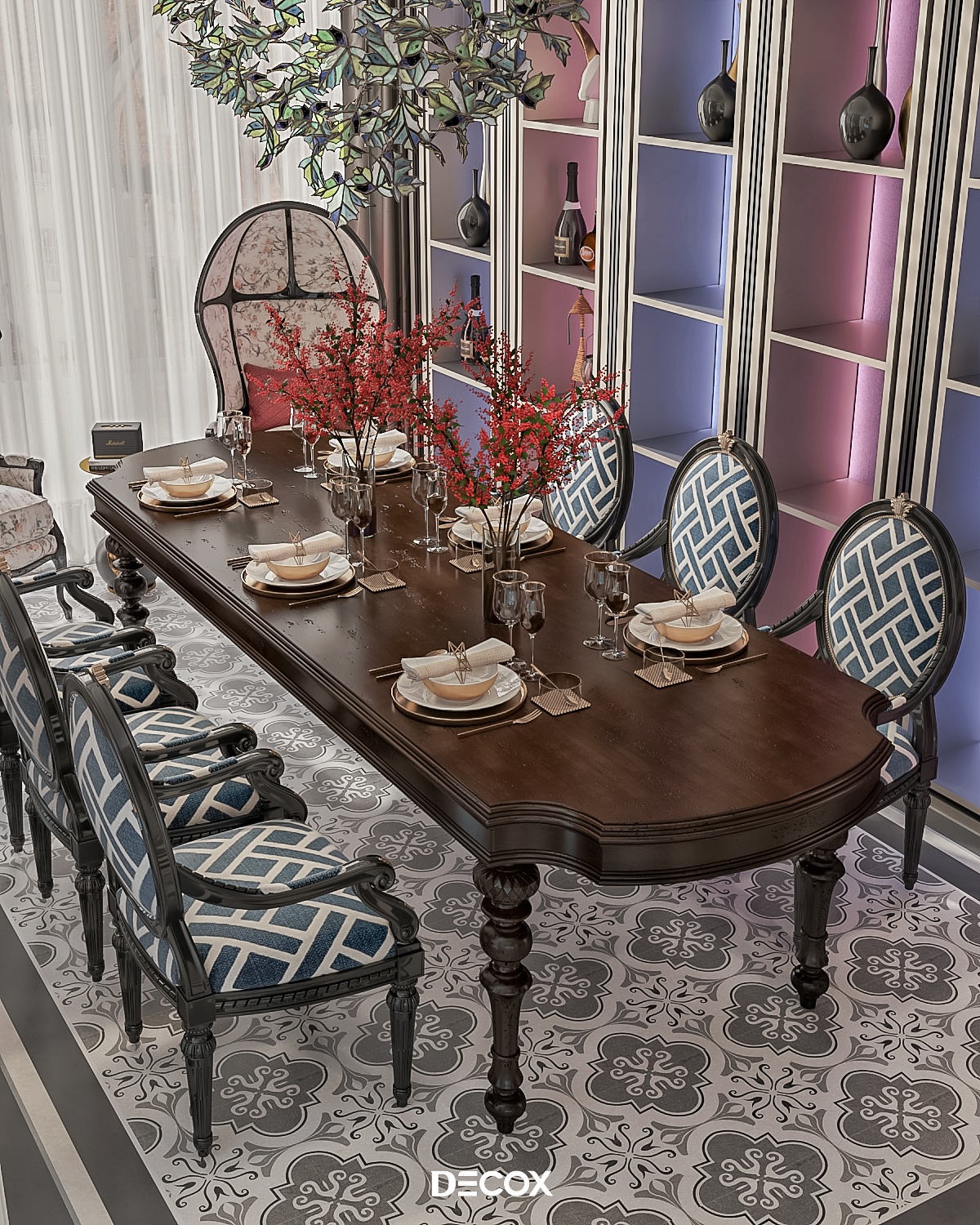 Mỗi không gian trong dự án này đều được khoác lên mình một màu sắc và họa tiết riêng biệt đầy cảm hứng nhưng cũng không kém phần trendy, bắt kịp xu hướng thời đại. Nếu không gian phòng khách - khu vực sinh hoạt chính của cả gia đình nổi bật lên với điểm nhấn đến từ tone màu Viva Magenta, sắc màu của năm 2023 thì không gian sảnh tầng 1 cũng không kém cạnh với sự xuất hiện của Very Peri, quý phái và tinh tế. Ngoài sự tinh tế trong cách sử dụng màu sắc để tạo nên bản sắc riêng cho từng không gian, KTS còn khéo léo lồng ghép những yếu tố đặc trưng của văn hóa Việt vào không gian sống. Đó là chiếc quạt trần Indochine, gạch bông lát sàn và cả bức bình phong với họa tiết chim công - biểu tượng của sự vương giả và quyền uy, đại diện cho một cuộc sống giàu sang, phú quý và hạnh phúc.