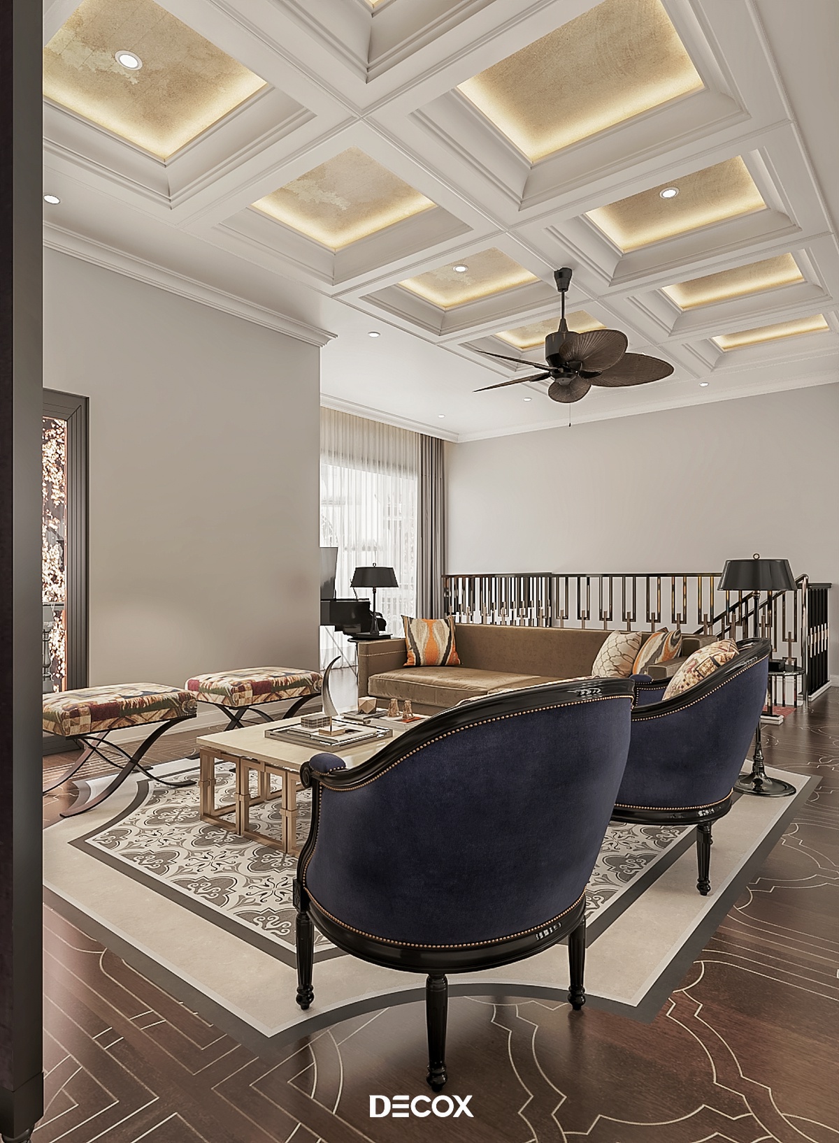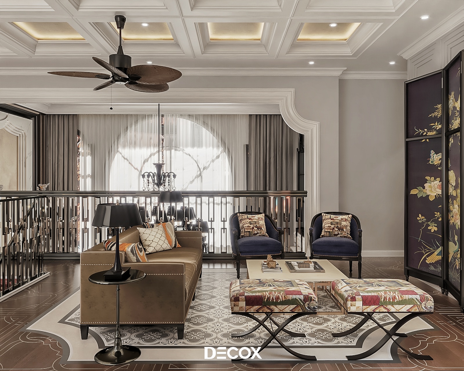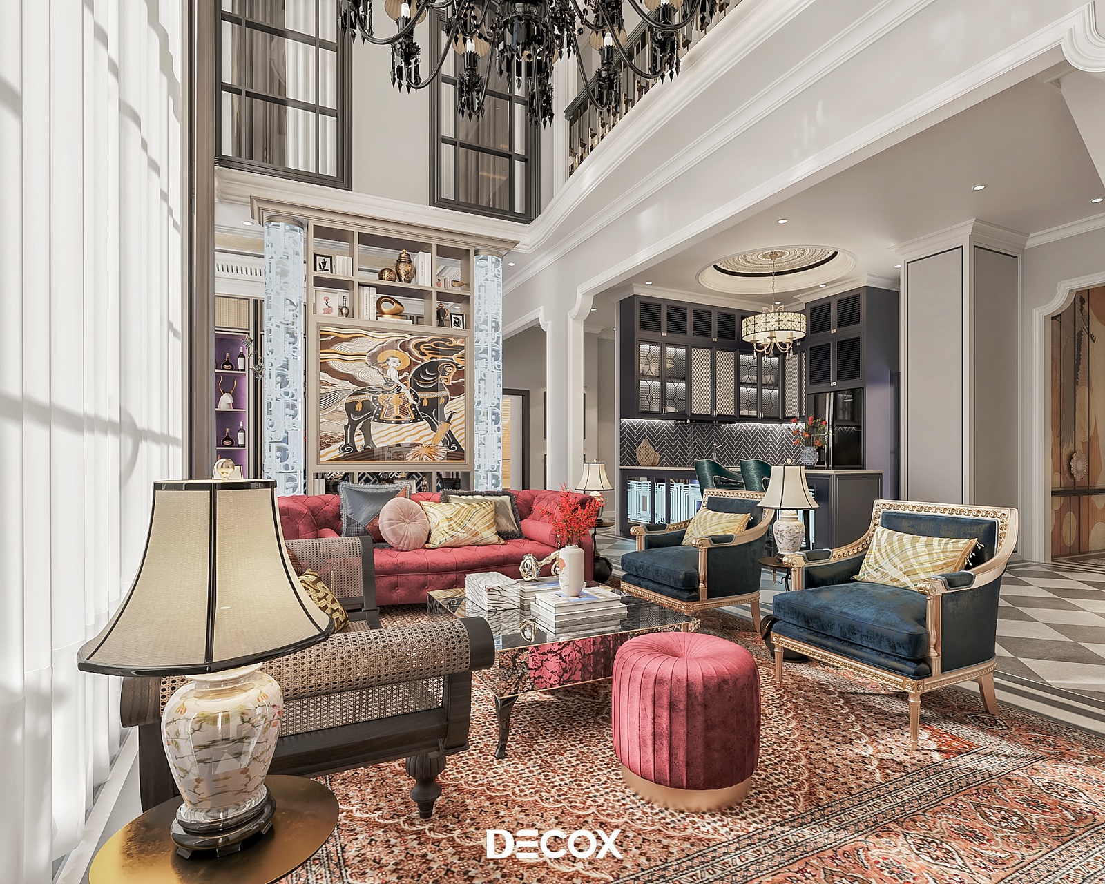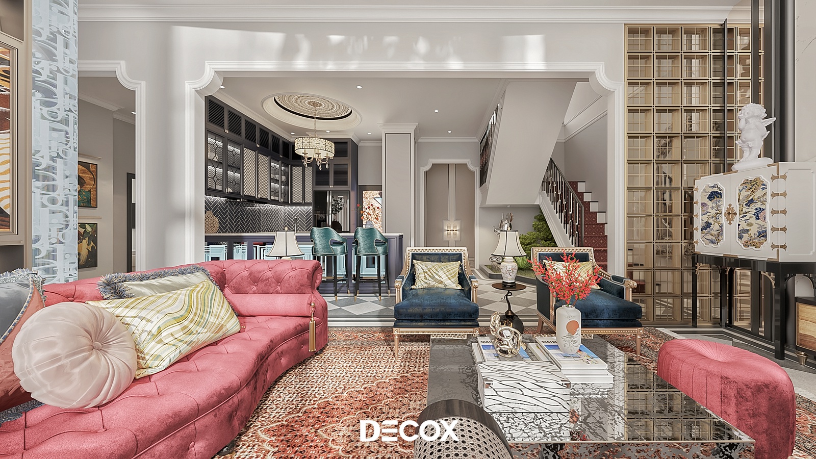 Có thể nói, không gian nội thất là sự phản chiếu chuẩn xác nhất về gu thẩm mỹ, cá tính cũng như phong cách sống của gia chủ. Và phòng khách trong dự án này cũng là một không gian như thế. Thiết kế lấy tinh thần tân cổ điển làm nền tảng, màu sắc, họa tiết phương Đông làm điểm nhấn để mang đến một không gian sống khoác lên mình “chiếc áo” mang sắc thái Đông - Tây kết hợp đầy ý vị.