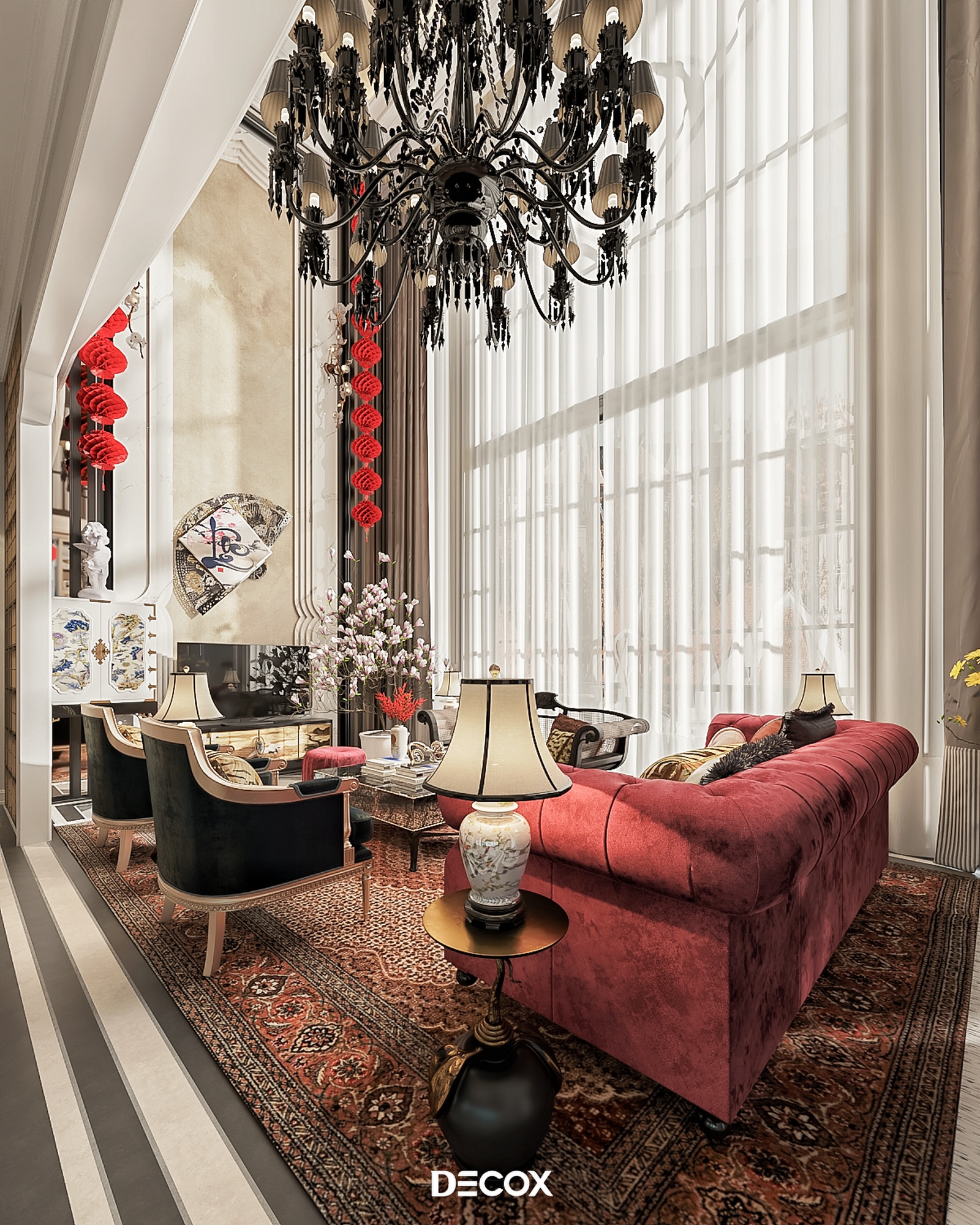 Chuẩn mực mỹ học phương Đông được thể hiện đầy khéo léo thông qua những chi tiết như: bảng màu táo bạo đậm chất nhiệt đới nhưng cũng không kém phần sang trọng: đỏ rượu vang và xanh navy; thảm trải sàn họa tiết thổ cẩm; bức tranh đông hồ nhấn điểm phía sau khu vực tivi; chất lụa mềm mại; chất gỗ mộc mạc, được ứng dụng trên đồ nội thất. Hay chiếc đèn bàn với phần thân đèn được chế tác từ chất liệu gốm sứ, hình dáng tròn đầy phúc hậu điểm tô thêm họa tiết cây mai mang đậm bản sắc văn hóa truyền thống châu Á - biểu tượng của sự may mắn, thịnh vượng.