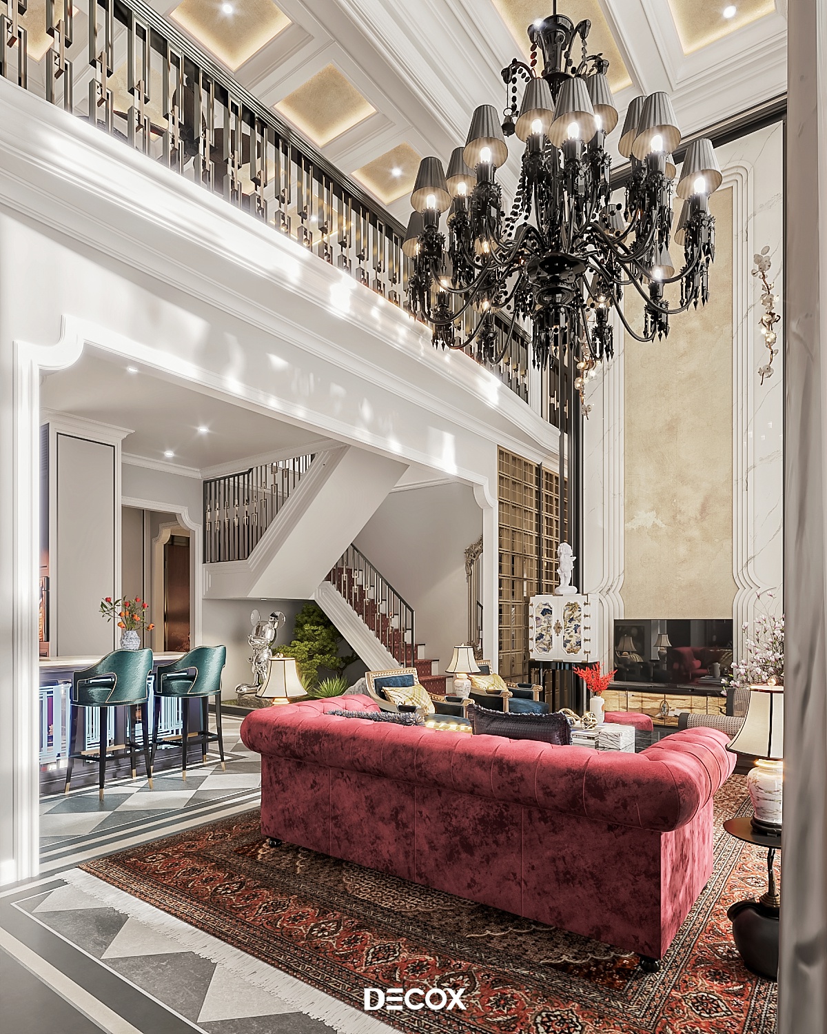 Tuy sở hữu nhiều chi tiết mang bản sắc riêng của phong cách Indochine, thế nhưng khi nhìn vào tổng thể bạn vẫn sẽ cảm nhận được chất Tây, sang trọng và cổ kính thông qua gam màu trung tính nền nã đóng vai trò chủ đạo, chiếc ghế sofa bọc nút, đèn chùm pha lê dạng nến cổ điển và cả những đường phào chỉ, chi tiết chạm trổ tinh tế chỉ có trong phong cách Tân cổ điển.