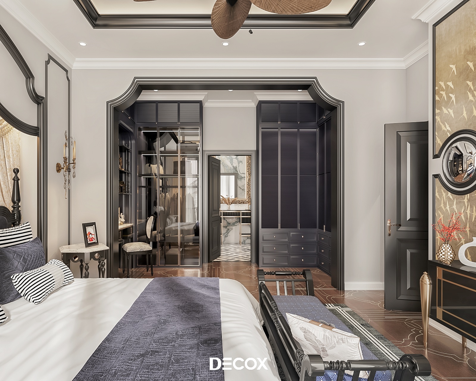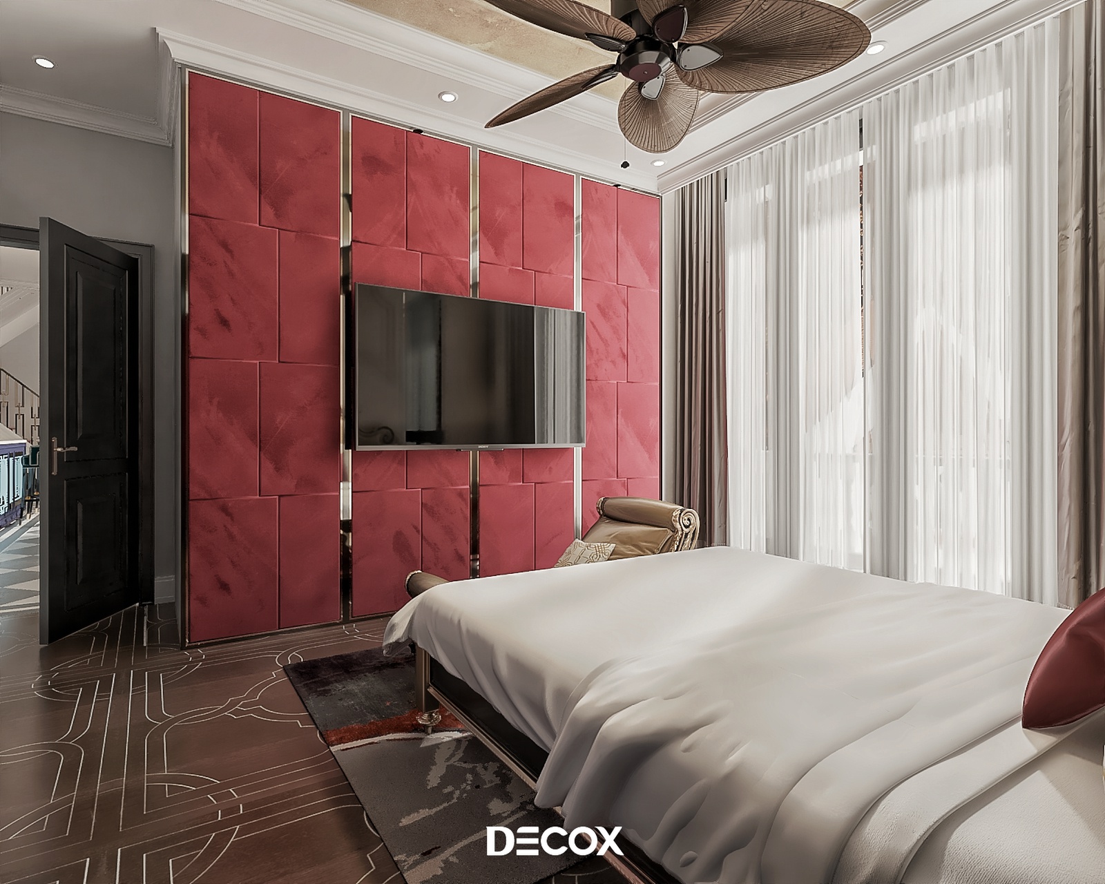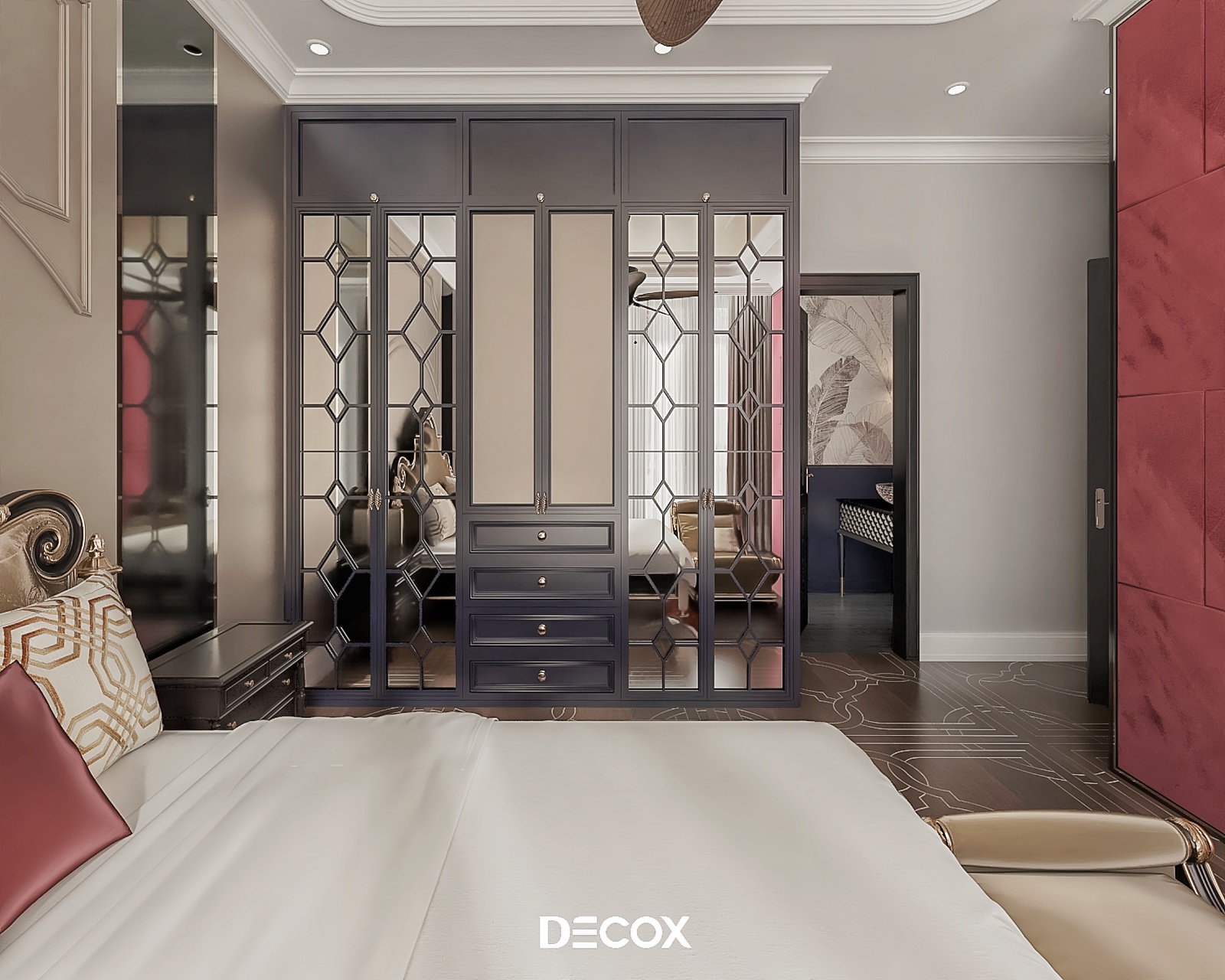 Dự án mang đậm dấu ấn cá nhân, điều này được thể hiện rõ nét thông qua cách decor không gian phòng ngủ. Lấy chuẩn mực sang trọng, quyền quý của phong cách tân cổ điển cộng hưởng cùng yếu tố màu sắc, hoa văn họa tiết đặc trưng của phong cách Indochine, thế nhưng ở mỗi phòng ngủ bạn sẽ cảm nhận được cá tính, chất gu của chủ nhân căn phòng thông qua cách vận dụng, mix match màu sắc trong không gian. Như trong phòng ngủ này, thiết kế mang đến một không gian sang trọng, tinh tế nhưng cũng không kém phần quyền lực với sự hiện diện của sắc đỏ đóng vai trò nhấn điểm. Ngoài ra, sự giàu sang, sung túc cũng được thể hiện khéo léo thông qua những chất liệu giàu tính phản chiếu decor trên tường và đồ nội thất.