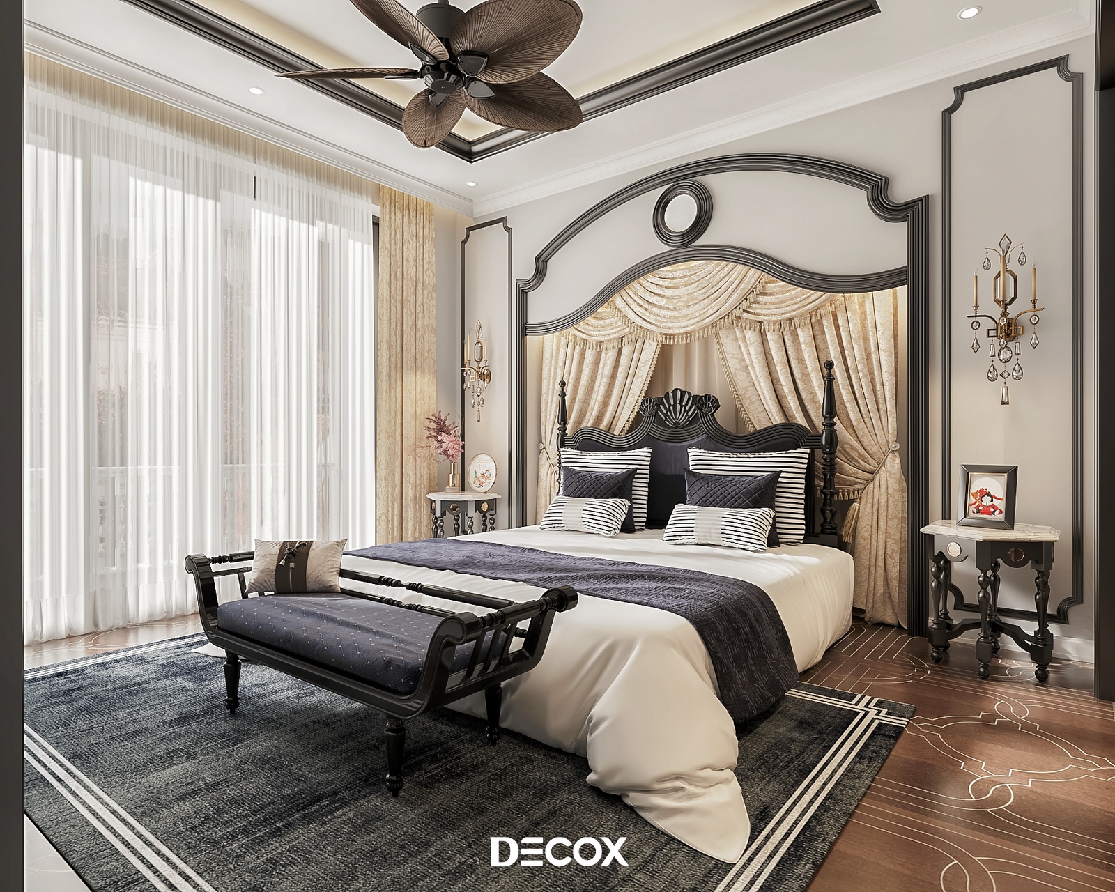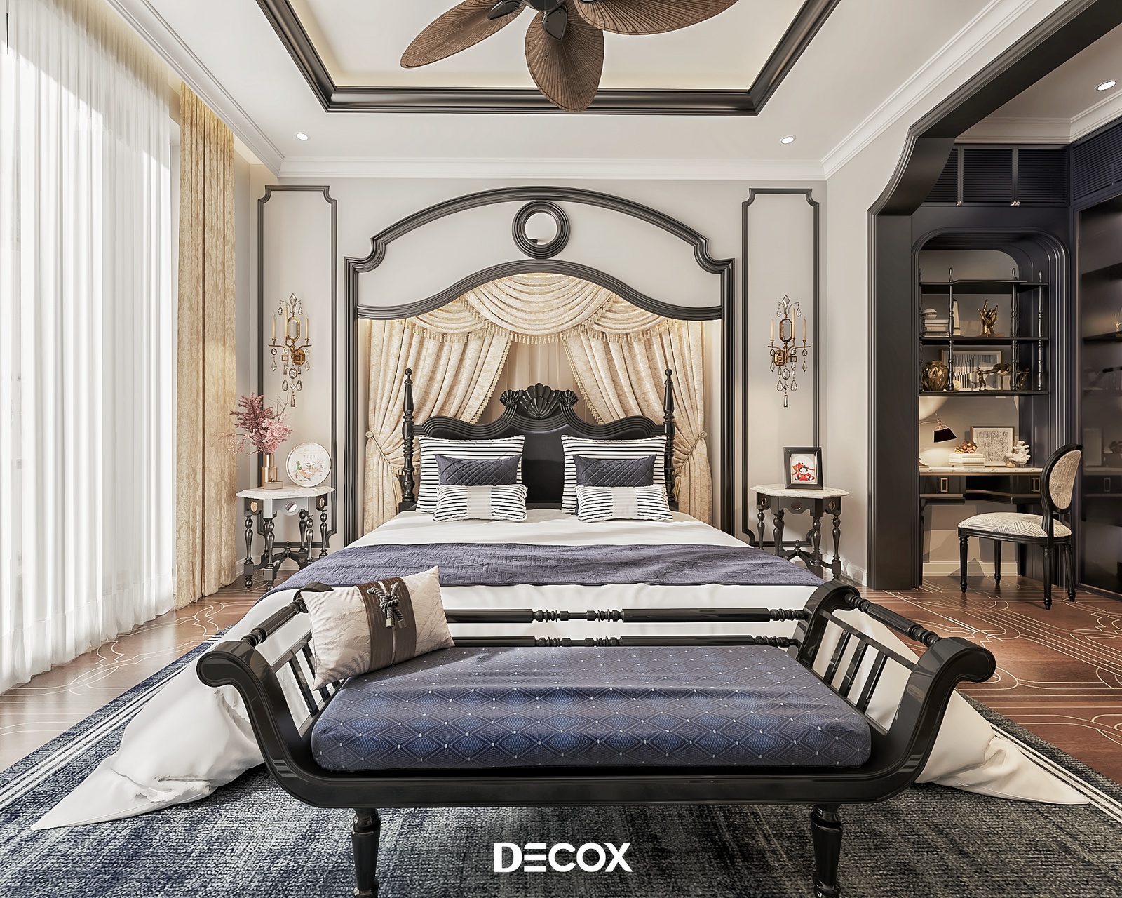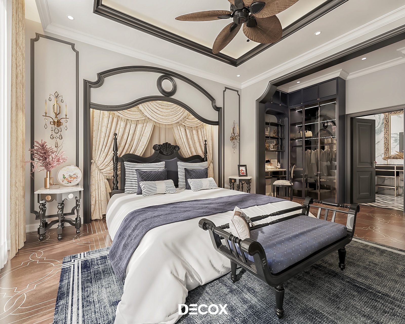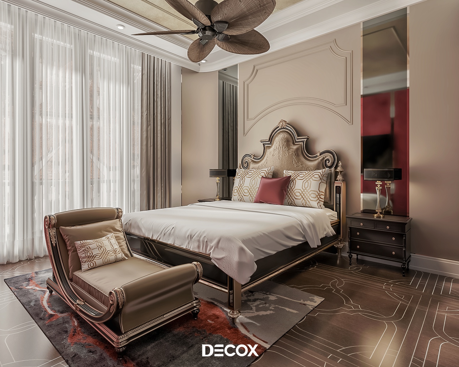 Dự án mang đậm dấu ấn cá nhân, điều này được thể hiện rõ nét thông qua cách decor không gian phòng ngủ. Lấy chuẩn mực sang trọng, quyền quý của phong cách tân cổ điển cộng hưởng cùng yếu tố màu sắc, hoa văn họa tiết đặc trưng của phong cách Indochine, thế nhưng ở mỗi phòng ngủ bạn sẽ cảm nhận được cá tính, chất gu của chủ nhân căn phòng thông qua cách vận dụng, mix match màu sắc trong không gian. Như trong phòng ngủ này, thiết kế mang đến một không gian sang trọng, tinh tế nhưng cũng không kém phần quyền lực với sự hiện diện của sắc đỏ đóng vai trò nhấn điểm. Ngoài ra, sự giàu sang, sung túc cũng được thể hiện khéo léo thông qua những chất liệu giàu tính phản chiếu decor trên tường và đồ nội thất.