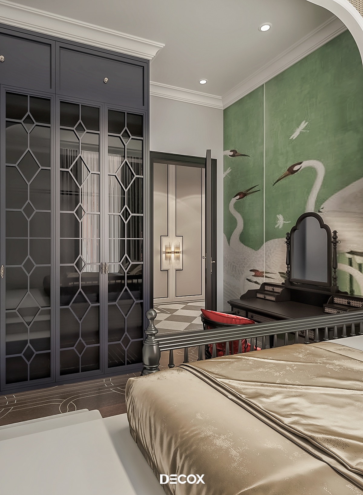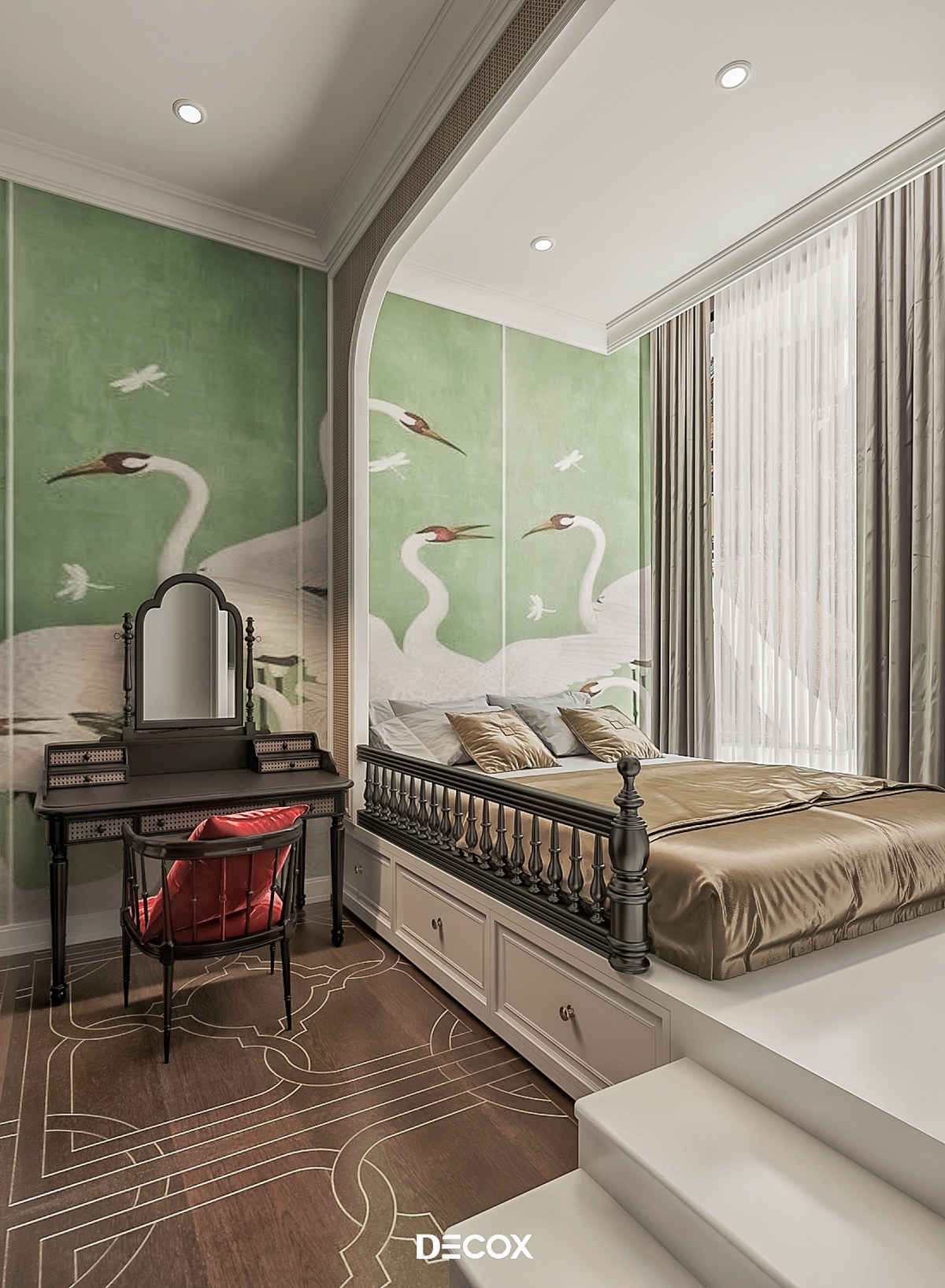 Nếu 2 phòng ngủ trên mang đến cảm nhận về một không gian sang trọng và có phần quyền lực thì không gian phòng ngủ sau đây sẽ là nơi xoa dịu cảm xúc tuyệt vời với điểm nhấn từ tone màu xanh lá, tươi mát và yên bình. Những hoa văn, họa tiết hiện diện trong không gian Indochine không phải ghép nối một cách ngẫu hứng mà đều mang trong mình những câu chuyện riêng, đồng thời liên quan mật thiết đến văn hoa dân tộc. Và với không gian phòng ngủ này, KTS đã lựa chọn biểu tượng chim hạc điểm tô cho bức tường khu vực đầu giường. Chim hạc trong văn hóa phương Đông được xem như một linh vật mang trong mình ngụ ý về sự quyền quý, cao sang, trường thọ và tượng trưng cho hạnh phúc. Đây là hình tượng thường được bắt gặp trong những không gian đậm chất Indochine.