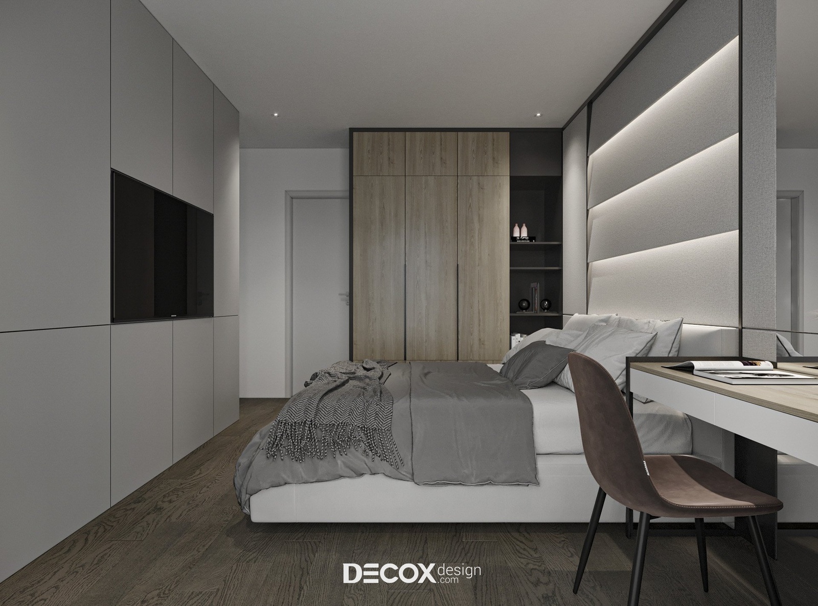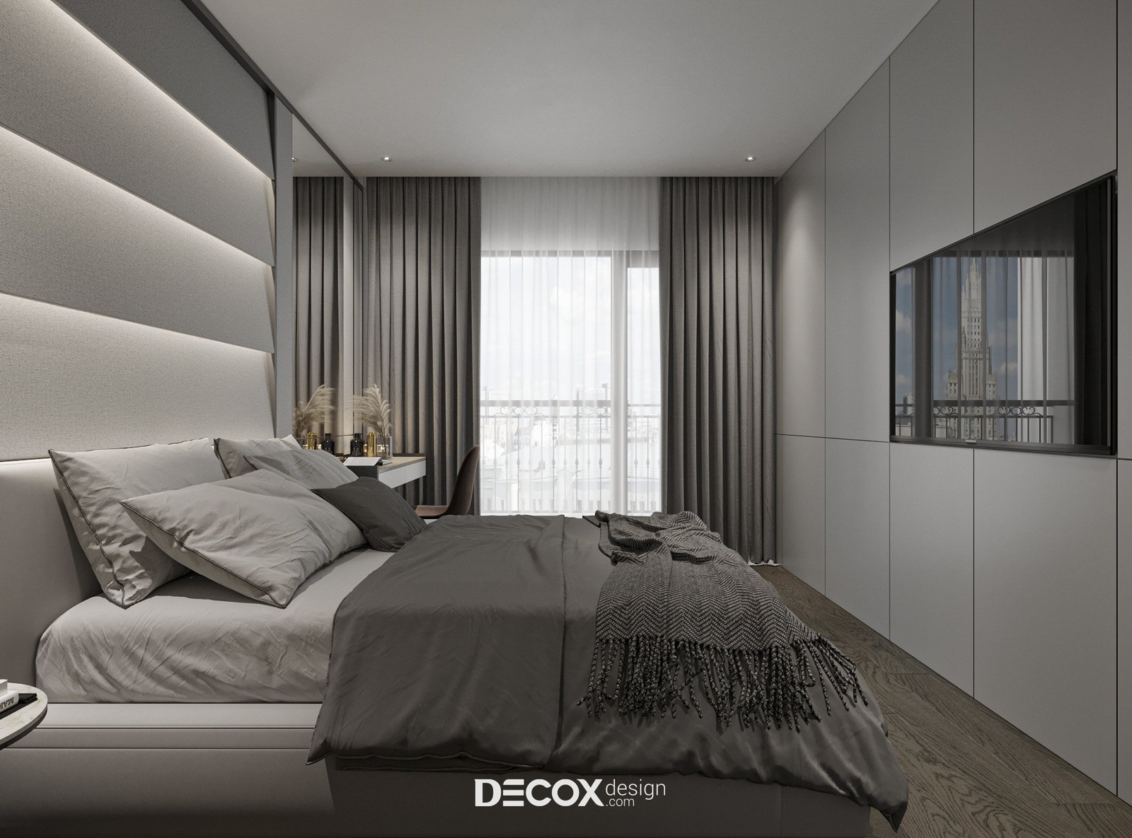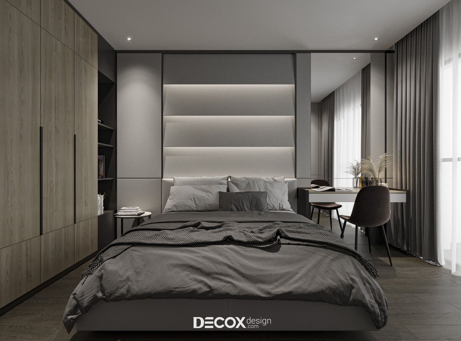 Thiết kế phòng ngủ giữ nguyên tinh thần hiện đại kết hợp cùng cách bố trí nội thất tối giản đem đến một không gian rộng rãi, thoải mái nhưng vẫn đảm bảo đầy đủ công năng cần thiết đáp ứng nhu cầu sử dụng của chủ nhân căn phòng. Tone xám thanh lịch được chọn lựa làm gam màu chủ đạo cho không gian này. Bên cạnh đó, KTS cũng bổ sung thêm chất liệu gỗ cùng ánh sáng tự nhiên thông qua hệ cửa kính lớn để cân bằng không gian, tăng thêm độ ấm cúng và giảm tải sự lạnh lẽo, đơn điệu cho căn phòng.