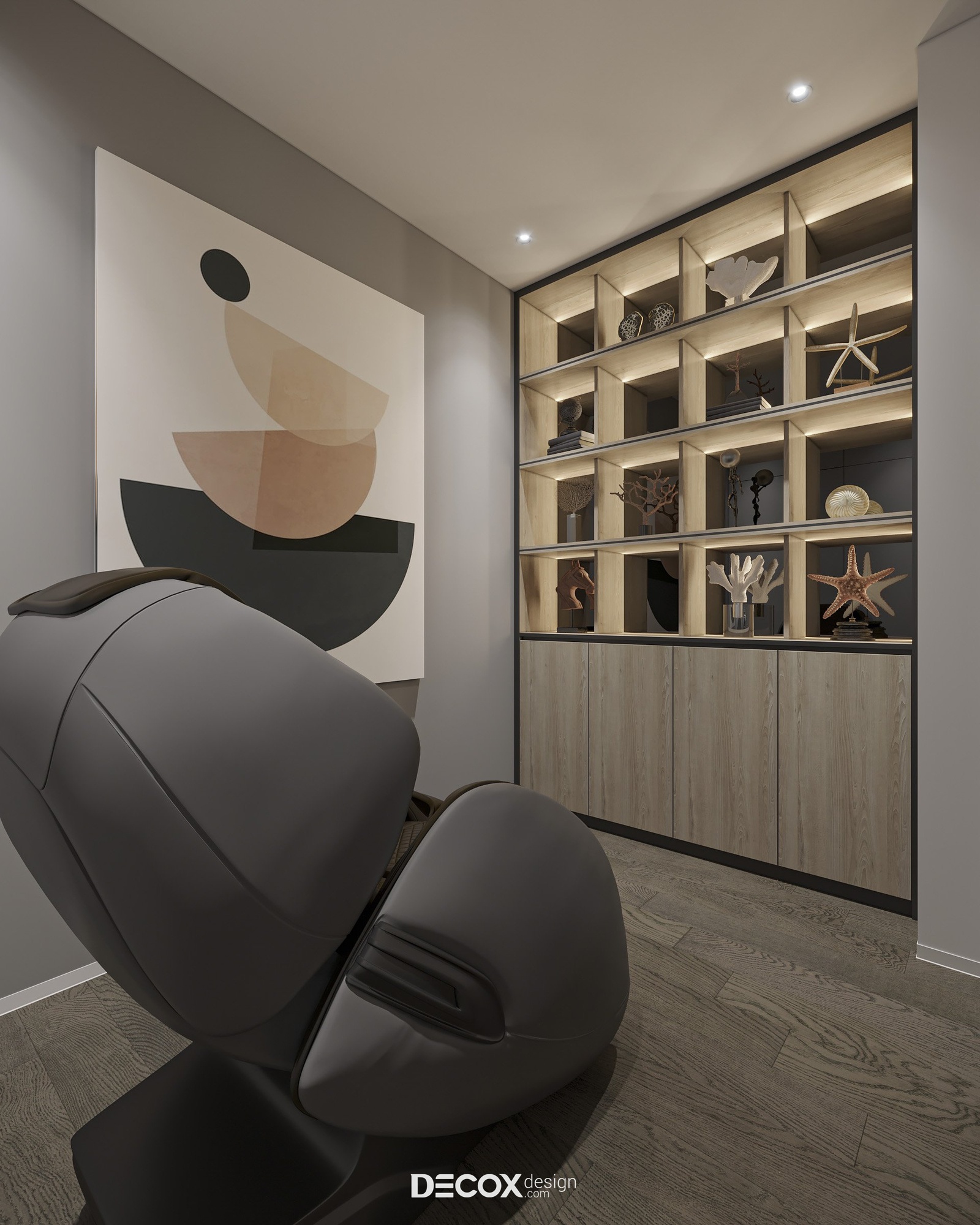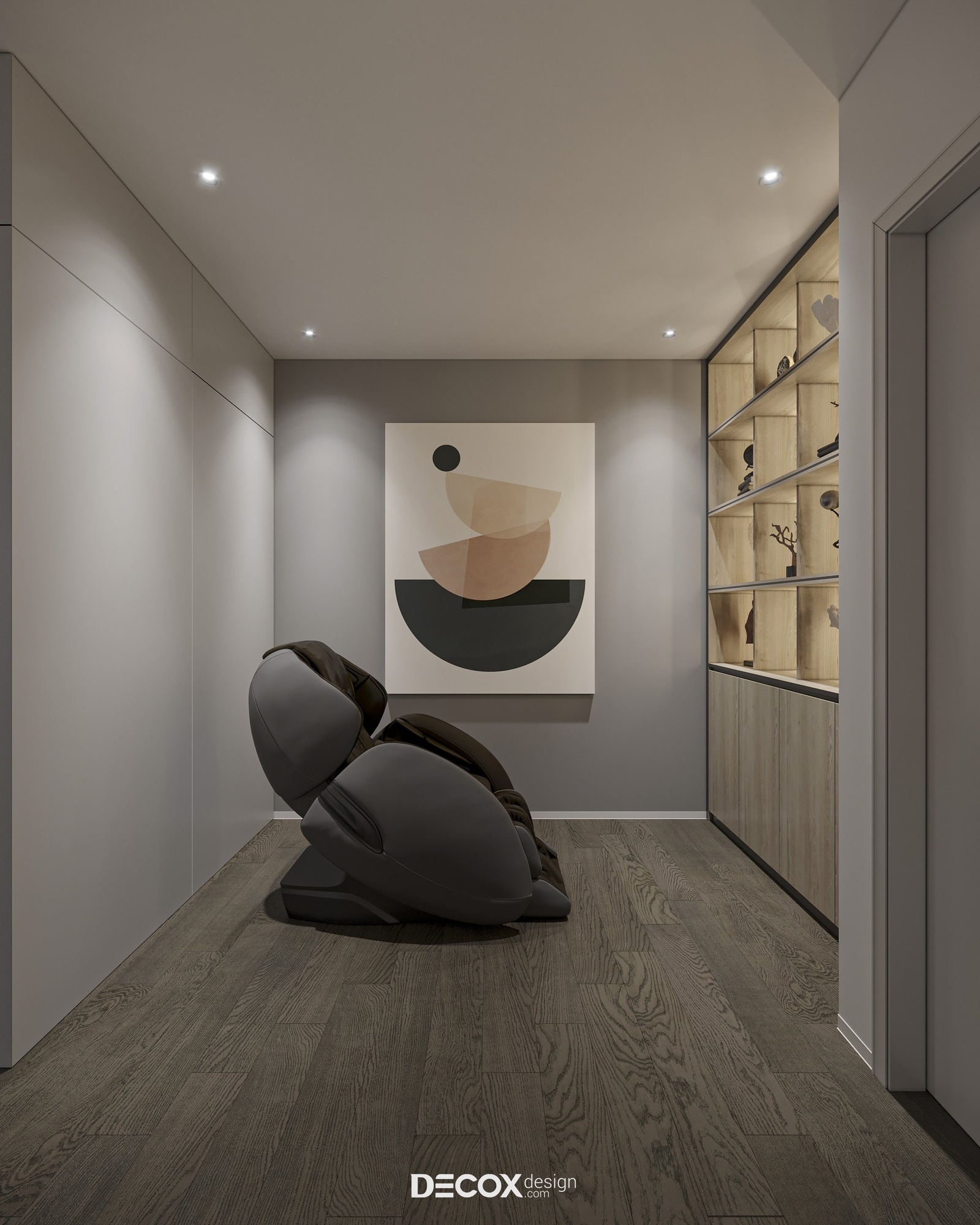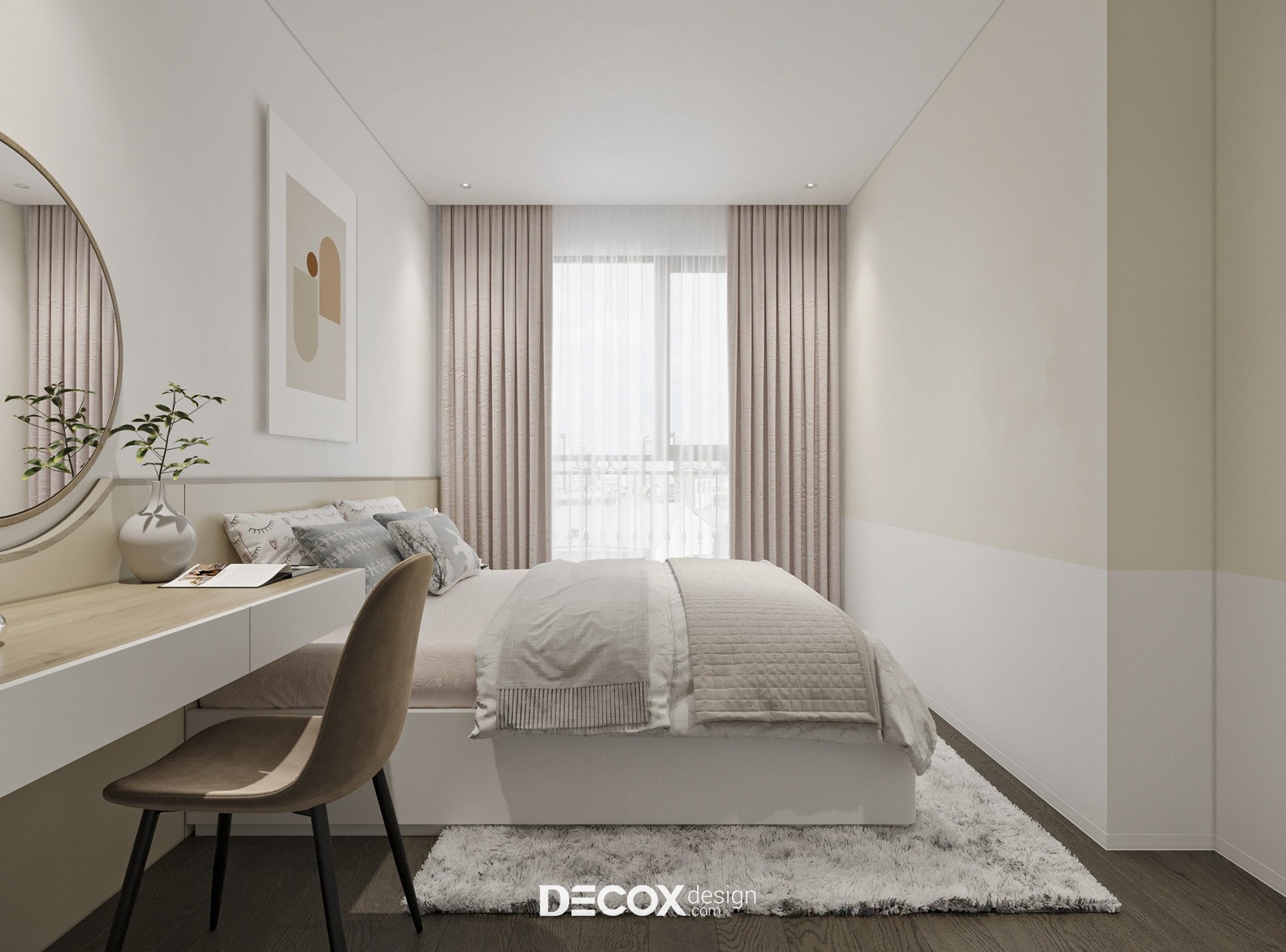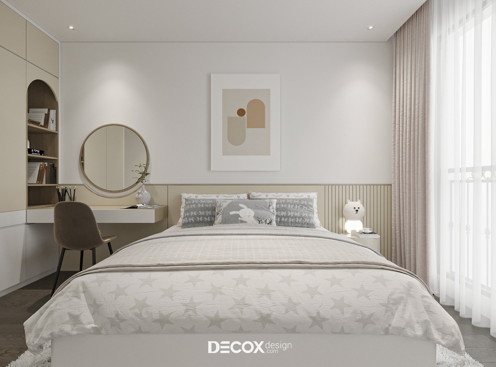 Thiết kế phòng ngủ giữ nguyên tinh thần hiện đại kết hợp cùng cách bố trí nội thất tối giản đem đến một không gian rộng rãi, thoải mái nhưng vẫn đảm bảo đầy đủ công năng cần thiết đáp ứng nhu cầu sử dụng của chủ nhân căn phòng. Tone xám thanh lịch được chọn lựa làm gam màu chủ đạo cho không gian này. Bên cạnh đó, KTS cũng bổ sung thêm chất liệu gỗ cùng ánh sáng tự nhiên thông qua hệ cửa kính lớn để cân bằng không gian, tăng thêm độ ấm cúng và giảm tải sự lạnh lẽo, đơn điệu cho căn phòng.