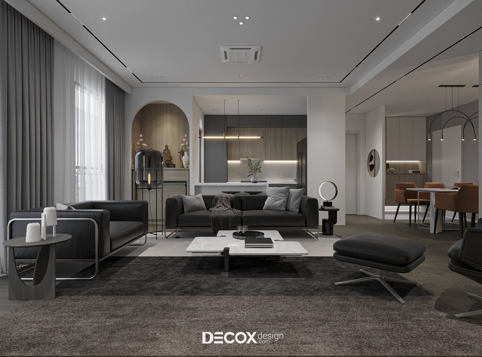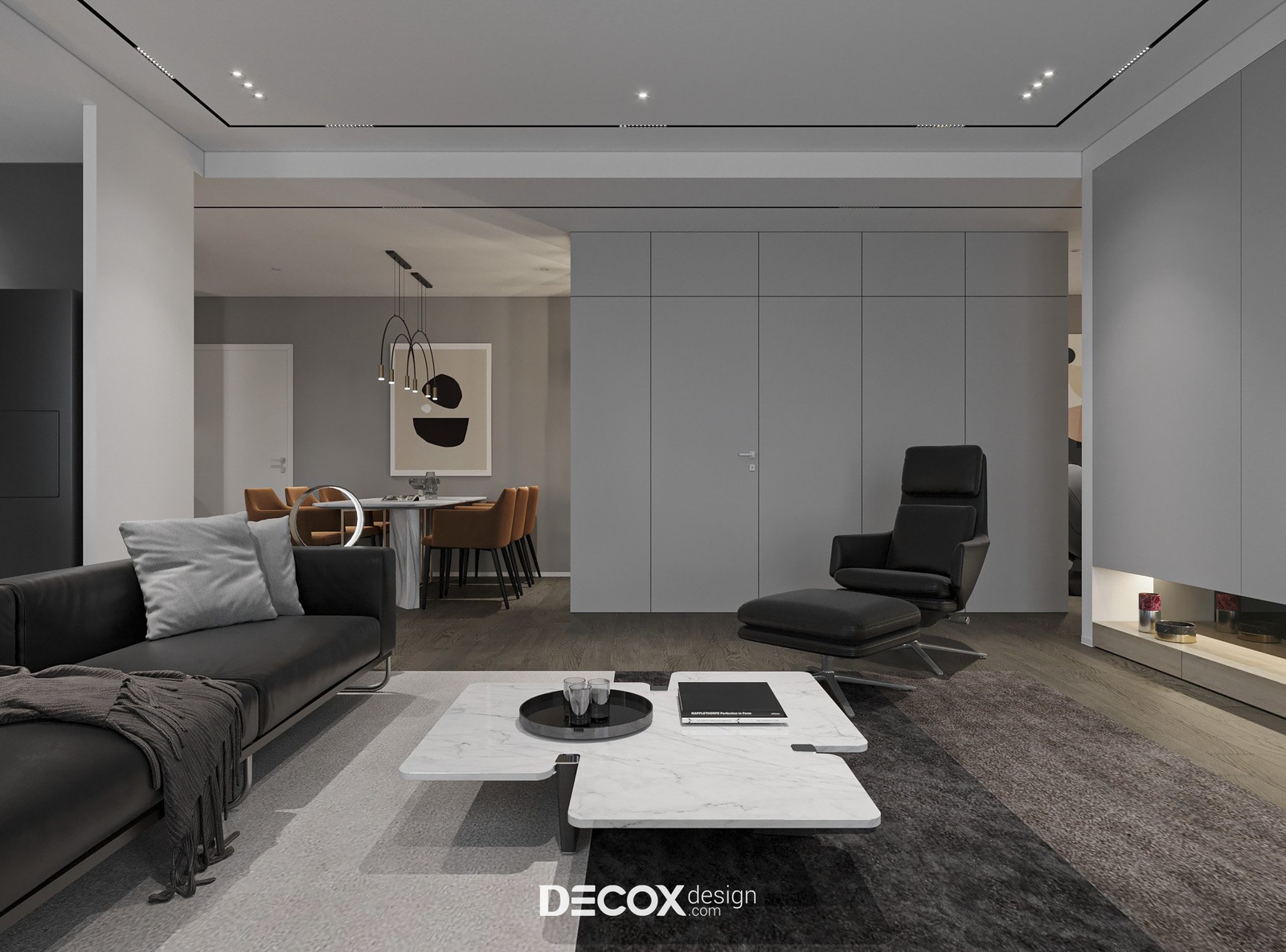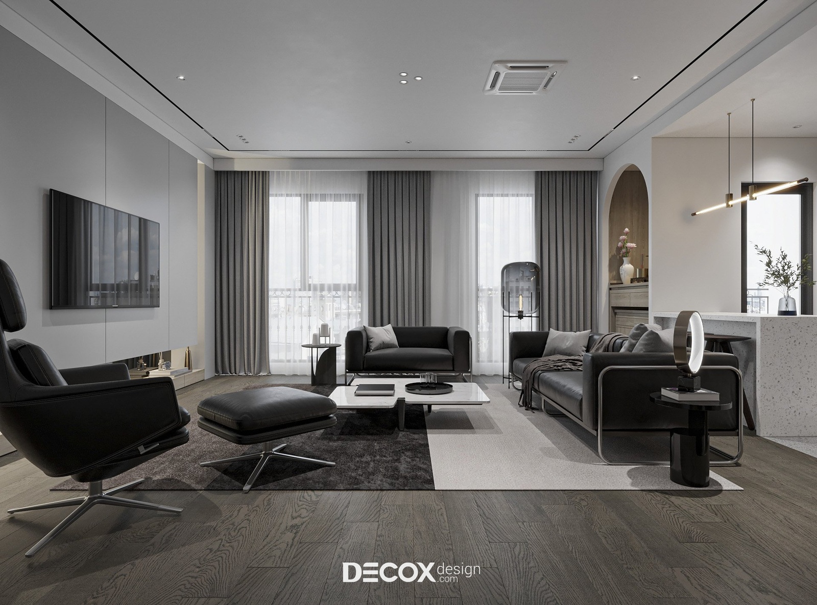 Đến với dự án chung cư The Emerald CT8 Mỹ Đình rộng 124m2, Decox Design đã chọn lựa thiết kế nội thất hướng theo tinh thần hiện đại thời thượng đảm bảo về mặt thẩm mỹ lẫn công năng cho người sử dụng. Về tổng thể, căn hộ gây được ấn tượng mạnh bởi sự khéo léo trong cách phối trộn màu sắc. Sự xuất hiện đồng thời của cặp màu tương phản trắng và đen không chỉ tạo hiệu ứng kích thích thị giác mà còn bổ trợ chặt chẽ, nâng đỡ nhau tỏa sáng trên nền tường xám nền nã. Ngoài ra, cách bố trí nội thất “vừa đủ” giúp không gian không bị trống trải nhưng đồng thời vẫn tạo được sự rộng rãi, thoải mái cho việc di chuyển cũng như sinh hoạt của các thành viên trong gia đình cũng là một điểm sáng trong dự án này.
