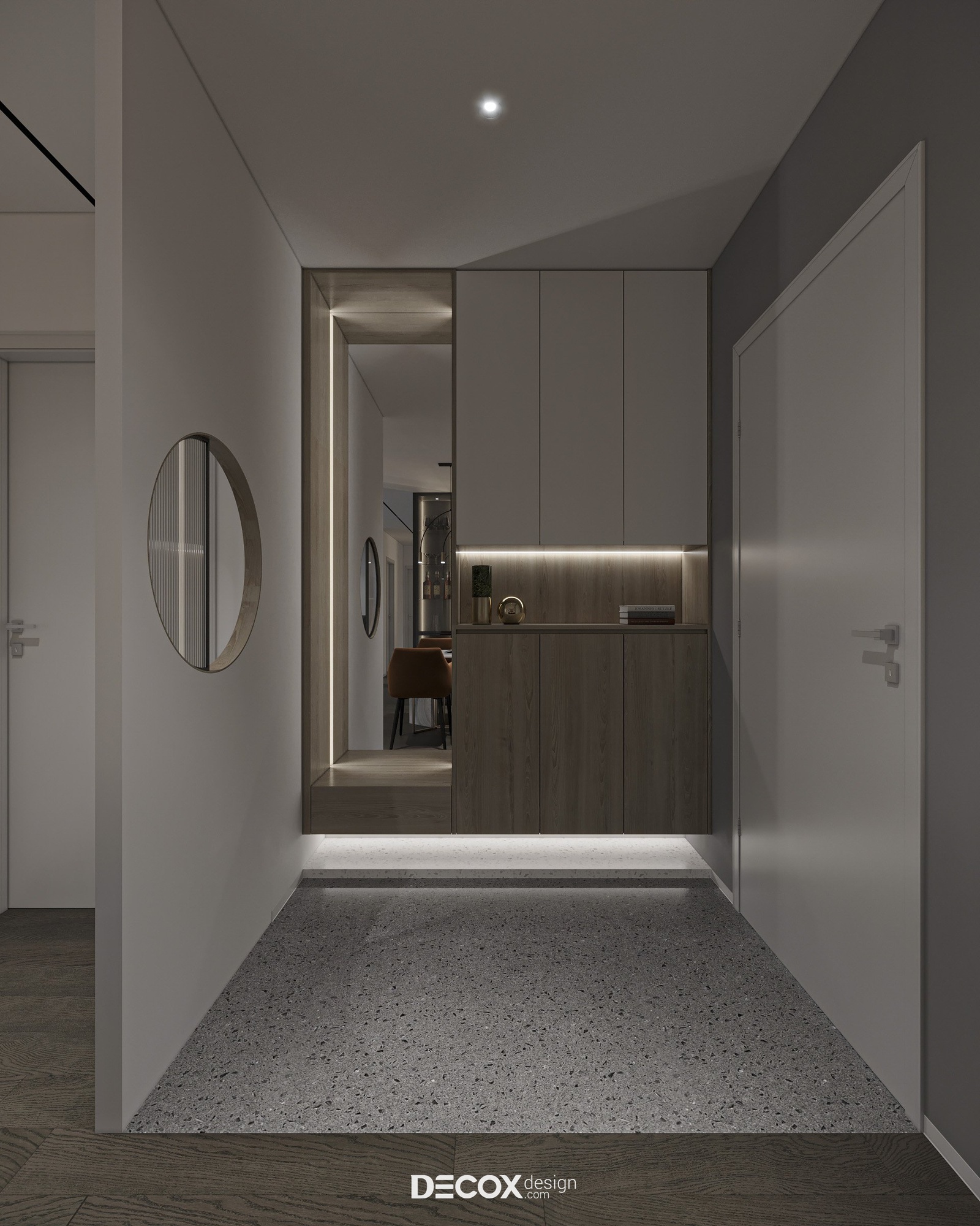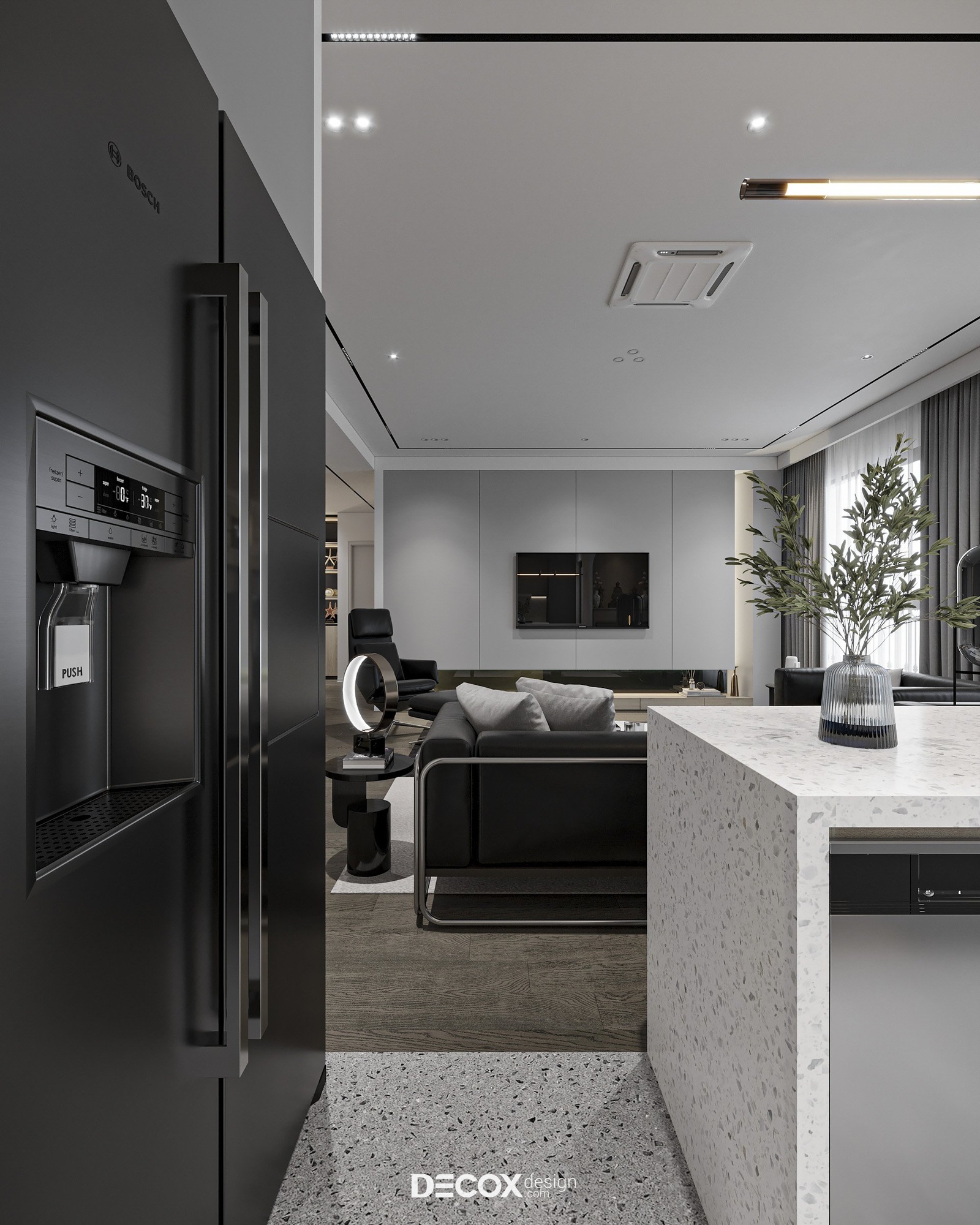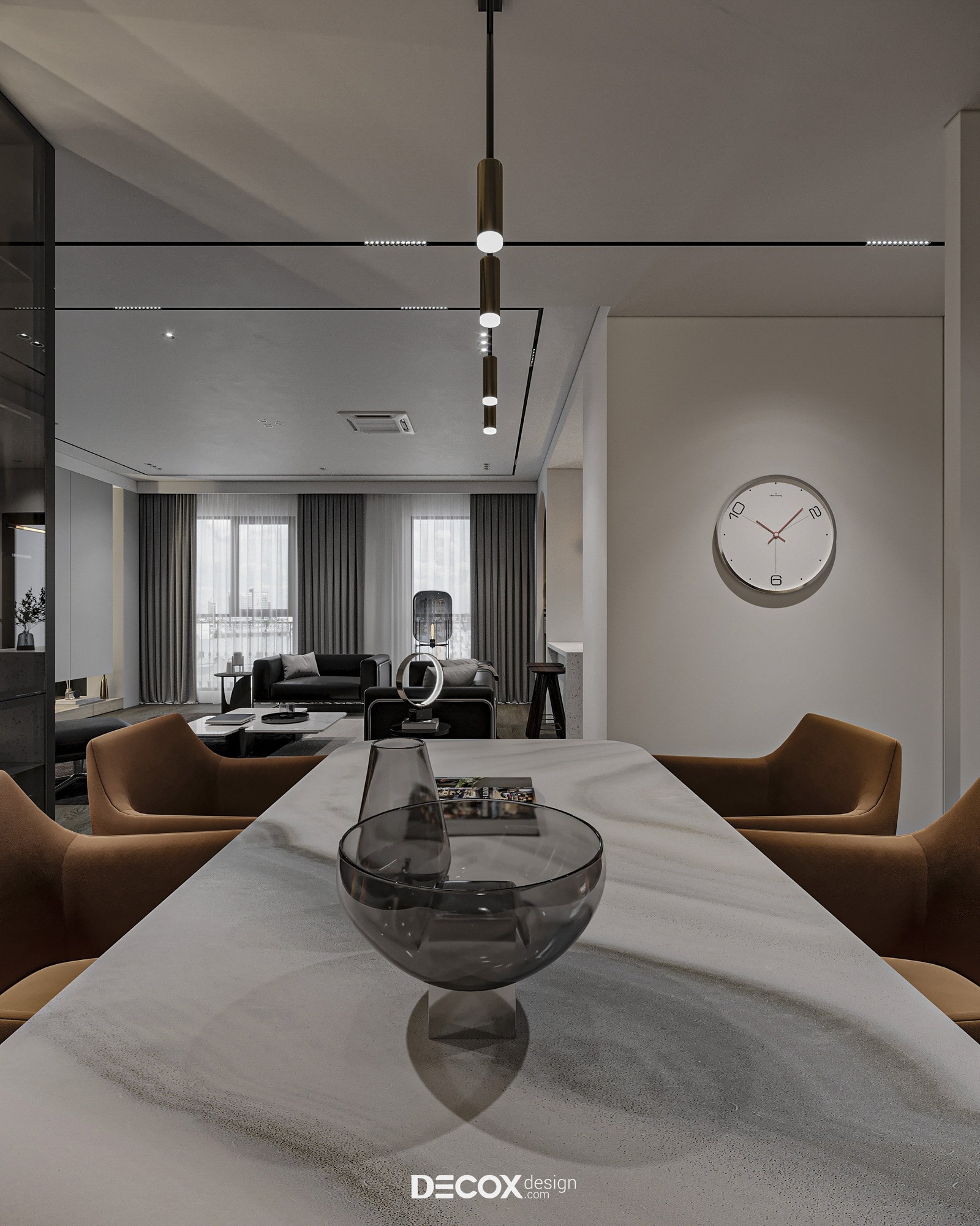 Đến với dự án chung cư The Emerald CT8 Mỹ Đình rộng 124m2, Decox Design đã chọn lựa thiết kế nội thất hướng theo tinh thần hiện đại thời thượng đảm bảo về mặt thẩm mỹ lẫn công năng cho người sử dụng. Về tổng thể, căn hộ gây được ấn tượng mạnh bởi sự khéo léo trong cách phối trộn màu sắc. Sự xuất hiện đồng thời của cặp màu tương phản trắng và đen không chỉ tạo hiệu ứng kích thích thị giác mà còn bổ trợ chặt chẽ, nâng đỡ nhau tỏa sáng trên nền tường xám nền nã. Ngoài ra, cách bố trí nội thất “vừa đủ” giúp không gian không bị trống trải nhưng đồng thời vẫn tạo được sự rộng rãi, thoải mái cho việc di chuyển cũng như sinh hoạt của các thành viên trong gia đình cũng là một điểm sáng trong dự án này.