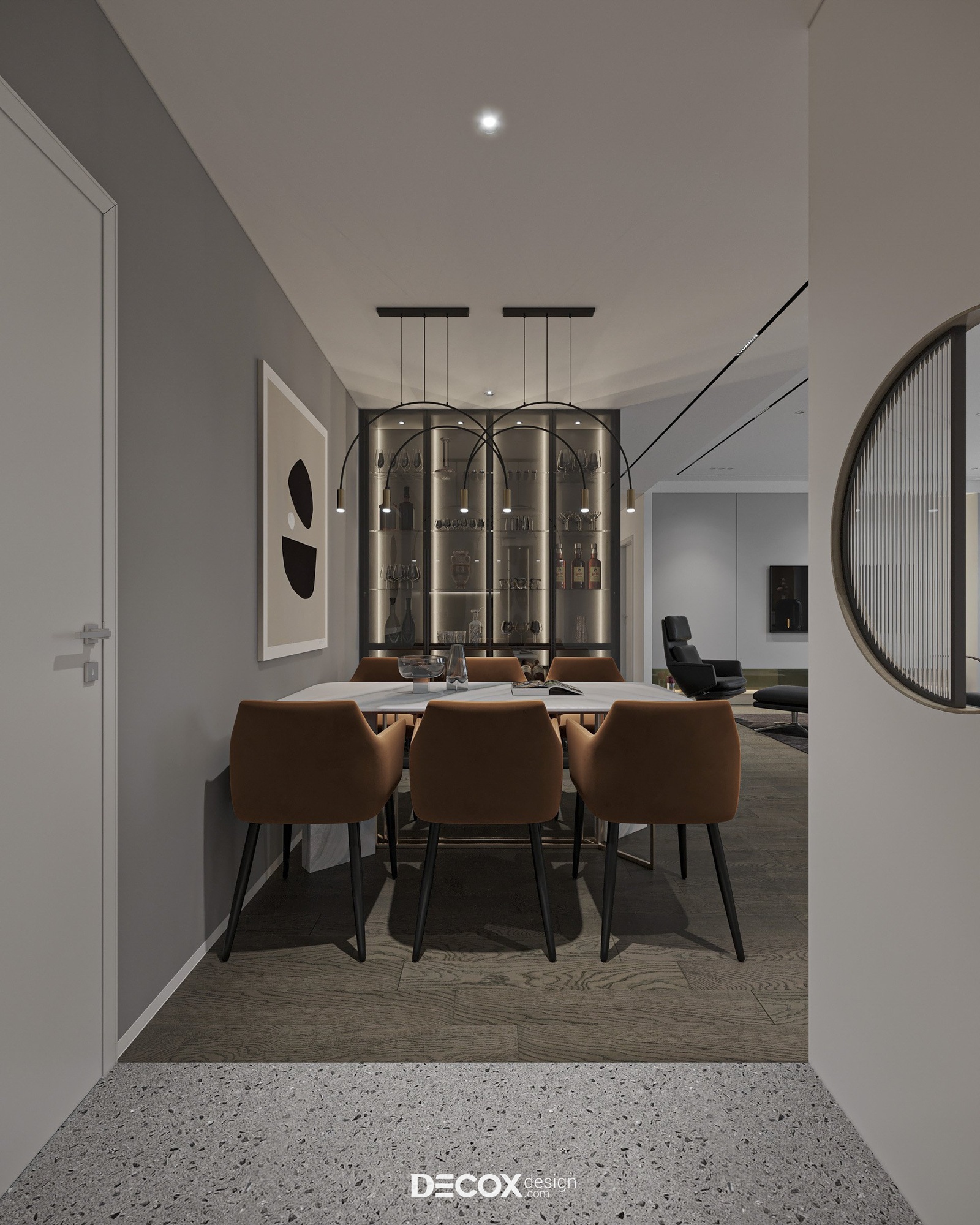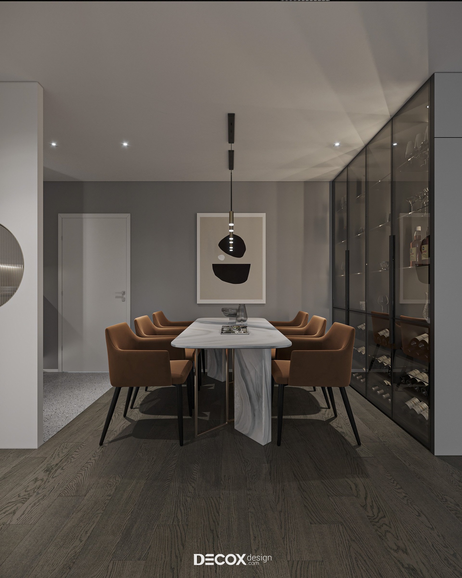 Bàn ăn chất liệu mặt đá marble trắng kết hợp cùng ghế ăn chất liệu da cao cấp nổi bật trên nền tường xám thanh lịch. Ngoài đèn thả trần cùng tranh treo tường trang trí nhấn điểm không gian thì tủ rượu kính sang trọng cũng là một trong những chi tiết giúp thăng hạng thẩm mỹ khu vực phòng ăn.
