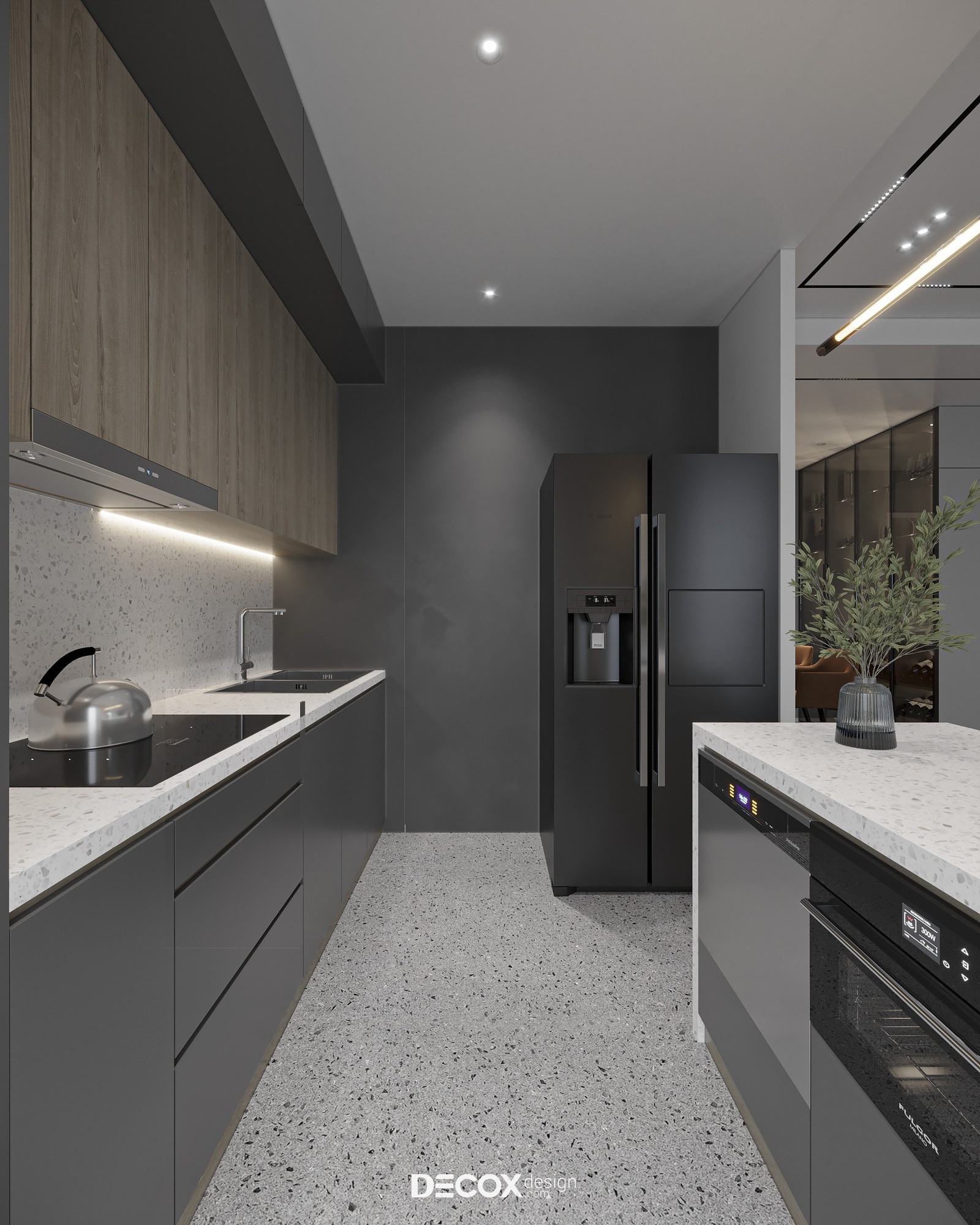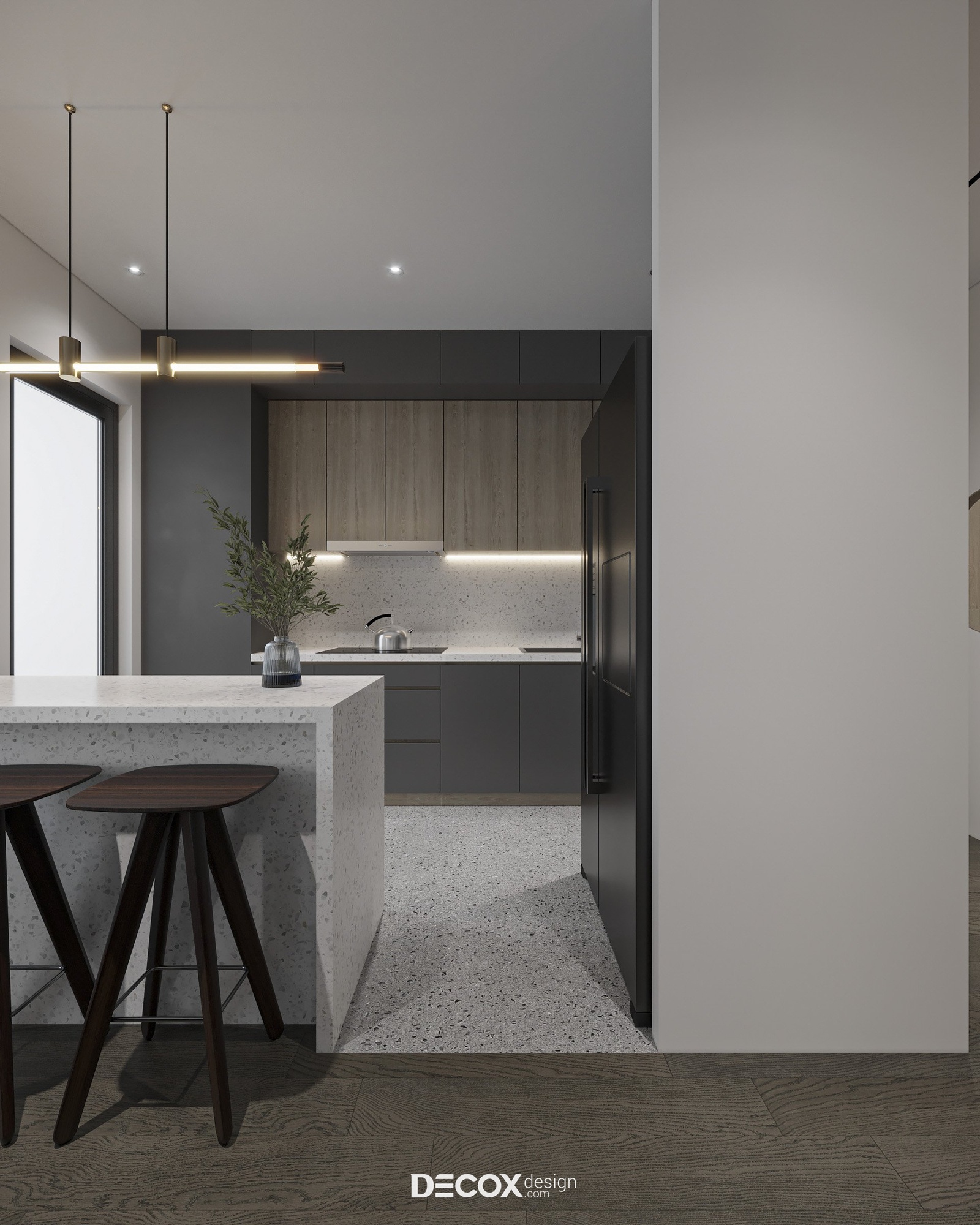 Thiết kế mở giữa khu vực khách - bếp và phòng ăn góp phần giúp không gian thêm phần rộng mở, thoáng đãng. Khu bếp được bố trí theo dạng chữ I đơn giản tích hợp đồng thời cả hệ tủ bếp trên và dưới giúp tối ưu không gian lưu trữ. Bàn đảo bếp có chức năng như một quầy bar mini được đặt song song bếp vừa tô điểm cho không gian vừa có tác dụng phân định công năng hai khu vực phòng khách và phòng bếp.