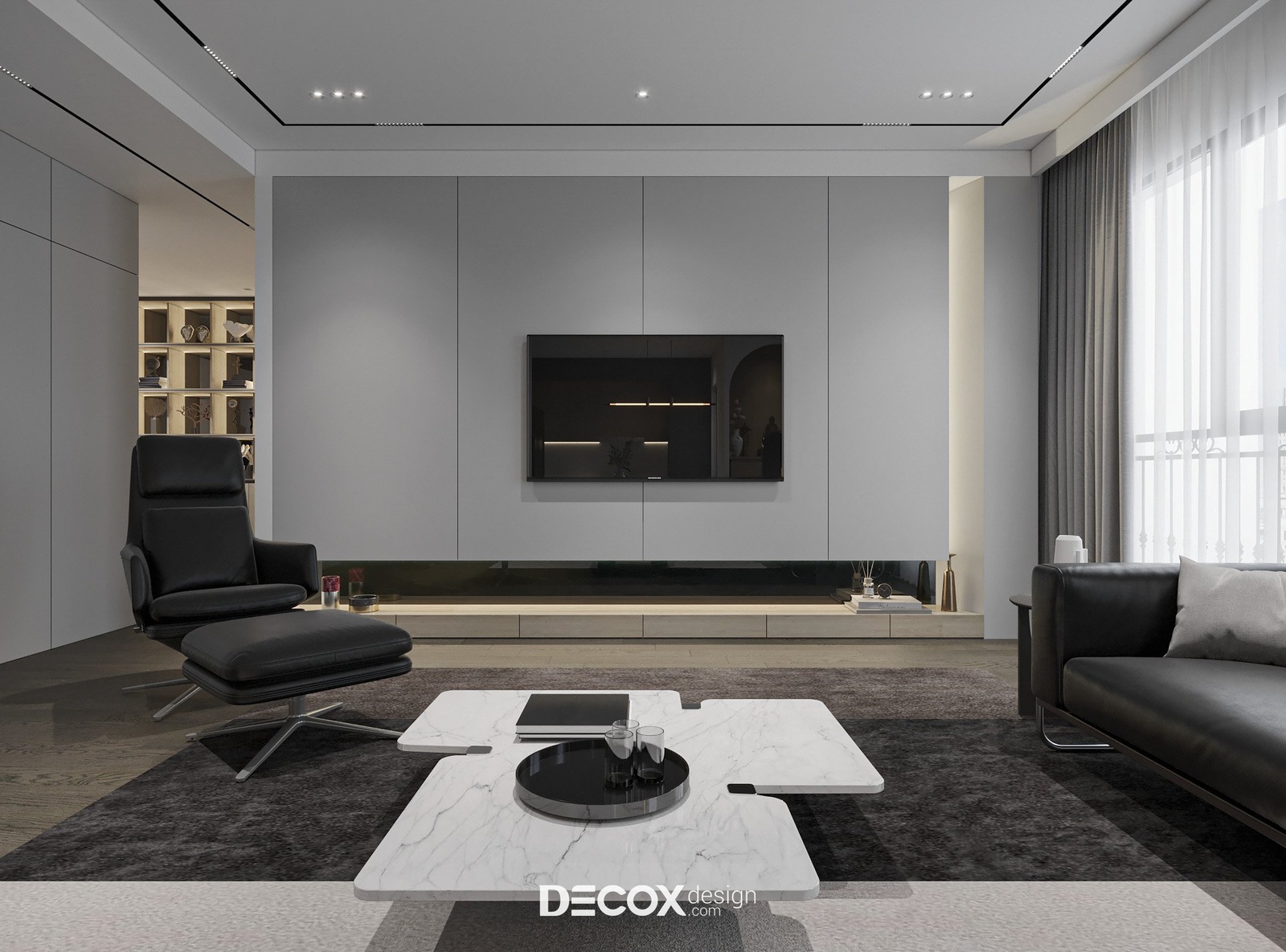 Những đặc trưng của phong cách hiện đại đã được phô diễn rõ nét thông qua những đường nét thẳng tắp, bày trí nội thất tinh gọn cũng như cách ứng dụng màu sắc trong không gian. Nội thất sử dụng trong phòng khách mang kiểu dáng đơn giản, đề cao tính công năng. Ở đây, KTS đã sắp xếp hai bộ ghế sofa đơn đồng kiểu dáng theo dạng chữ L kết hợp cùng một chiếc ghế armchair đồng màu và một bàn sofa mặt đá marble trắng sang trọng. Hai tone màu trắng - đen được ứng dụng trên đồ nội thất khi kết hợp cùng nhau không chỉ đem đến một tổng thể hút mắt mà còn tô điểm nét đẹp thanh lịch, cá tính rất riêng.