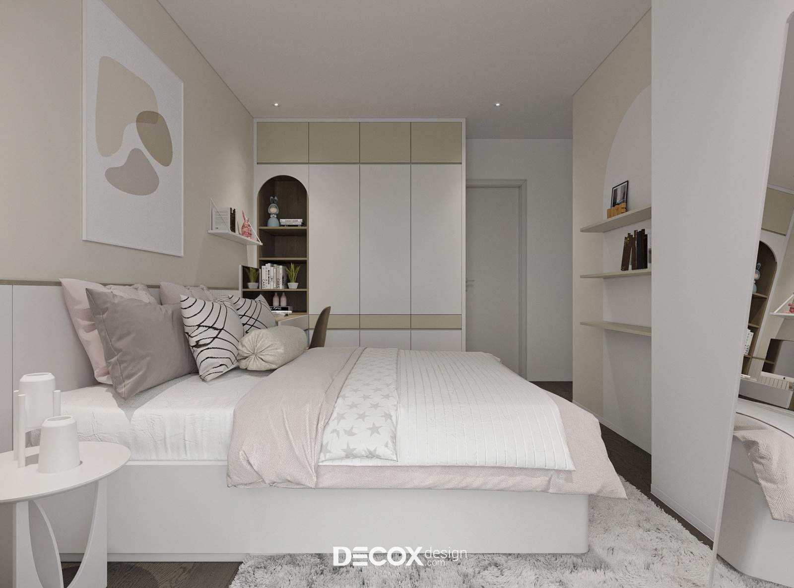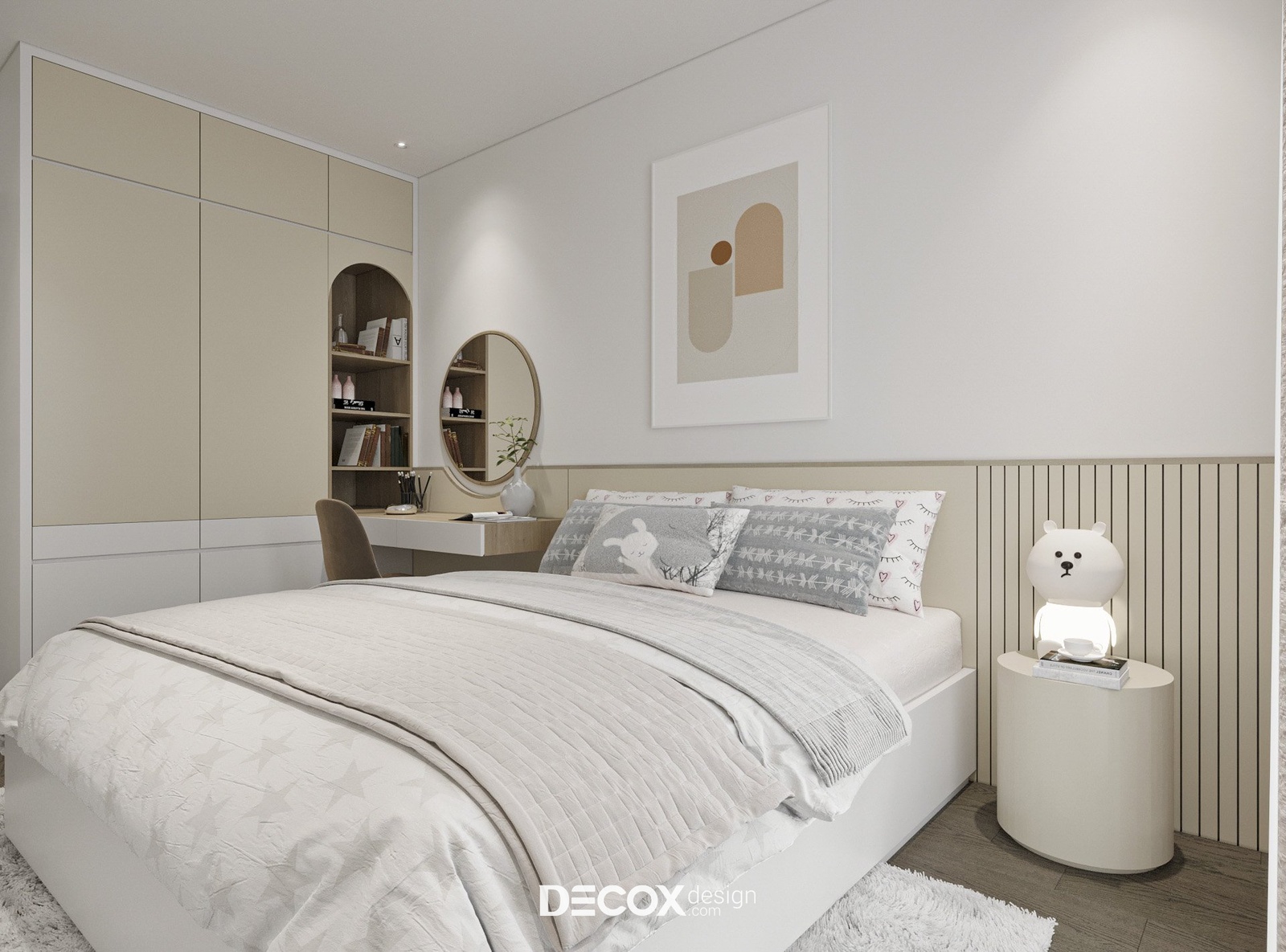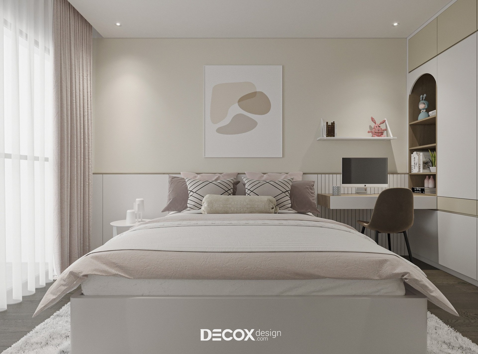 Tuy bố cục màu sắc cũng như nội thất vô cùng đơn giản nhưng phòng ngủ vẫn không mất đi vẻ đẹp nhẹ nhàng, dễ thương thích hợp với những bé gái trong mọi độ tuổi. Ngoài tone trắng - be chủ đạo, KTS cũng bổ sung thêm tone hồng pastel ngọt ngào và chất liệu gỗ để tăng thêm sự ấm cúng cho không gian.