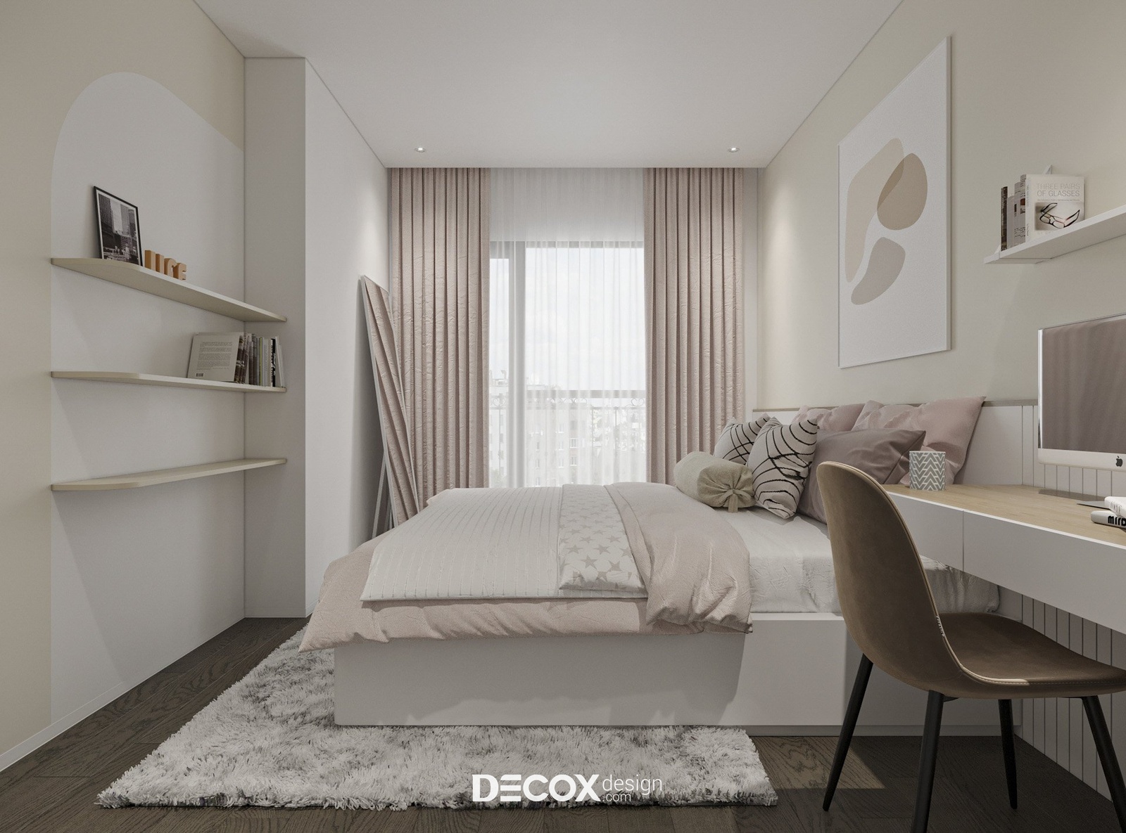 Trái ngược với những khu vực khác, không gian phòng ngủ này lại mang đến hương vị của sự trẻ trung, sinh động nhờ sự kết hợp giữa tone trắng tinh tế và tone màu pastel nhẹ nhàng. Do diện tích phòng có phần khiêm tốn, do đó việc bố trí nội thất cũng được KTS cân nhắc kỹ lưỡng. Nội thất đa chức năng, kiểu dáng nhỏ gọn cùng kệ treo tường đơn giản chính là giải pháp hợp lý để tối ưu hóa không gian.