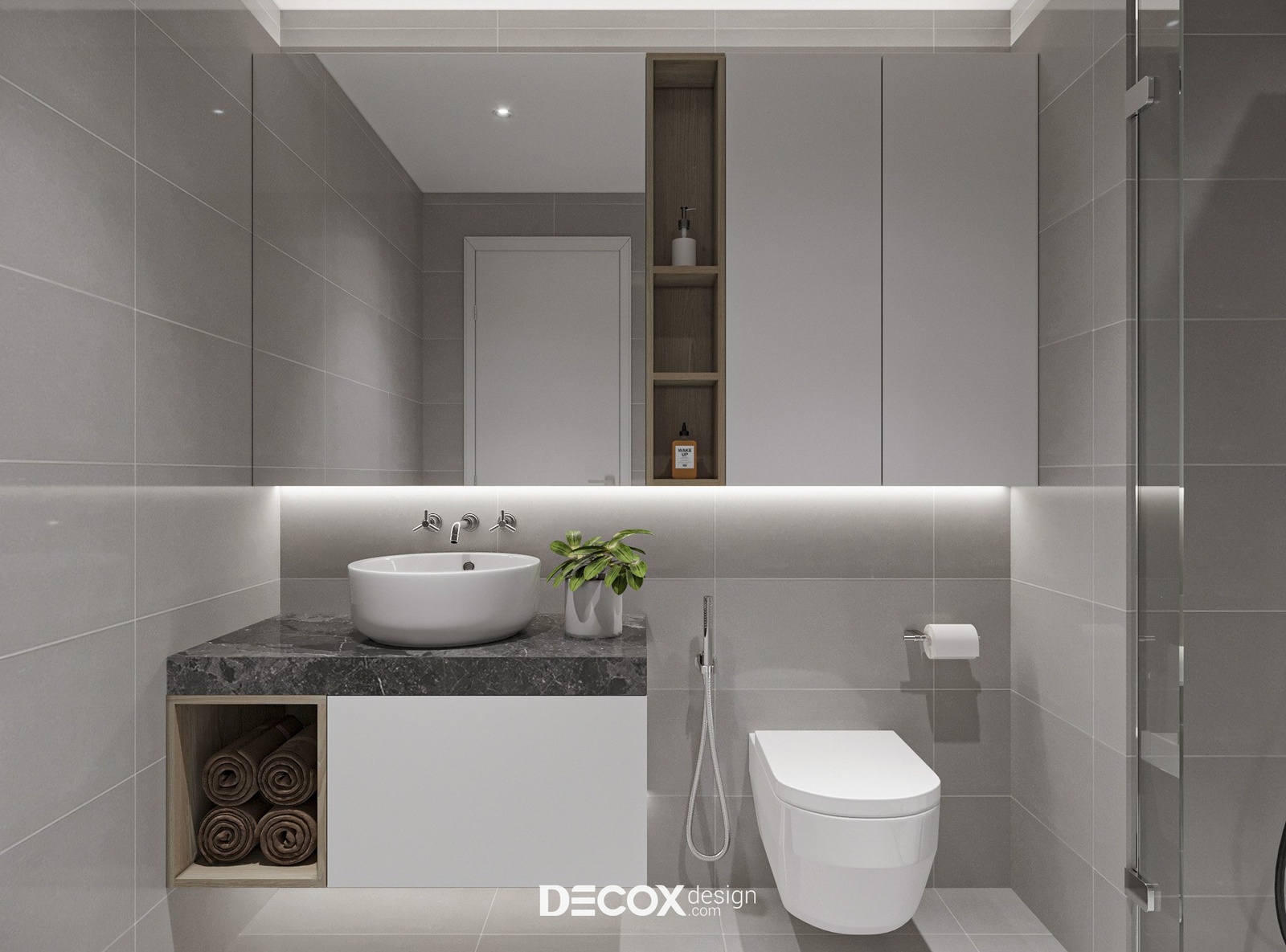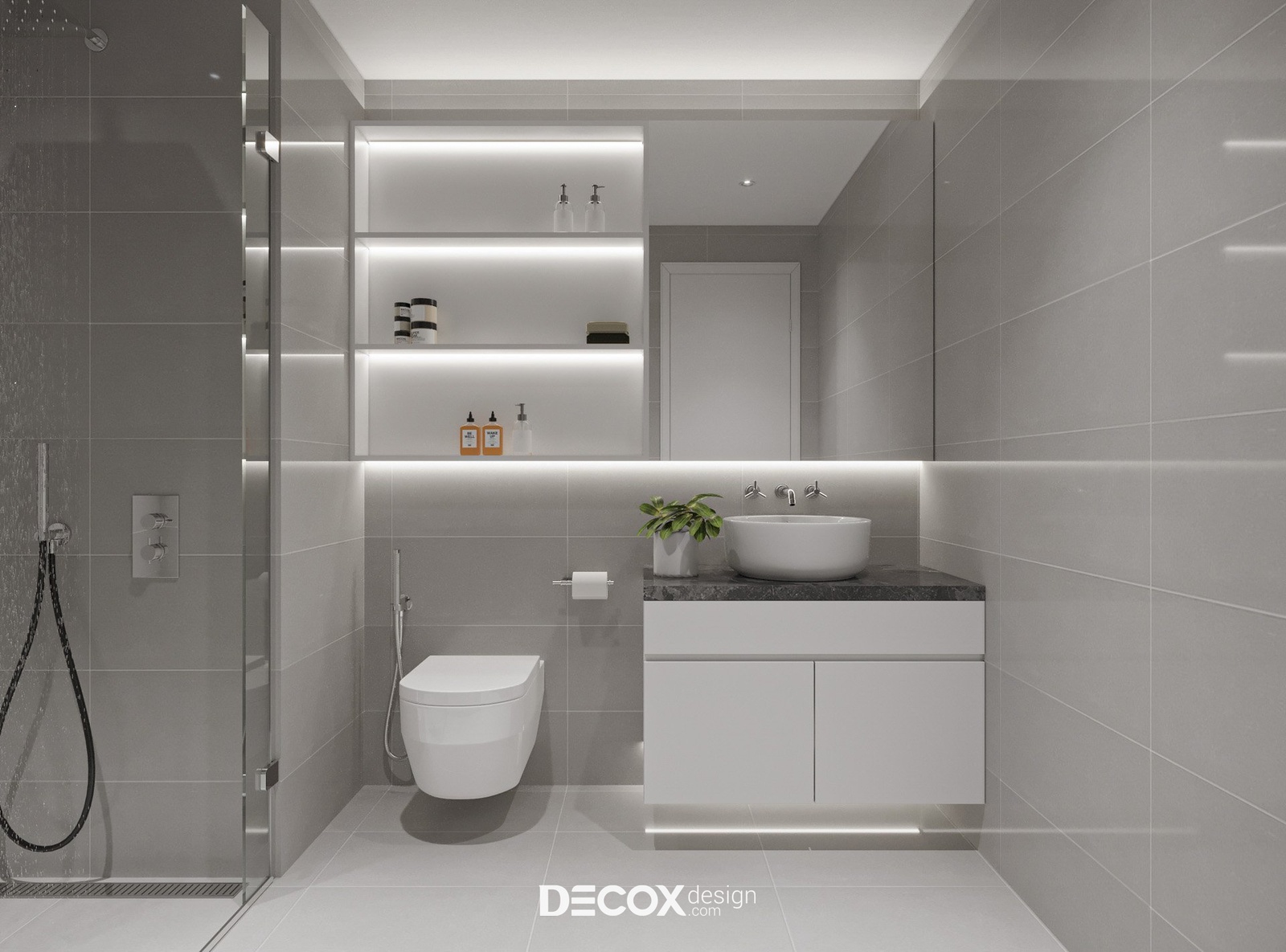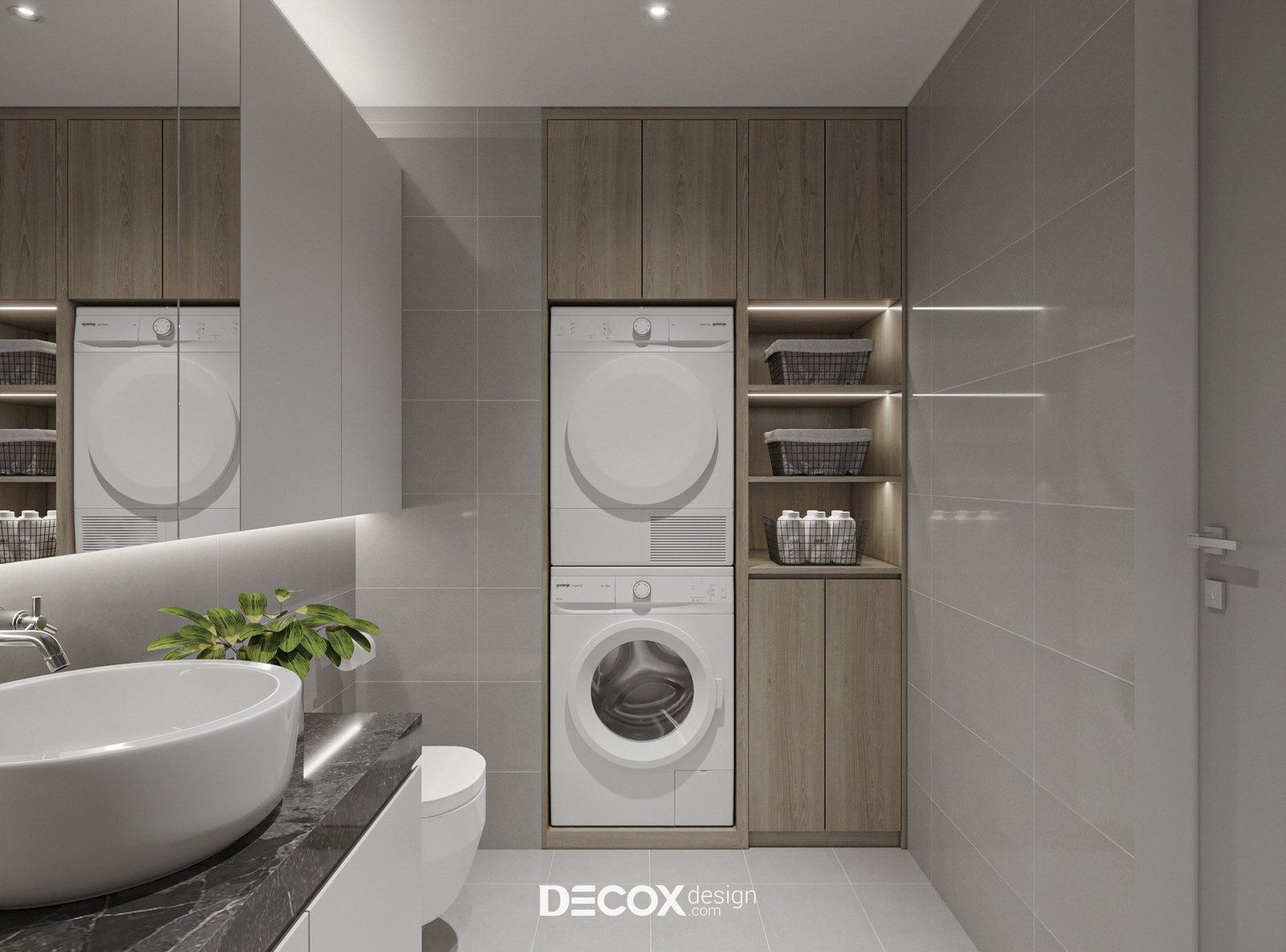 Tương tự như những không gian khác trong nhà, khu vực WC vẫn dùng tone xám chủ đạo để tạo sự đồng bộ, kết nối. Thiết kế WC được chia thành hai phân khu khô - ướt rõ rệt để đảm bảo tính tiện nghi trong sinh hoạt. Ngoài ra, với khu vực WC dùng chung, KTS cũng khéo léo bố trí thêm kệ tủ tích hợp máy giặt và máy sấy để tận dụng khoảng trống cũng như tăng tính thẩm mỹ cho căn nhà.