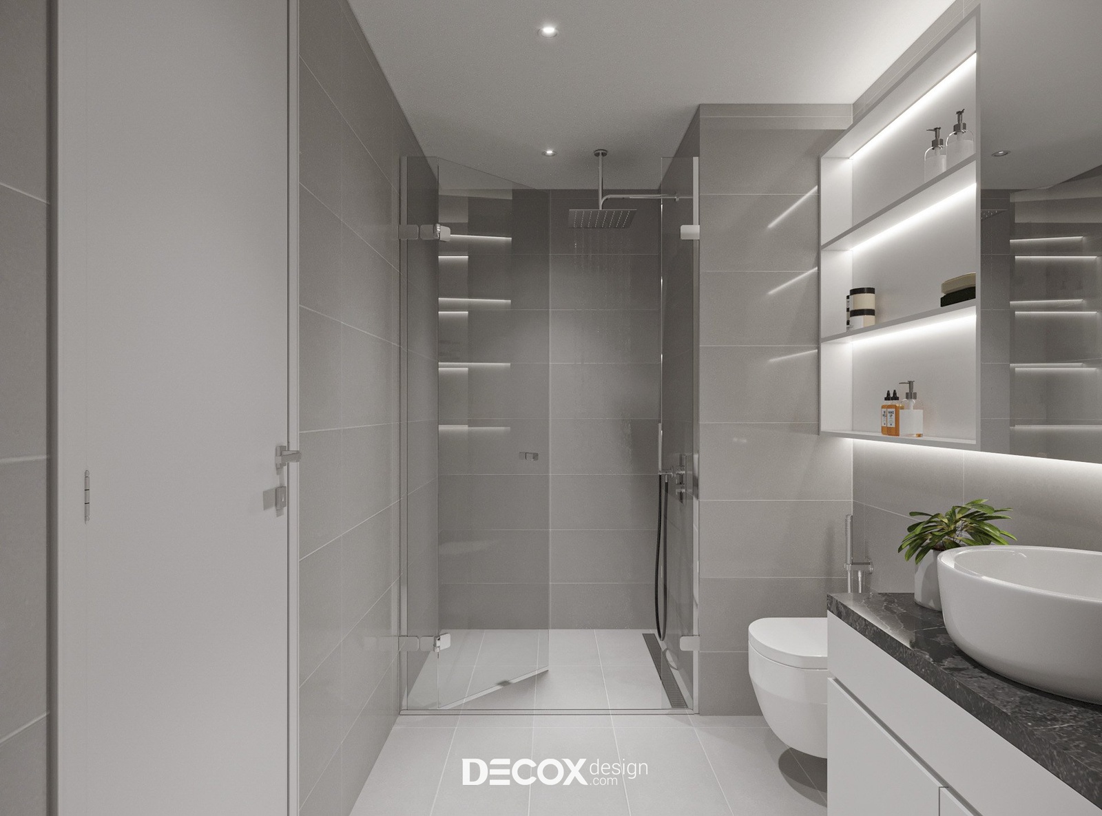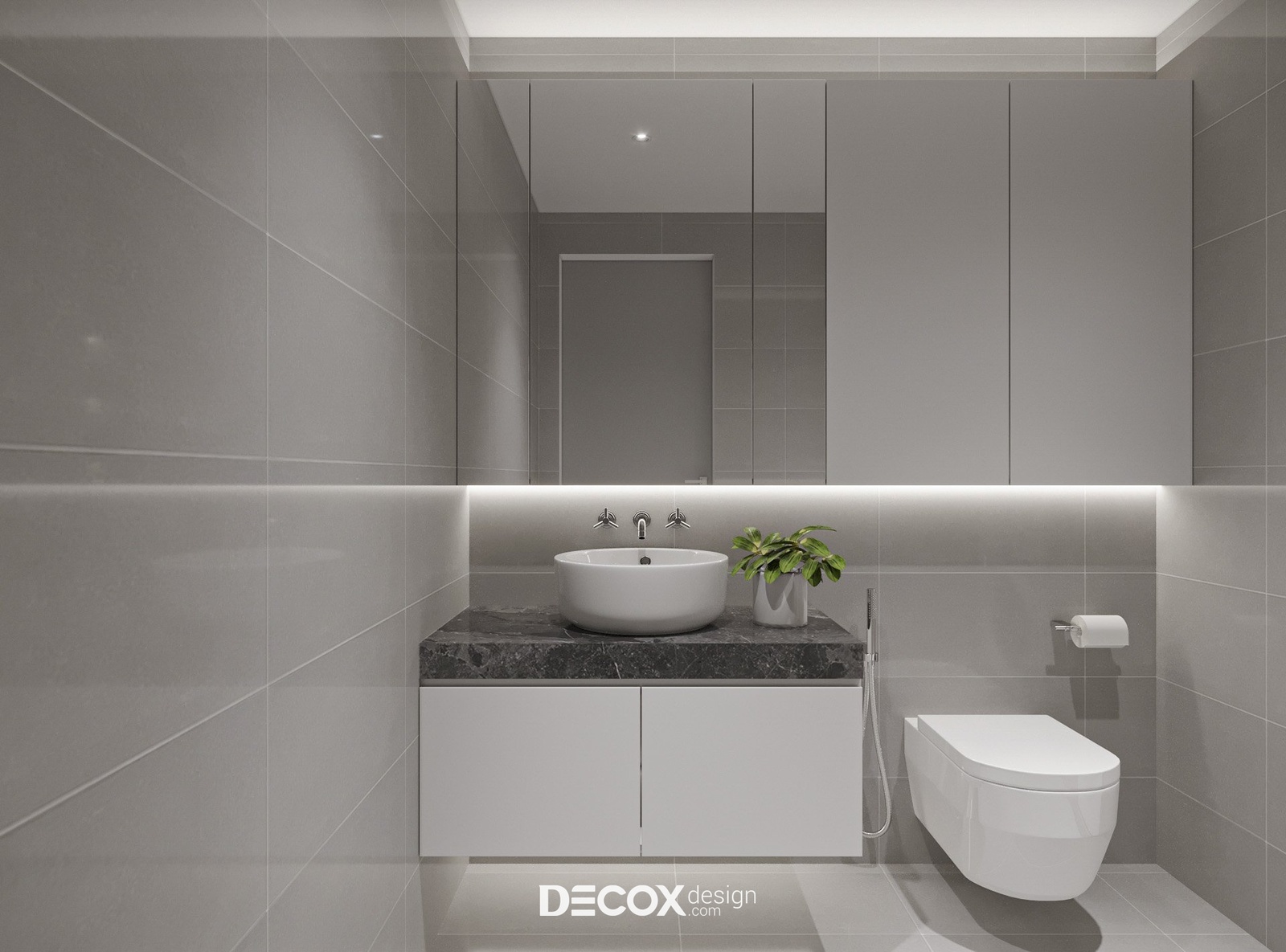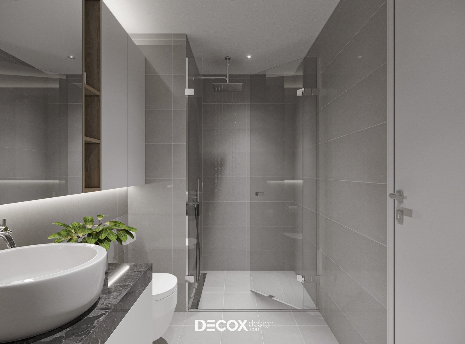 Tương tự như những không gian khác trong nhà, khu vực WC vẫn dùng tone xám chủ đạo để tạo sự đồng bộ, kết nối. Thiết kế WC được chia thành hai phân khu khô - ướt rõ rệt để đảm bảo tính tiện nghi trong sinh hoạt. Ngoài ra, với khu vực WC dùng chung, KTS cũng khéo léo bố trí thêm kệ tủ tích hợp máy giặt và máy sấy để tận dụng khoảng trống cũng như tăng tính thẩm mỹ cho căn nhà.