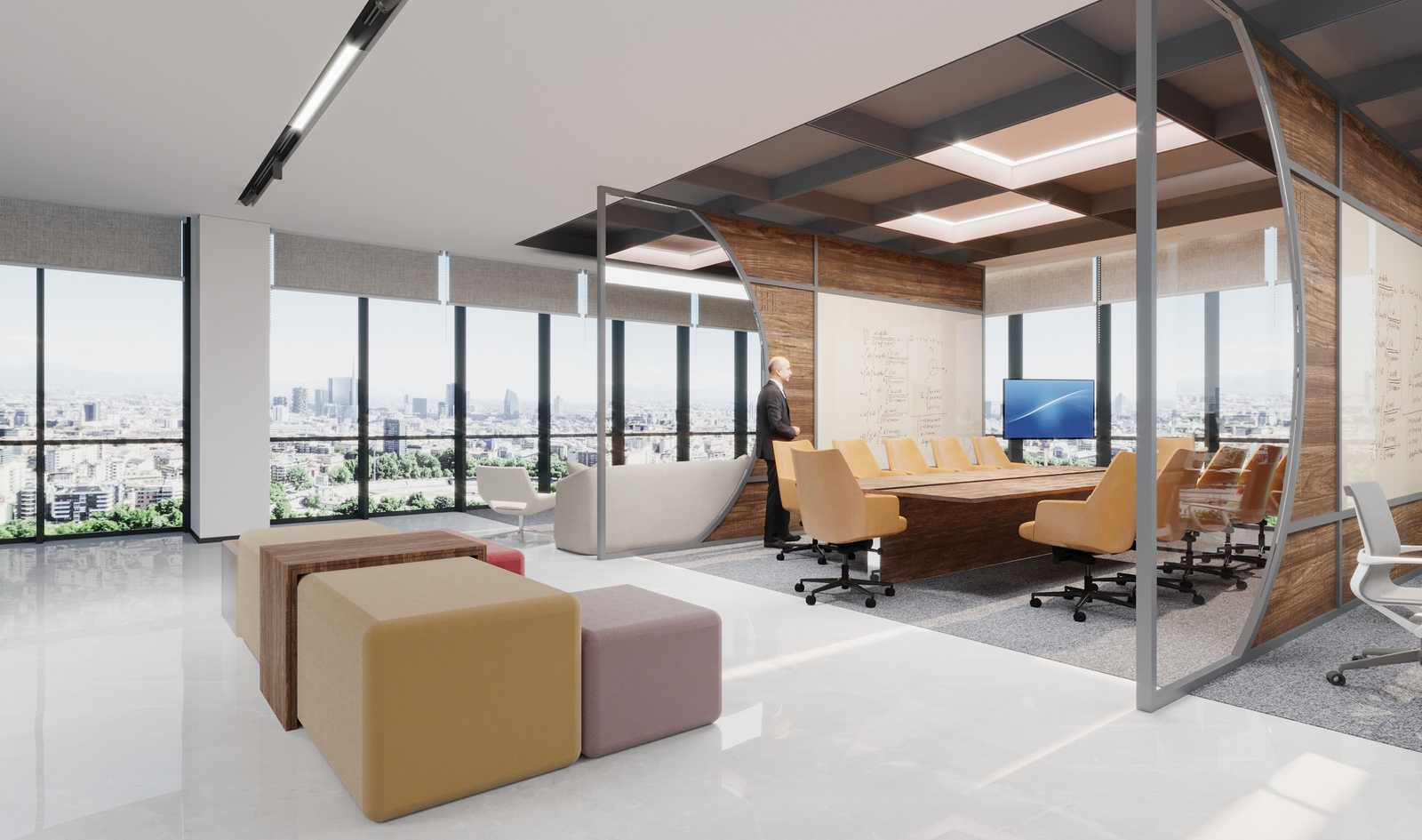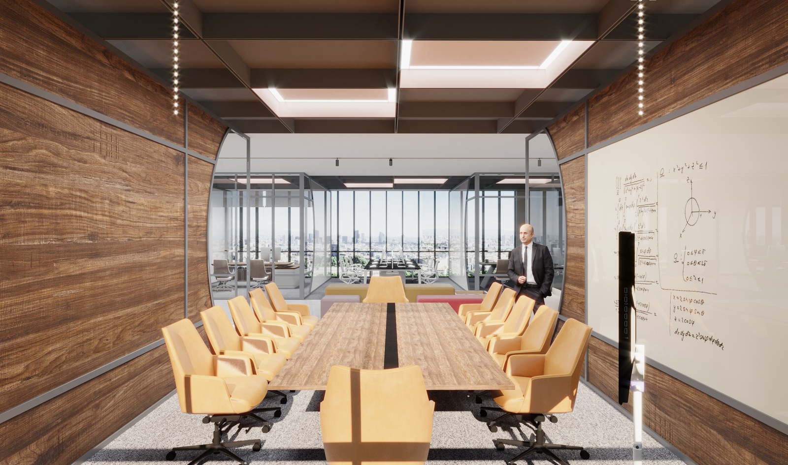 Thiết kế phòng họp mang đến sự khác biệt so với mặt bằng chung của tổng thể. Với màu sắc trầm ấm đến từ chất liệu gỗ chủ đạo, phòng mang đến cảm giác ấm cúng, thư giãn, đồng thời làm tăng tính sang trọng. Đây được xem là một điểm nhấn khác biệt trong toàn văn phòng.
