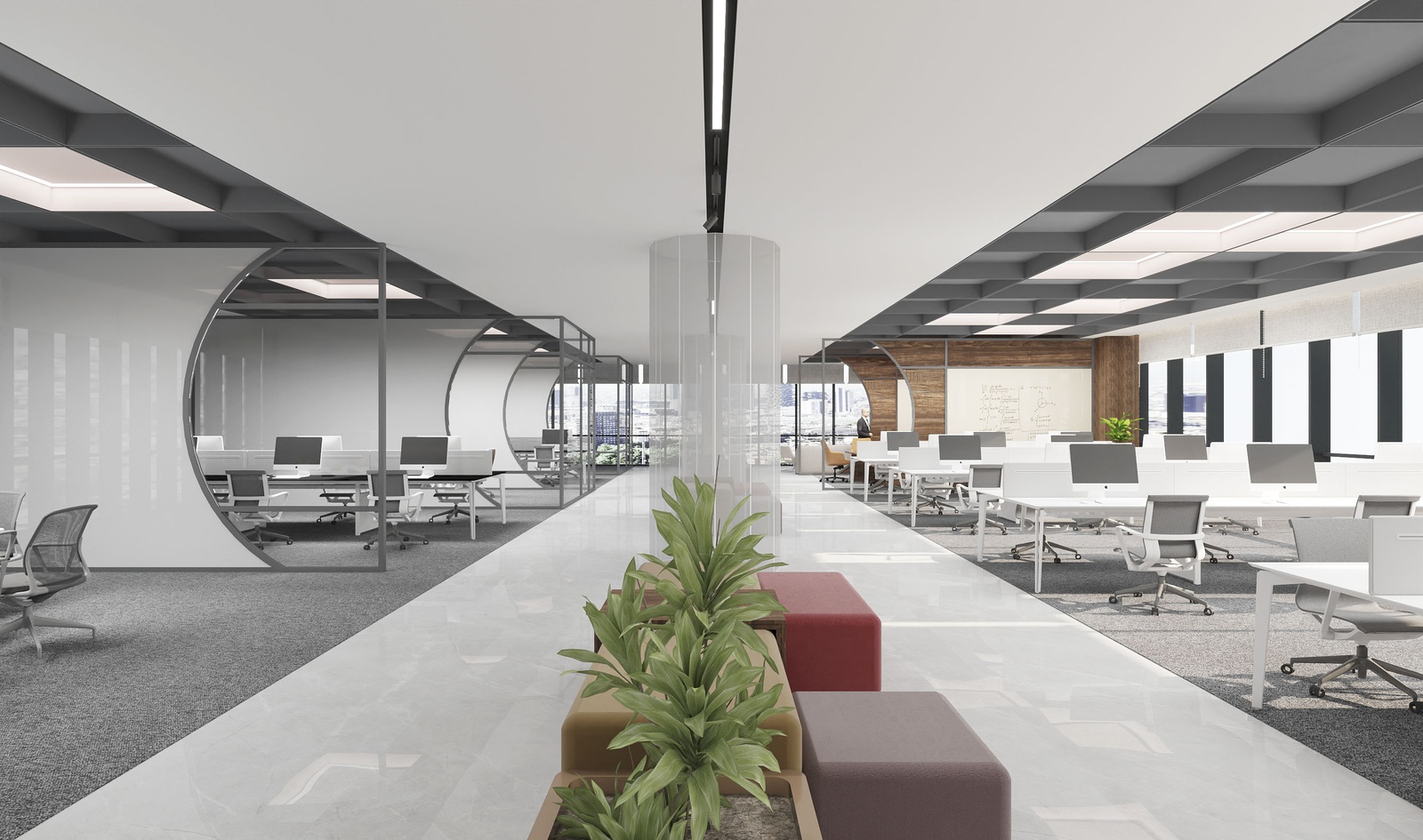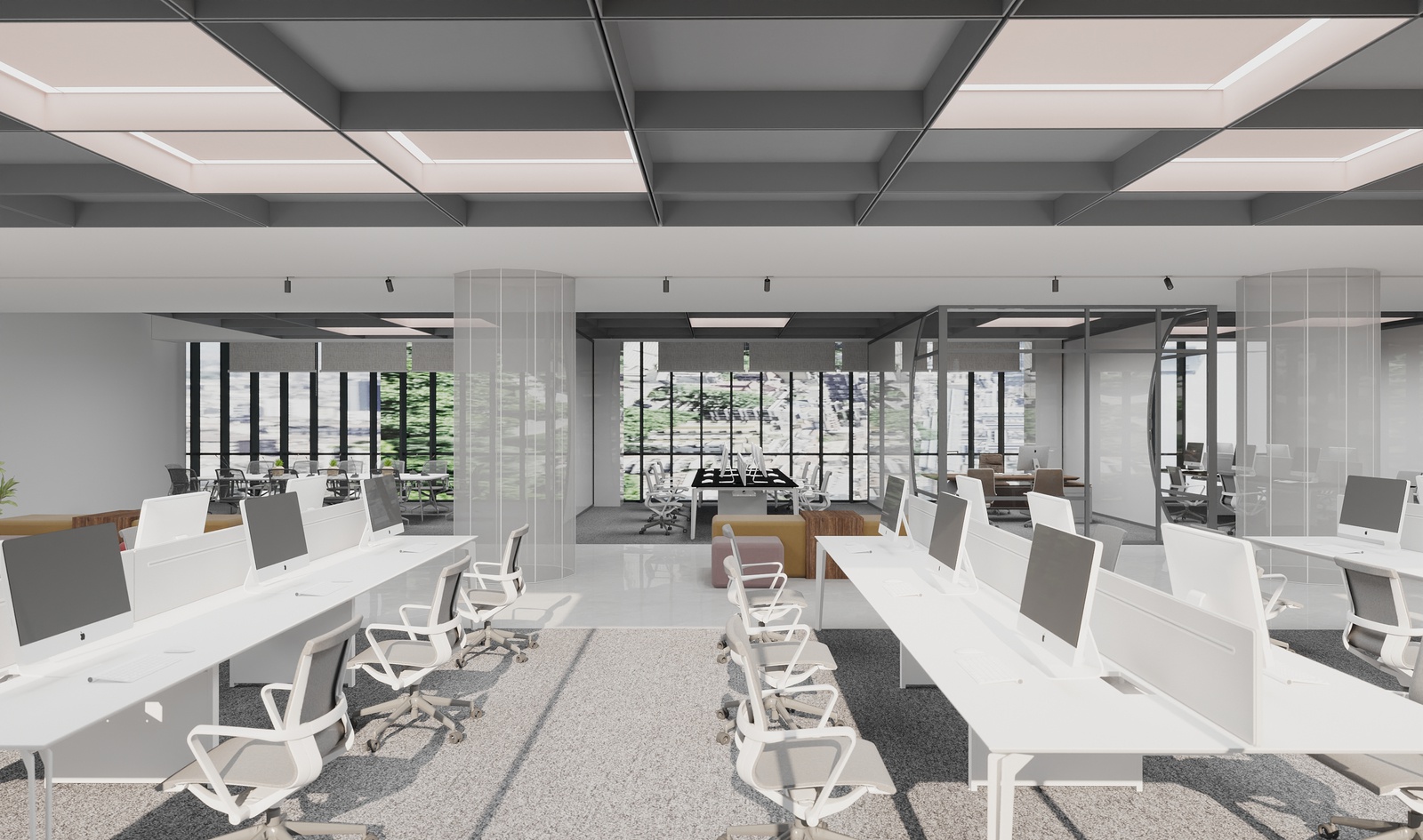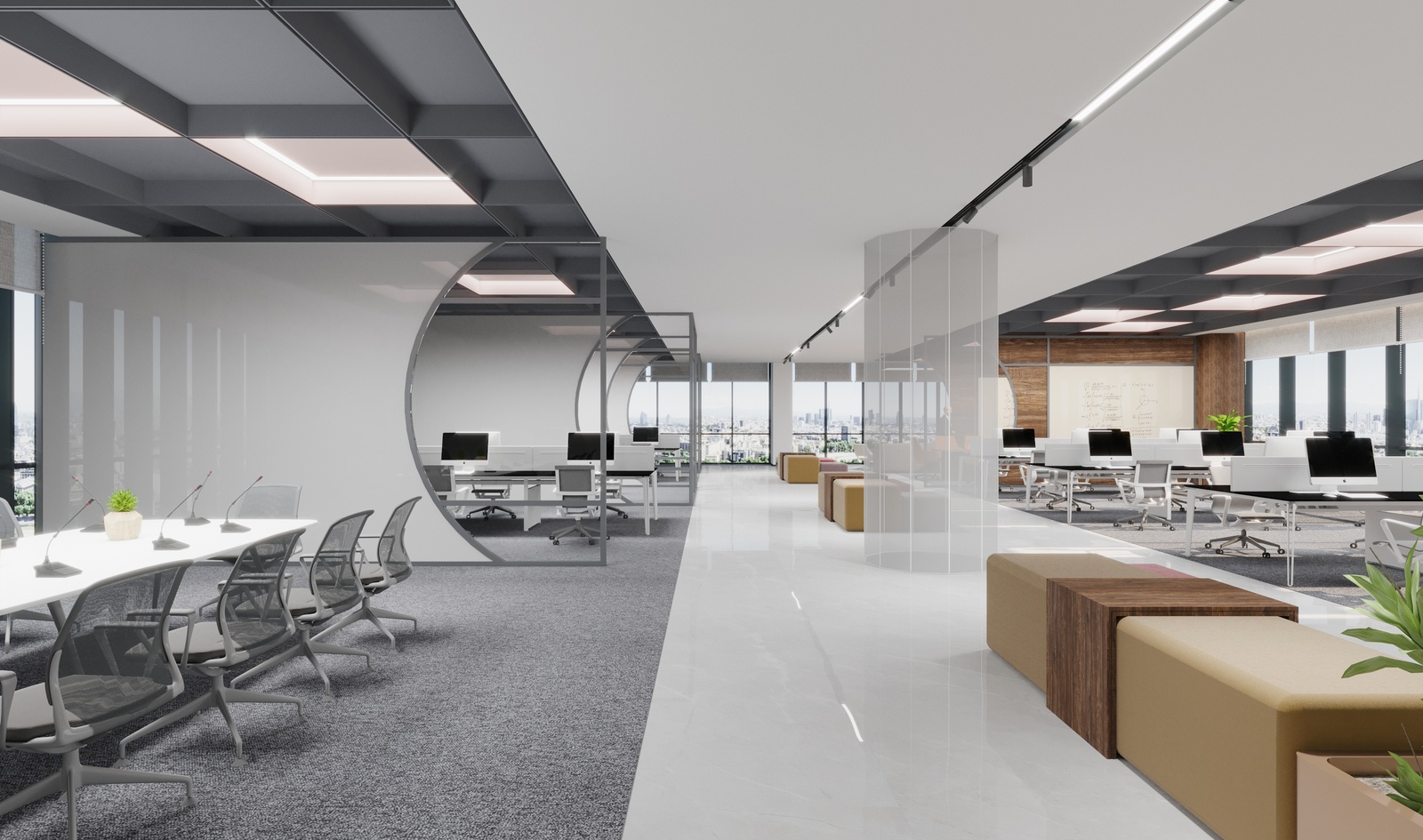 Khu vực làm việc được thiết kế dạng mở đem đến một tổng thể rộng, thoáng cùng tầm nhìn bao quát, tăng tính kết nối trong công việc và giúp nhân viên dễ dàng trao đổi, làm việc nhóm. Màu sắc nội thất văn phòng vẫn dựa trên tone màu chủ đạo của tổng thể: trắng - xám cùng kiểu dáng hiện đại, thanh lịch. Mặt khác, với những phòng ban cần độ riêng tư và bảo mật cao hơn, thay vì xây tường KTS đã sử dụng vách ngăn mỏng kiểu dáng mềm mại với thiết kế hình vòng cung kết hợp kính đầy ấn tượng cho khu vực này.