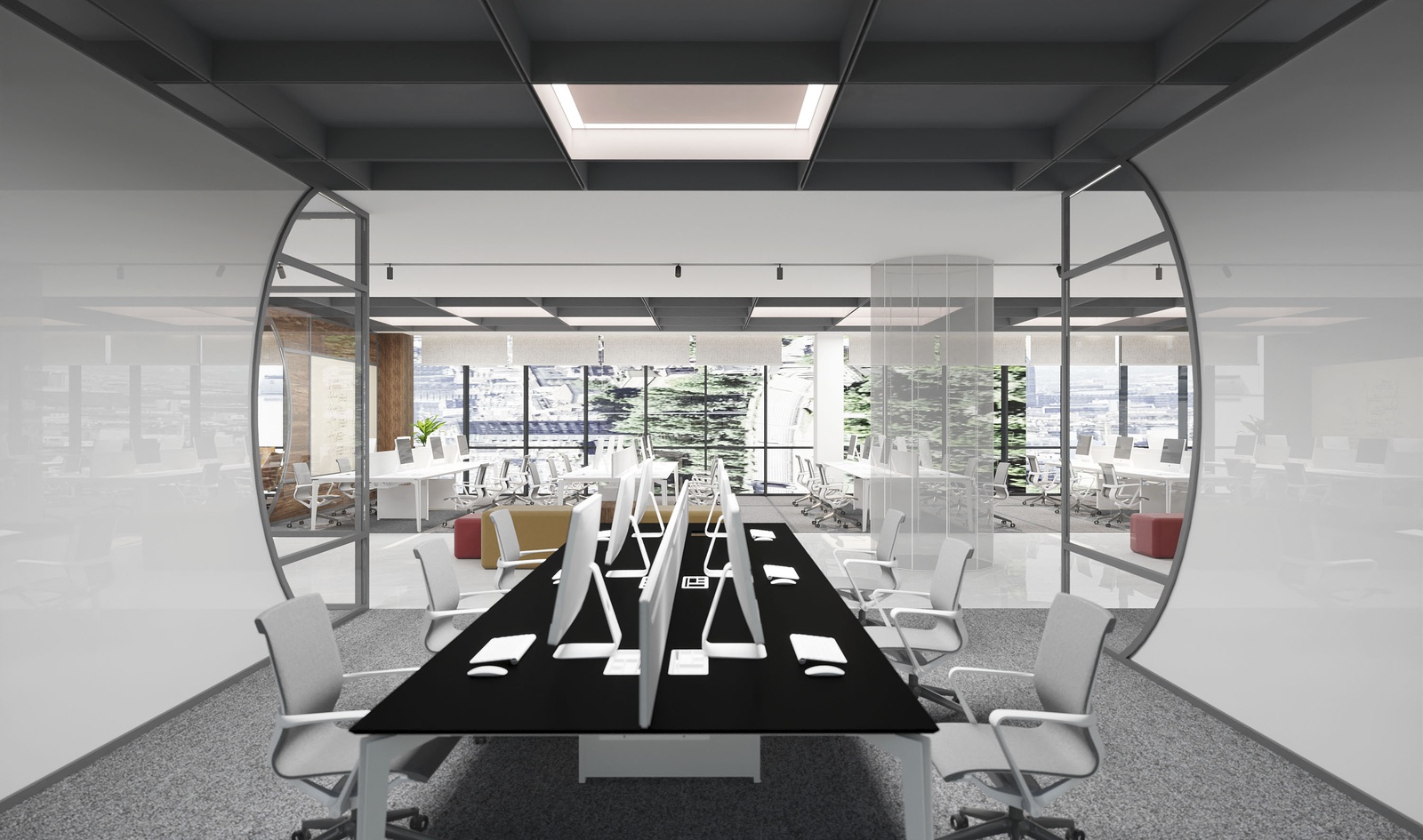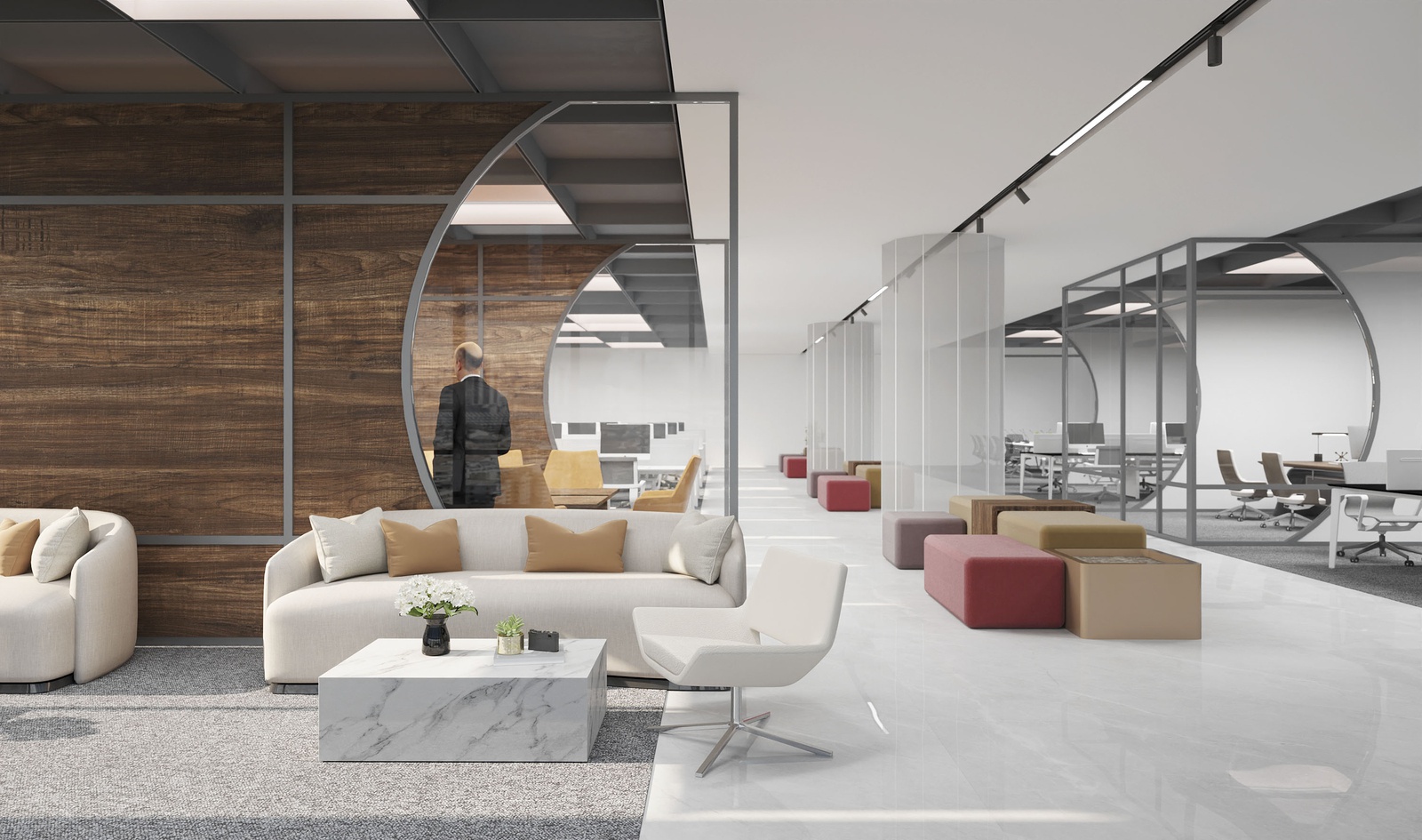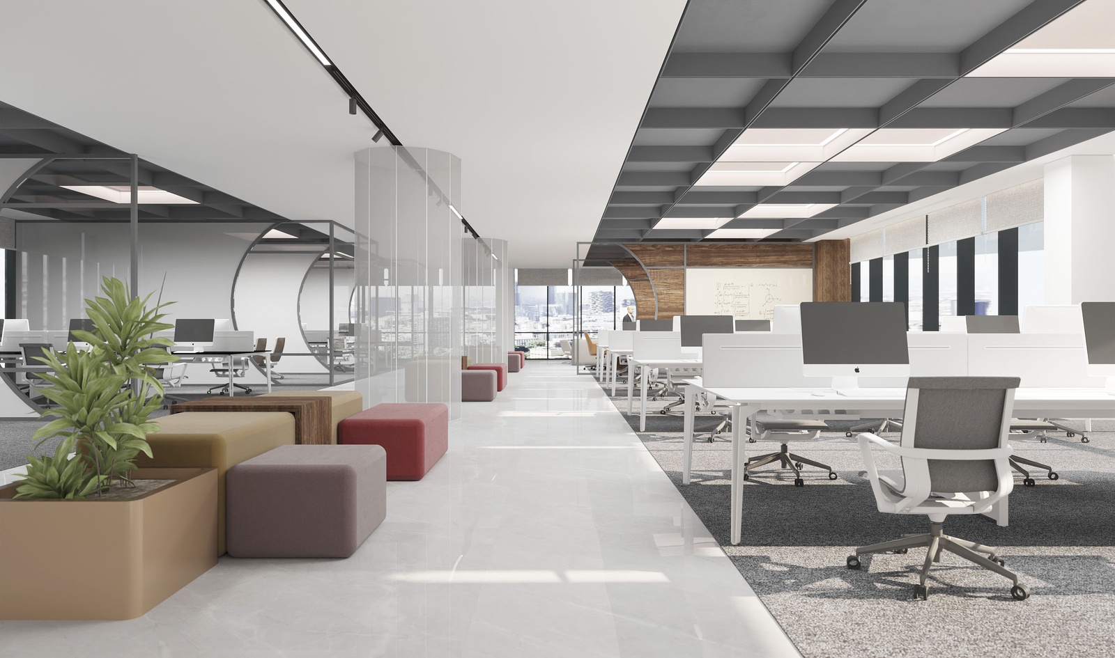 Khu vực làm việc được thiết kế dạng mở đem đến một tổng thể rộng, thoáng cùng tầm nhìn bao quát, tăng tính kết nối trong công việc và giúp nhân viên dễ dàng trao đổi, làm việc nhóm. Màu sắc nội thất văn phòng vẫn dựa trên tone màu chủ đạo của tổng thể: trắng - xám cùng kiểu dáng hiện đại, thanh lịch. Mặt khác, với những phòng ban cần độ riêng tư và bảo mật cao hơn, thay vì xây tường KTS đã sử dụng vách ngăn mỏng kiểu dáng mềm mại với thiết kế hình vòng cung kết hợp kính đầy ấn tượng cho khu vực này.