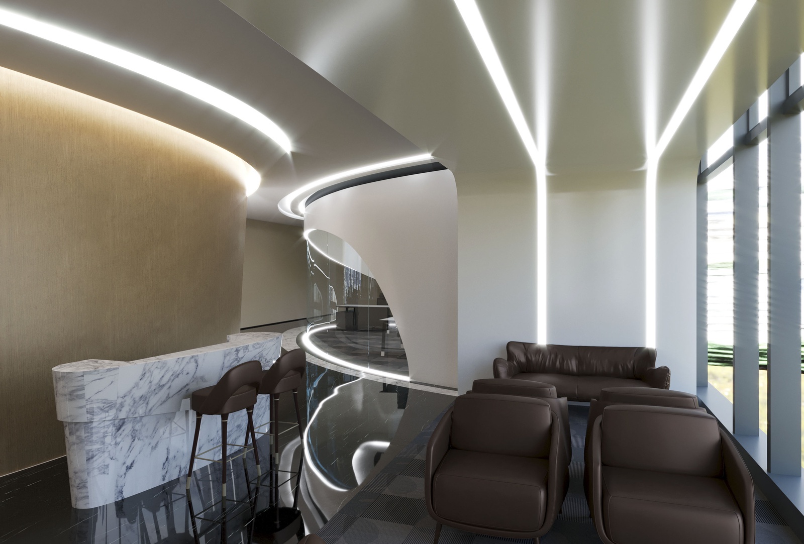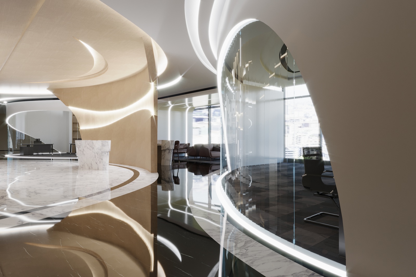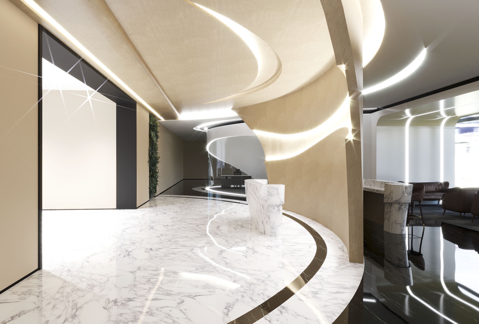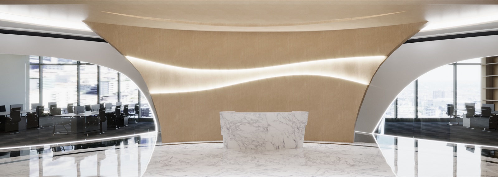 Khu vực lễ tân được đặt ở vị trí trung tâm sảnh lớn, thiết kế gợi xúc cảm về một không gian đơn giản nhưng tinh tế, sang trọng. Về tổng thể, nội thất trong khu vực này được bố trí theo lối tối giản mang đến một không gian rộng, thoáng. Trong đó, quầy lễ tân chất liệu đá marble cao cấp với thiết kế dạng vòng cung độc đáo. Tấm vách ngăn mỏng màu đồng sang trọng với kiểu dáng uốn cong mềm mại đóng vai trò ngăn tách khu vực sảnh - nơi tiếp khách và khu làm việc. Tuy không có bất kỳ chi tiết trang trí nào nhưng khu vực lễ tân vẫn ghi được ấn tượng mạnh nhờ “mảng sáng” quyến rũ đến từ ánh đèn led hắt điểm.