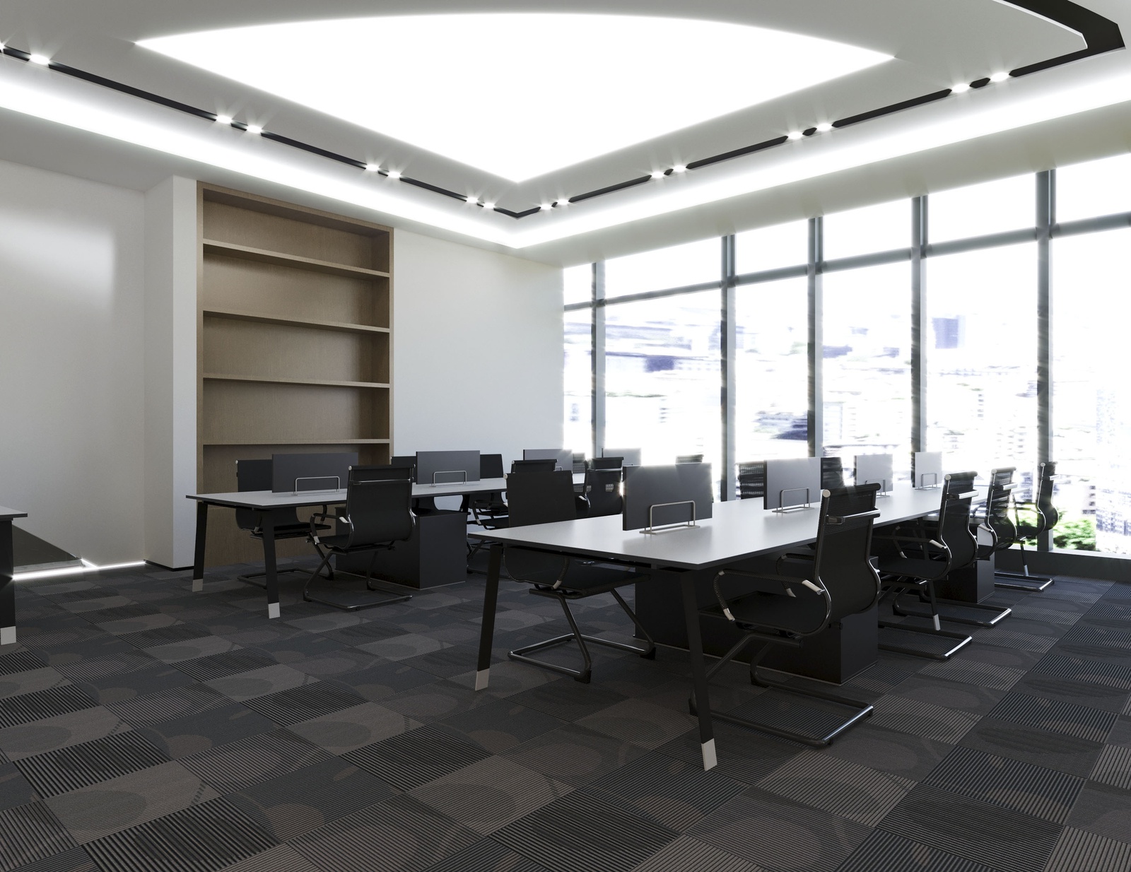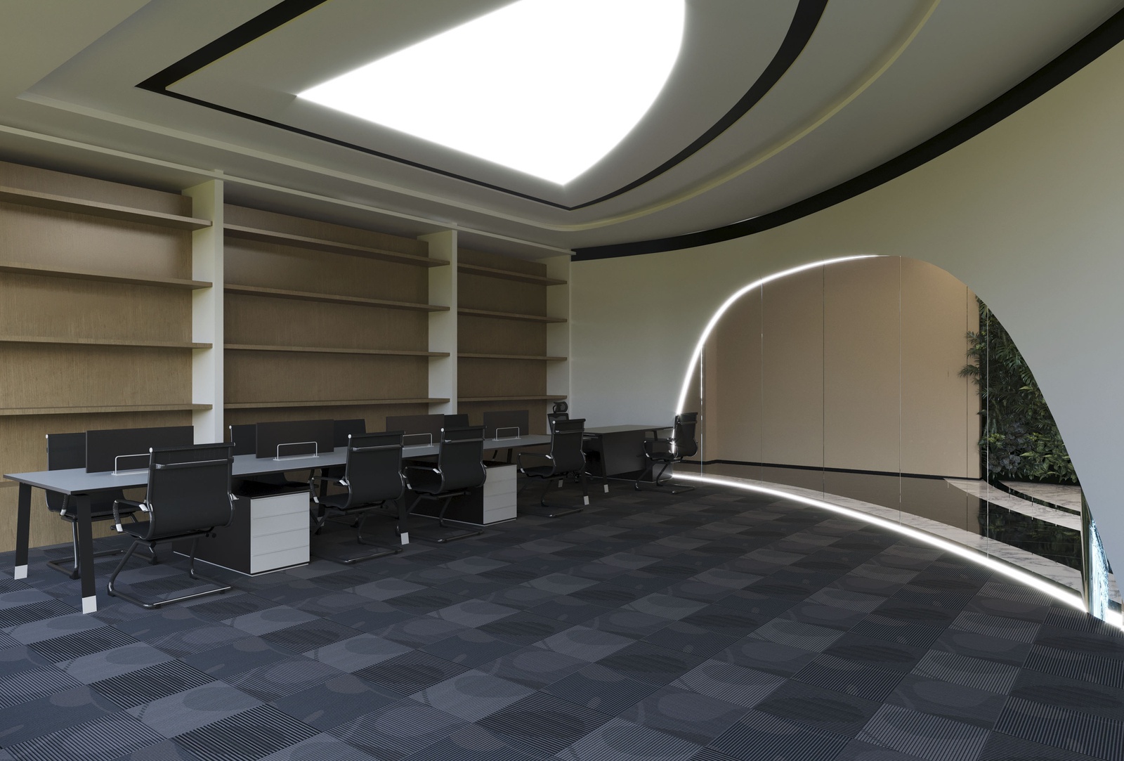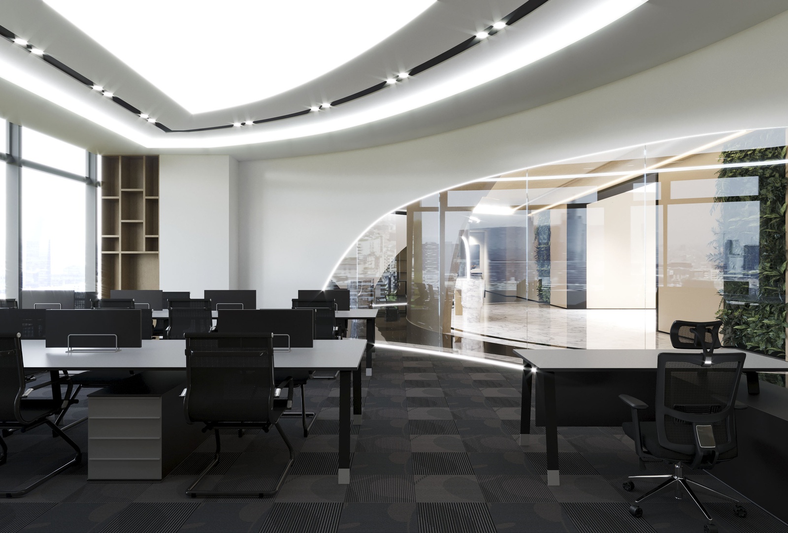 Phòng làm việc có kết cấu như một hình tam giác uốn cong ở một cạnh vô cùng mới lạ. Bàn làm việc được đặt song song nhau, khoảng cách giữa các dãy bàn và giữa chỗ ngồi các nhân viên đều được đo đạc tỉ mỉ nhằm đem đến sự thoải mái trong cả ngày dài làm việc. Tuy thiết kế theo dạng không gian mở, nhưng để đảm bảo tính riêng tư cần thiết và phân tách chỗ ngồi riêng biệt ở mỗi bàn đều được trang bị thêm tấm ngăn nhỏ gọn với tone màu đồng bộ nội thất văn phòng.
