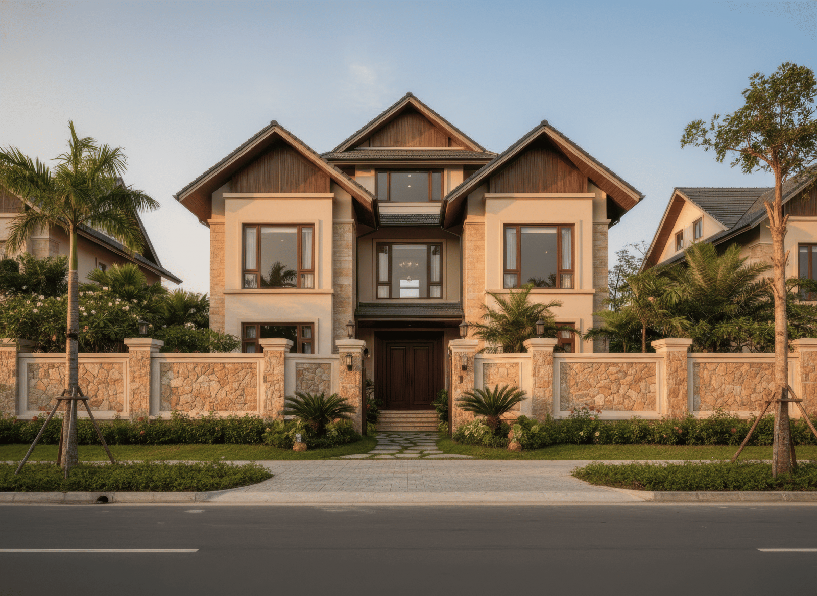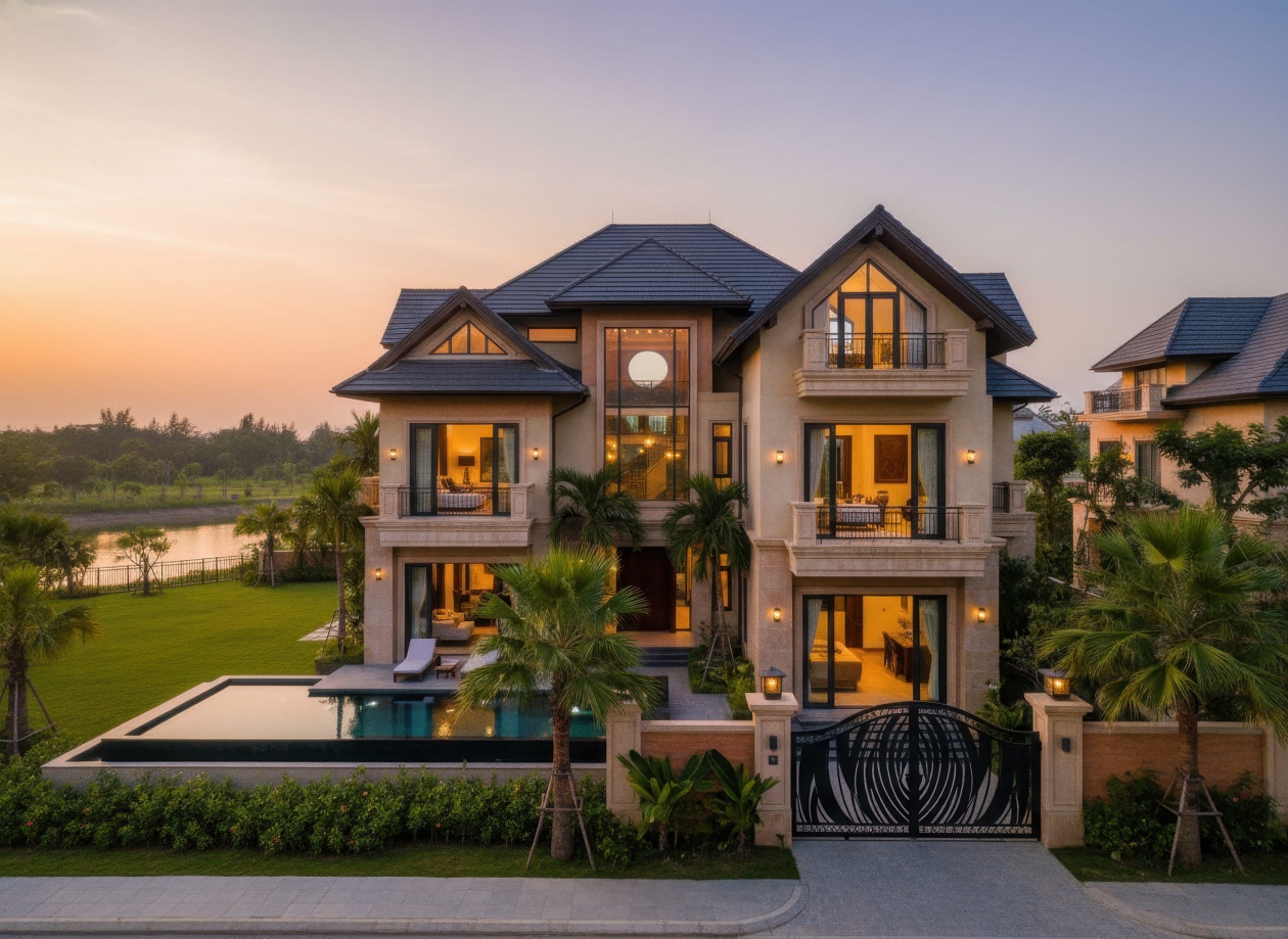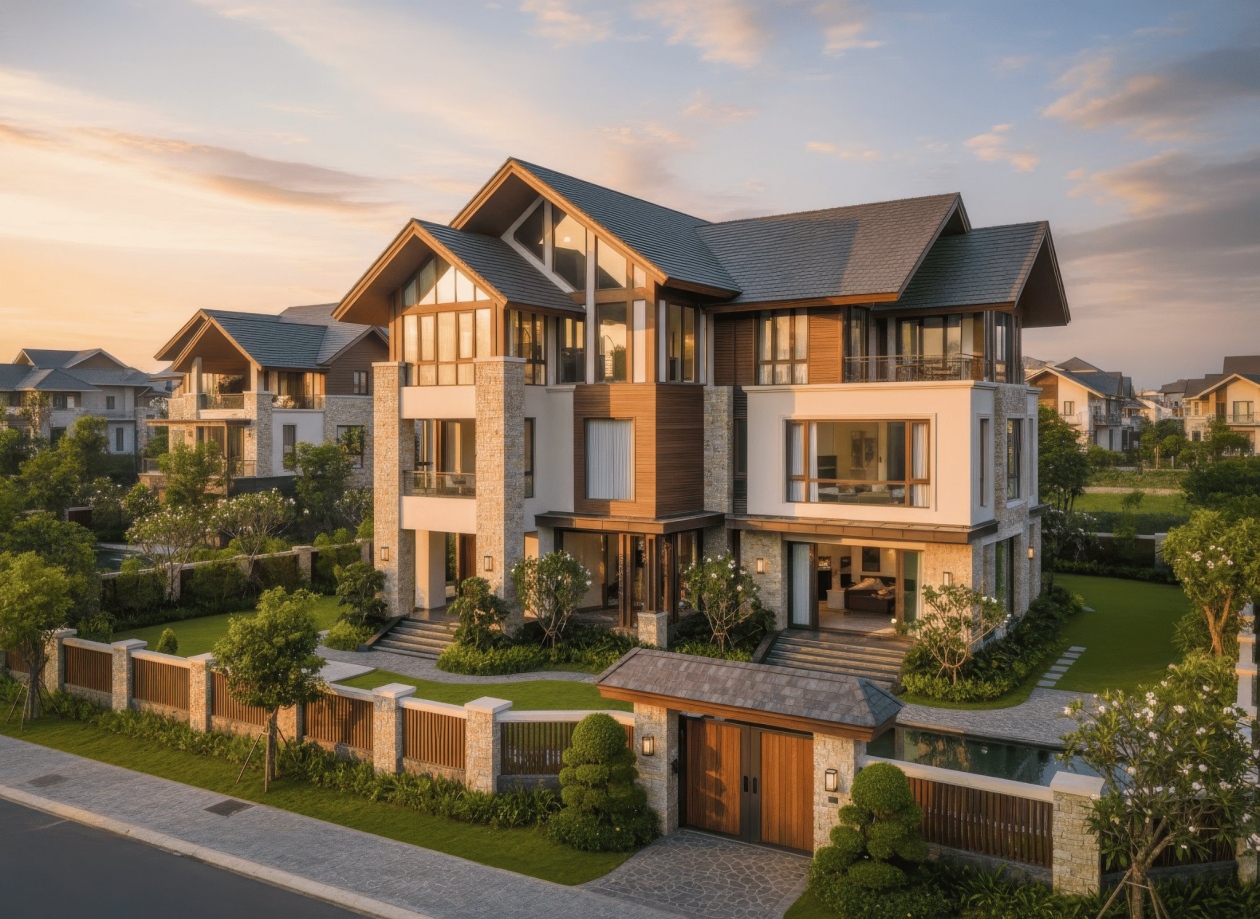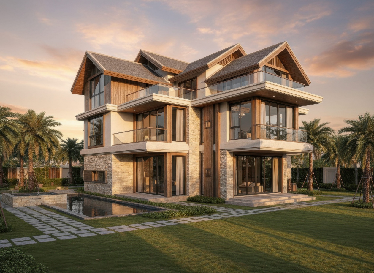 Nhà mái Thái 3 tầng 2 mặt tiền tạo ấn tượng mạnh mẽ nhờ khả năng phô diễn trọn vẹn hình khối kiến trúc từ hai hướng, mang lại vẻ đẹp bề thế và cuốn hút. Hệ mái Thái dốc cao được xử lý đối xứng hoặc giật cấp tinh tế, giúp công trình nổi bật giữa góc phố và tăng hiệu quả thông gió, lấy sáng tự nhiên. Với lợi thế hai mặt thoáng, không gian bên trong trở nên rộng mở, sang trọng và giàu tính thẩm mỹ, đáp ứng hoàn hảo nhu cầu sống đẳng cấp của gia chủ.