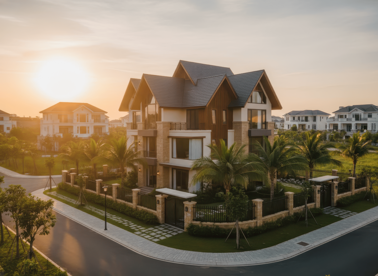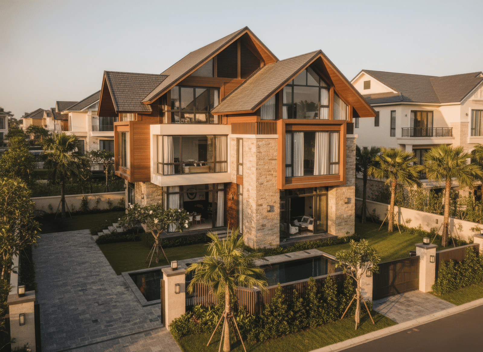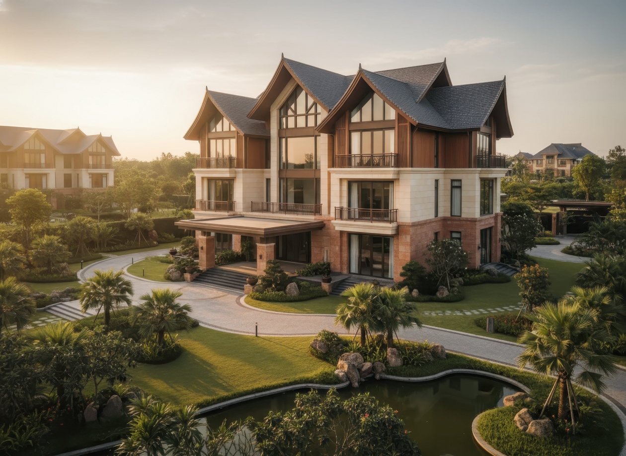 Nhà mái Thái 3 tầng 2 mặt tiền tạo ấn tượng mạnh mẽ nhờ khả năng phô diễn trọn vẹn hình khối kiến trúc từ hai hướng, mang lại vẻ đẹp bề thế và cuốn hút. Hệ mái Thái dốc cao được xử lý đối xứng hoặc giật cấp tinh tế, giúp công trình nổi bật giữa góc phố và tăng hiệu quả thông gió, lấy sáng tự nhiên. Với lợi thế hai mặt thoáng, không gian bên trong trở nên rộng mở, sang trọng và giàu tính thẩm mỹ, đáp ứng hoàn hảo nhu cầu sống đẳng cấp của gia chủ.