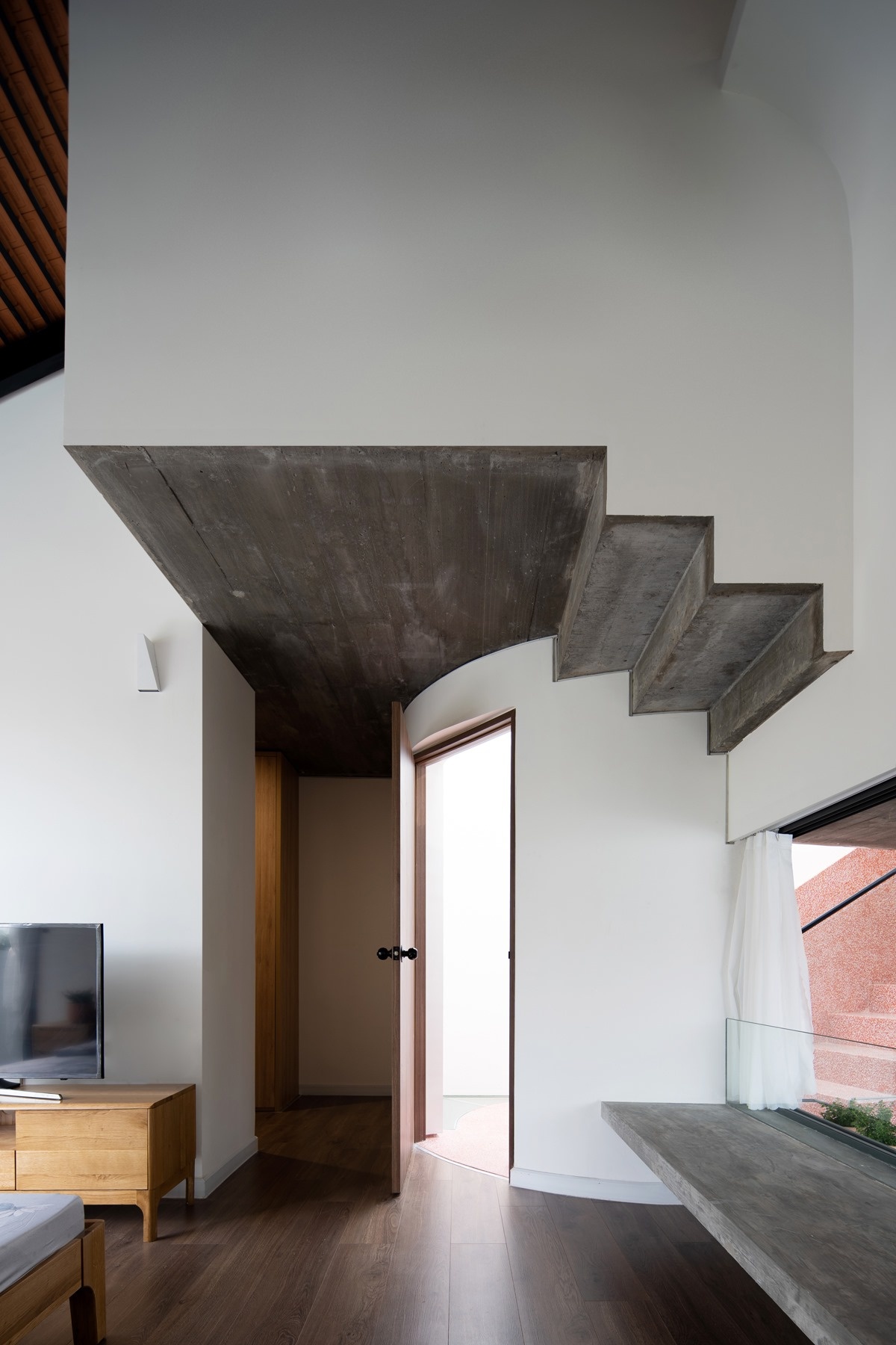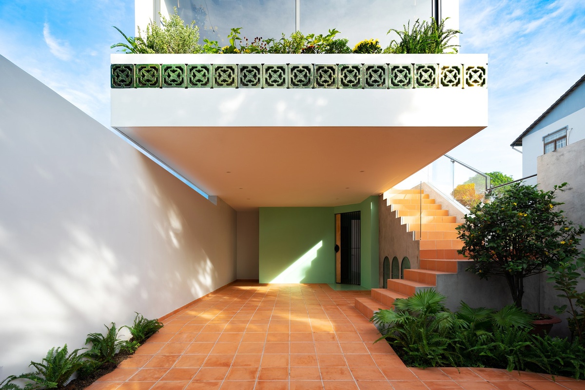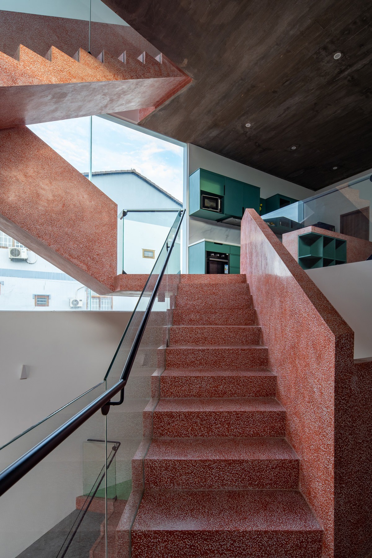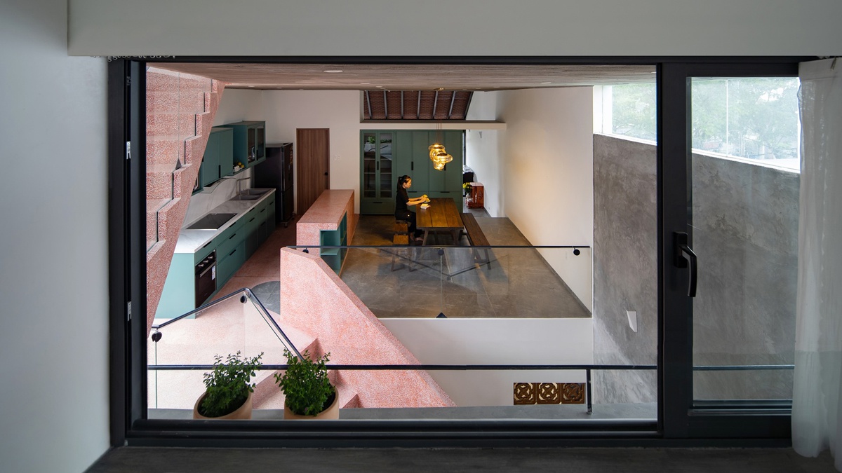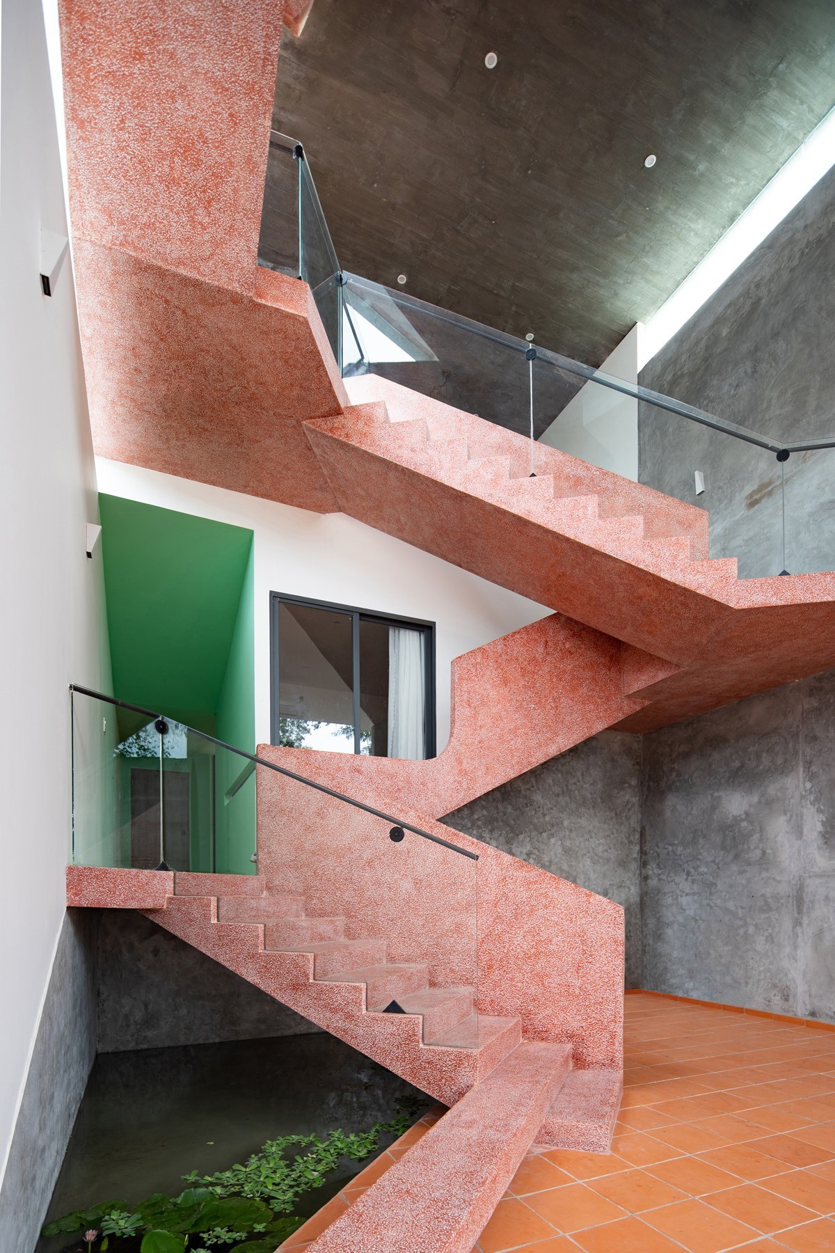 Bên cạnh đó thiết kế cầu thang của có tính thẩm mỹ rất cao khi mà bậc thang bắt đầu ở tầng dưới và bậc thang kết thúc ở tầng trên đều nằm trên một vị trí đối xứng trên dưới như những đường thẳng song song. Điều này đã tạo nên một lợi thế rất lớn cho lối thiết kế thông tầng khi mà có thể tiết kiệm không gian tối đa và dành thêm khoảng trống cho lõi thông tầng của căn nhà. Nhờ vào đặc điểm ấy mà cấu trúc căn nhà trở nên linh hoạt hơn và kết nối toàn bộ công trình.