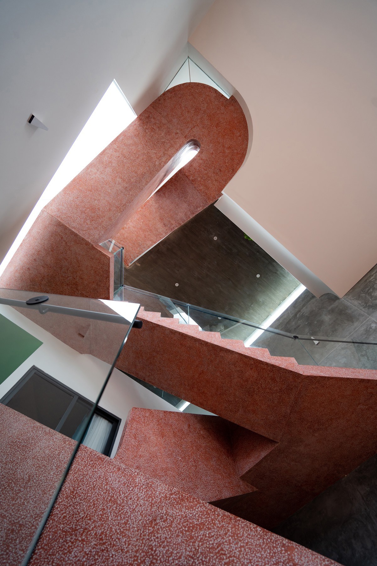 Một điểm nhấn kiến trúc của Nhà triền dốc chính là thiết kế cầu thang rất đặc biệt. Các thành viên trong gia đình có thể vào nhà bằng 2 lối cầu thang riêng biệt phân chia không gian chung và không gian cá nhân của gia đình. Một lối cầu thang dành cho không gian chung ở phía trước, một lối cầu thang phía sau chỉ để dành cho trong gia đình sử dụng, khi các thành viên của gia đình dùng lối cầu thang này thì sẽ luôn đi ngang qua phòng của người ông ở tầng trệt để thăm hỏi. Đây là một thiết kế rất tinh tế mang ý nghĩa mong muốn tất cả mọi người đều có thể quan tâm đến những thế hệ trên trong nhà.