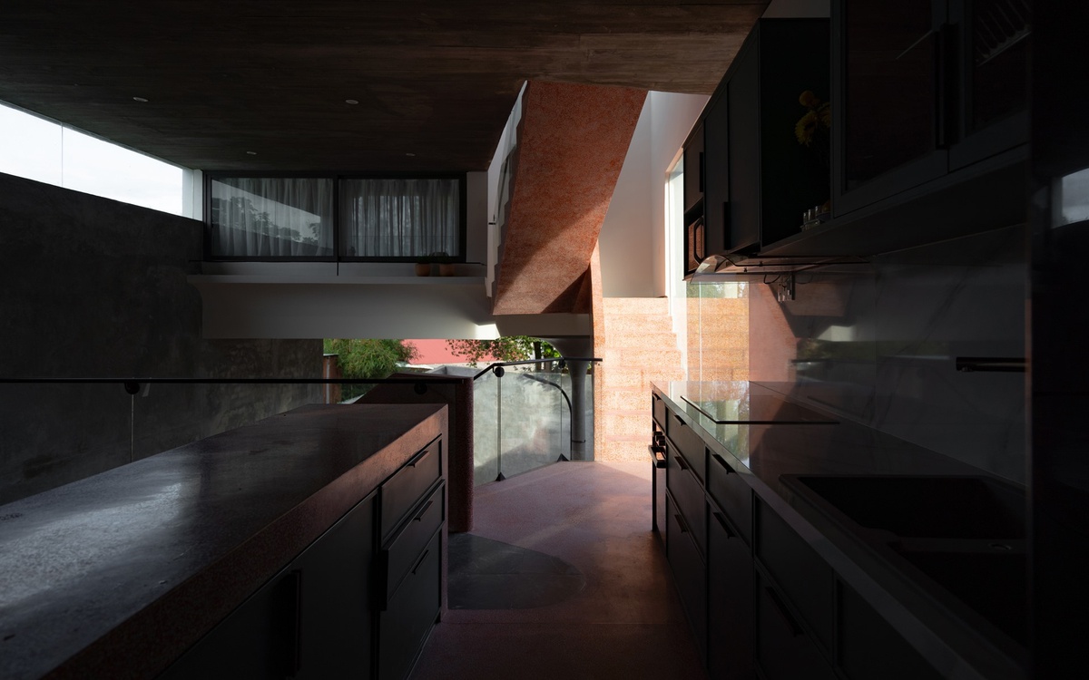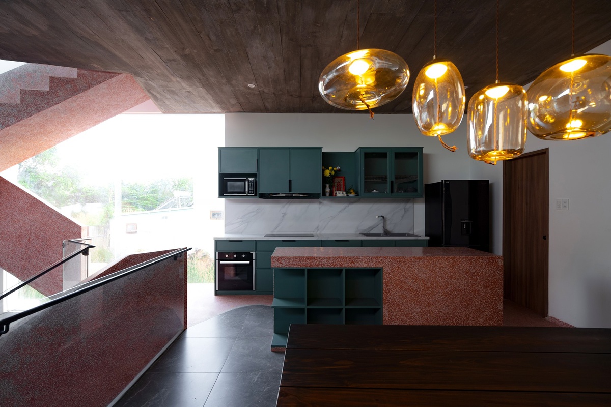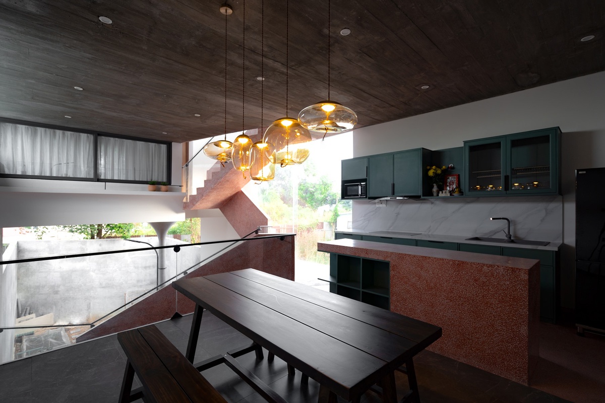 Phòng bếp ở lầu hai là nơi gắn kết các thành viên gia đình trong các bữa ăn cùng nhau. Phòng bếp được thiết kế gọn gàng và đơn giản với các gam màu tối nhã nhặn. Đặc biệt quầy bar được chế tác bằng cùng một chất liệu đá với cầu thang tạo nên cảm giác hoàn chỉnh và thống nhất về tổng thể.