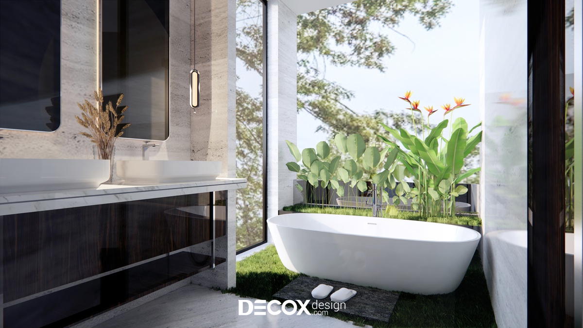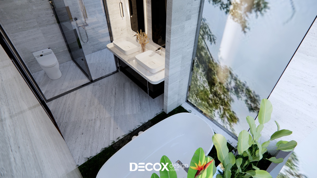 Dù cho dùng chất liệu không thay đổi so với các không gian khác thế nhưng điểm nhấn của phòng tắm chính là có một khoảng không mở thông ra ngoài ban công, nơi đấy cũng được đặt một chiếc bồn tắm lộ thiên giúp cho gia chủ có thể vừa thư giãn vừa nhìn ngắm không gian bên ngoài ban công.