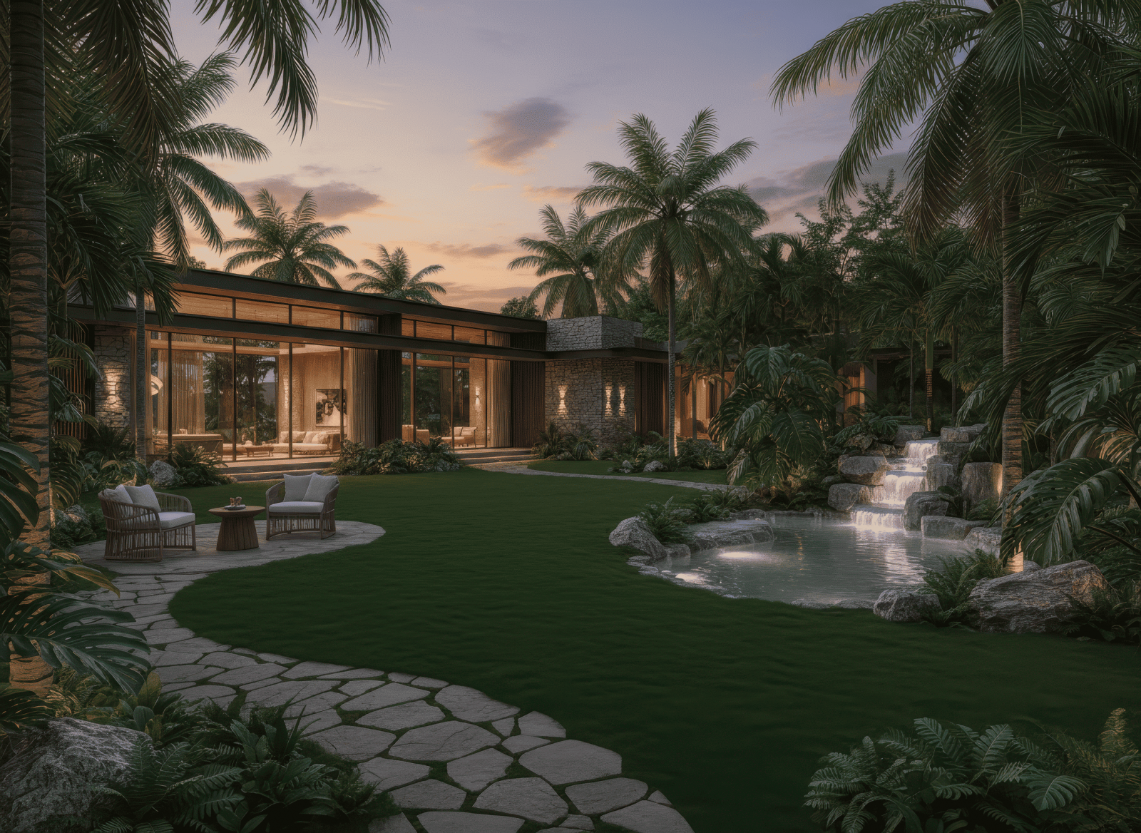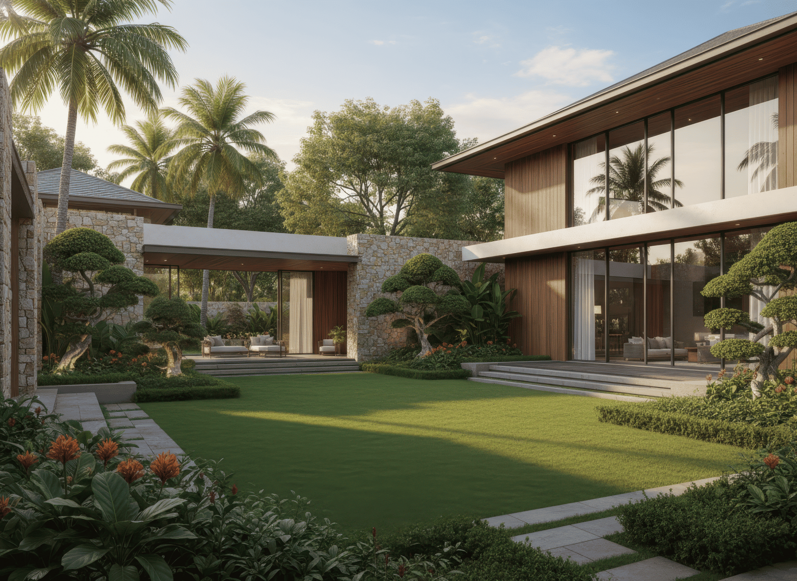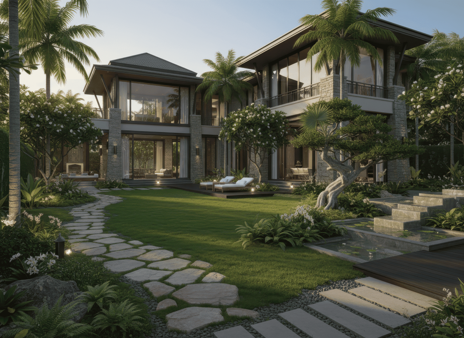 - Thiết kế sân vườn biệt thự phong cách hiện đại, nhiệt đới