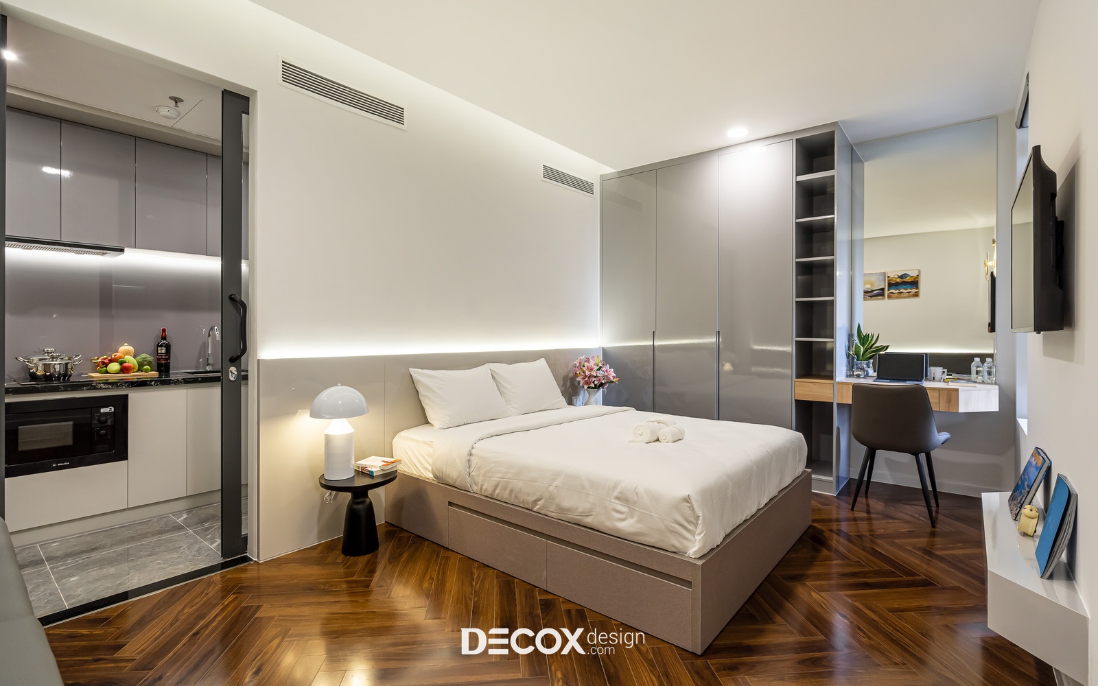 Vẫn được thiết kế dựa trên mô hình service apartment, thế nhưng trái ngược với lối thiết kế mở như trong loại phòng 2, không gian phòng ngủ sau lại phân tách khu vực bếp thành không gian riêng biệt. Về hình thức, bố cục không gian như thế này tuy không quá ưu về mặt không gian nhưng đây lại là giải pháp giúp tránh việc ám mùi, dầu mỡ hay khói bếp ảnh hưởng đến chất lượng giấc ngủ, việc nghỉ ngơi của khách hàng.