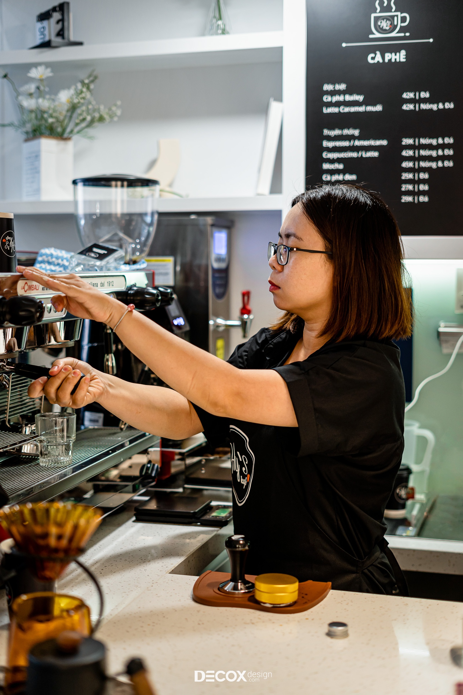 Mặt tiền tầng trệt của căn hộ dịch vụ được decor thành một quán cafe xinh xắn với cái tên vô cùng ấn tượng - Hy’s Kafe. Thiết kế quán lấy cảm hứng từ tinh thần hiện đại với tone trắng tinh tế chủ đạo mang đến một không gian rộng rãi, thoáng đãng và tinh tươm.