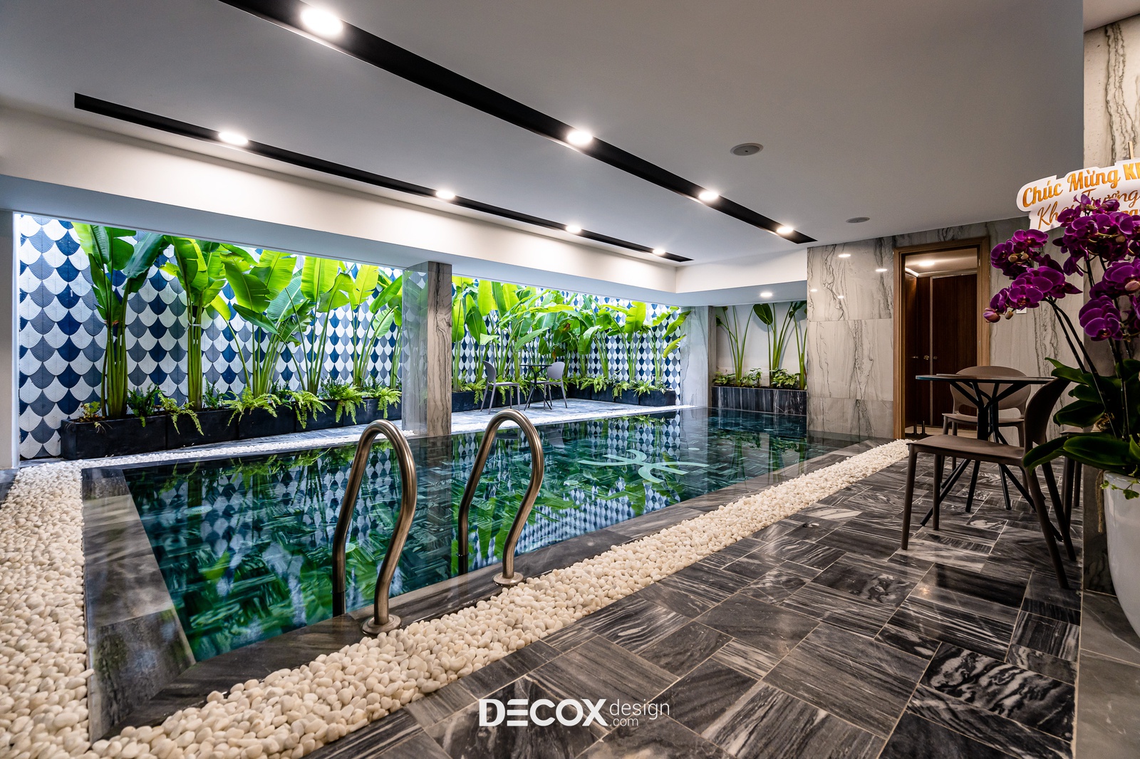 Từ quán cafe đi sâu vào bên trong sẽ là khu vực tiện ích: hồ bơi và phòng gym dành riêng cho những khách hàng lưu trú và sử dụng dịch vụ khách sạn. Trong đó, nổi bật nhất vẫn phải kể đến khu vực hồ bơi nên thơ với tiểu cảnh cây xanh trang trí dọc theo những bức tường kèm theo những viên sỏi trắng trải dọc theo thành hồ bơi.