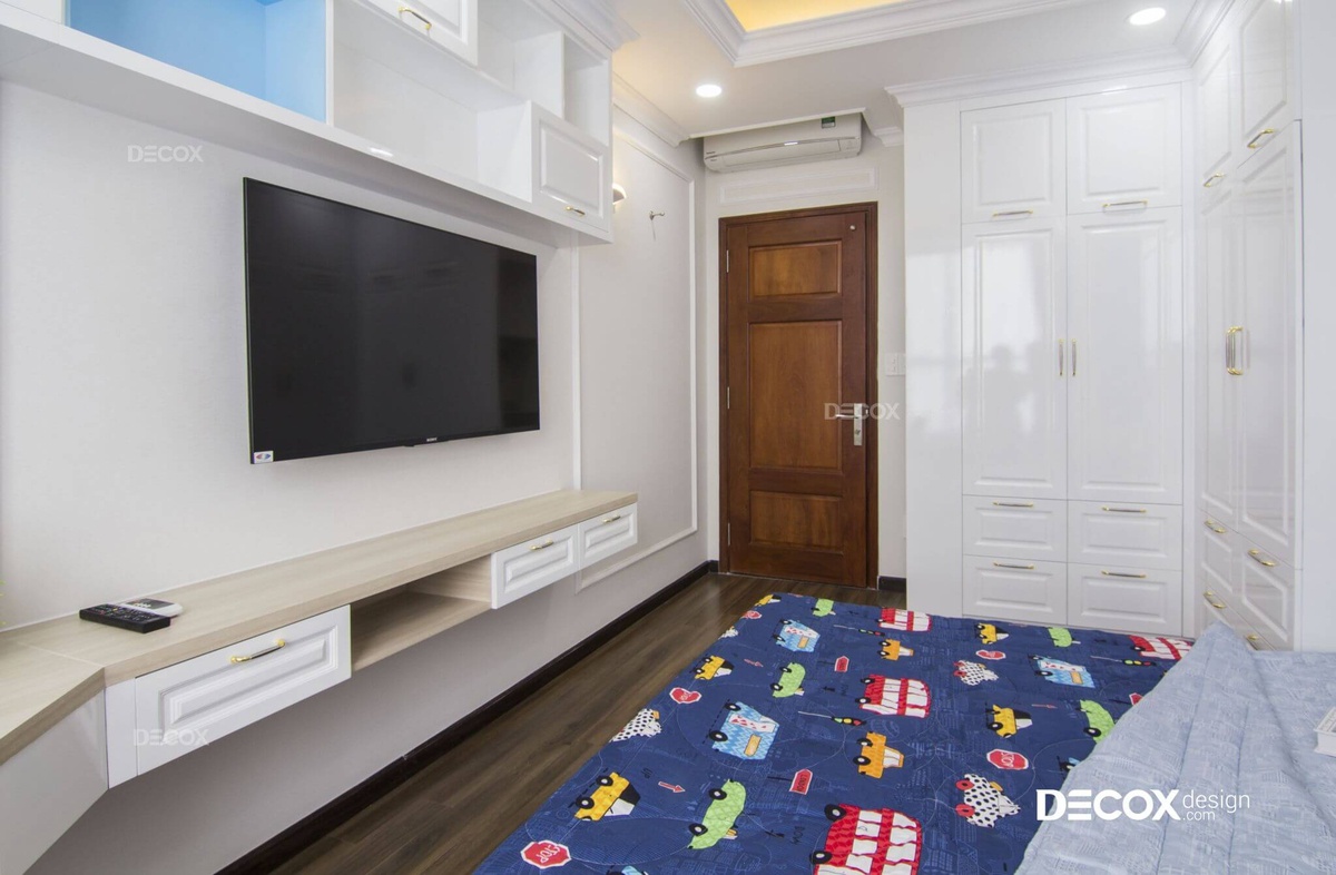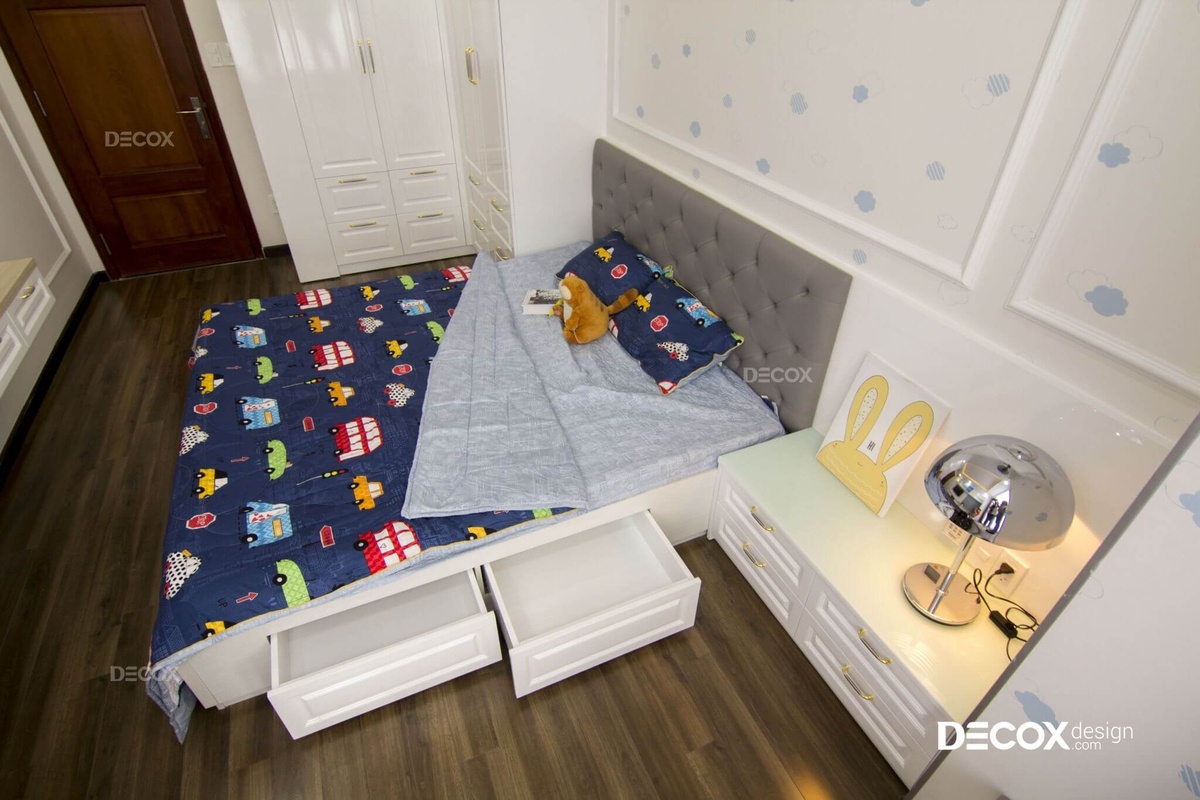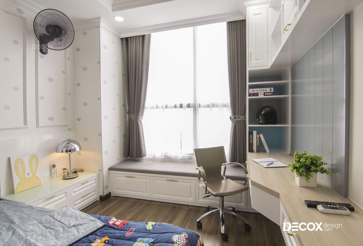 Sinh động và tiện nghi và bài toán đặt ra cho không gian sinh hoạt của bé trai này đây. Để tối ưu tiện nghi cho bé, Decox Design đã sắp xếp những chi tiết trong phòng như bàn học, kệ sách và baywindow thành hệ liên tục, vừa tiết kiệm diện tích vừa phù hợp với nhu cầu học tập và nghỉ ngơi của bé.