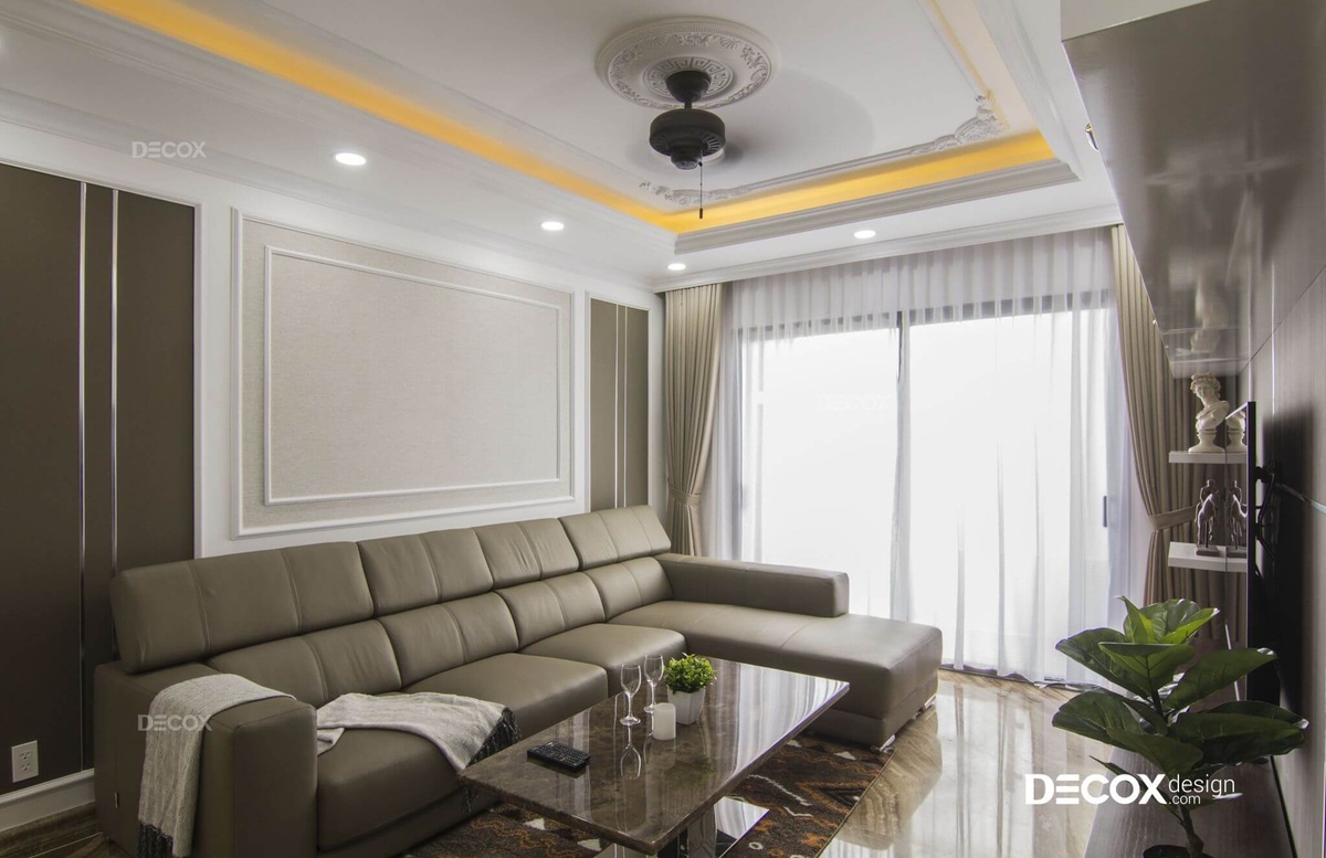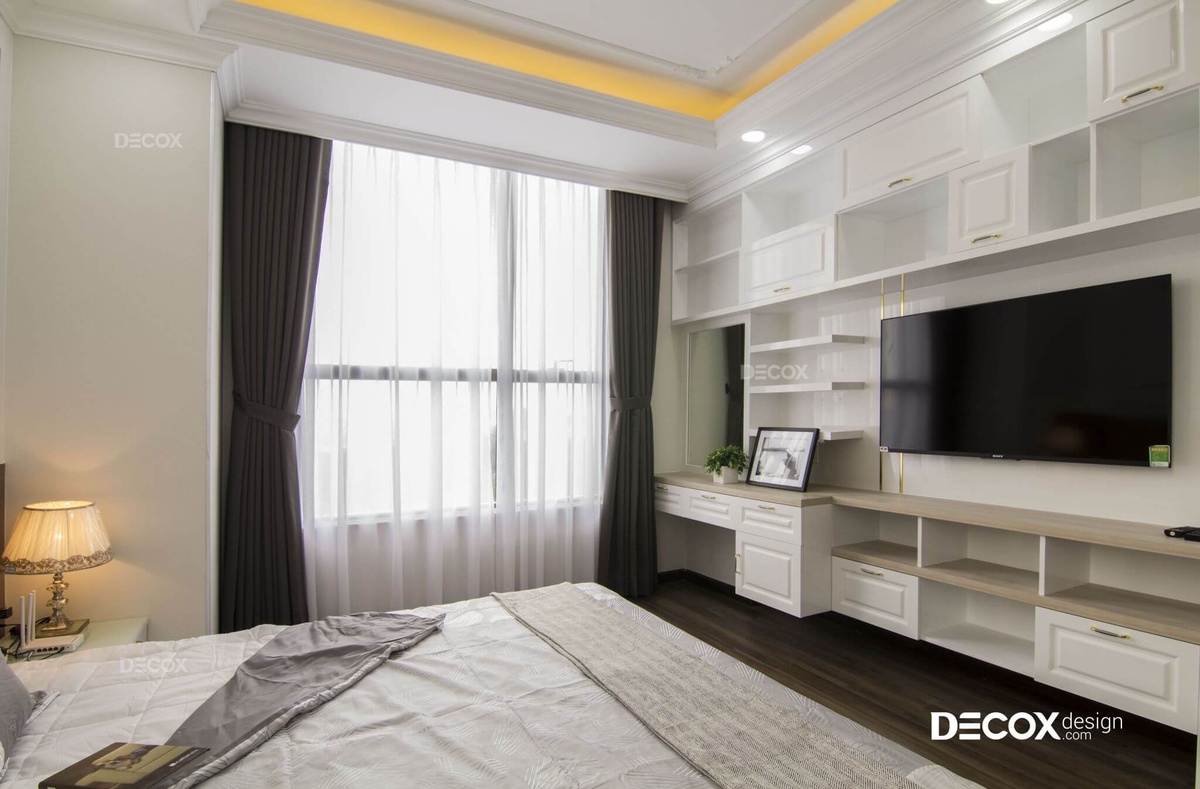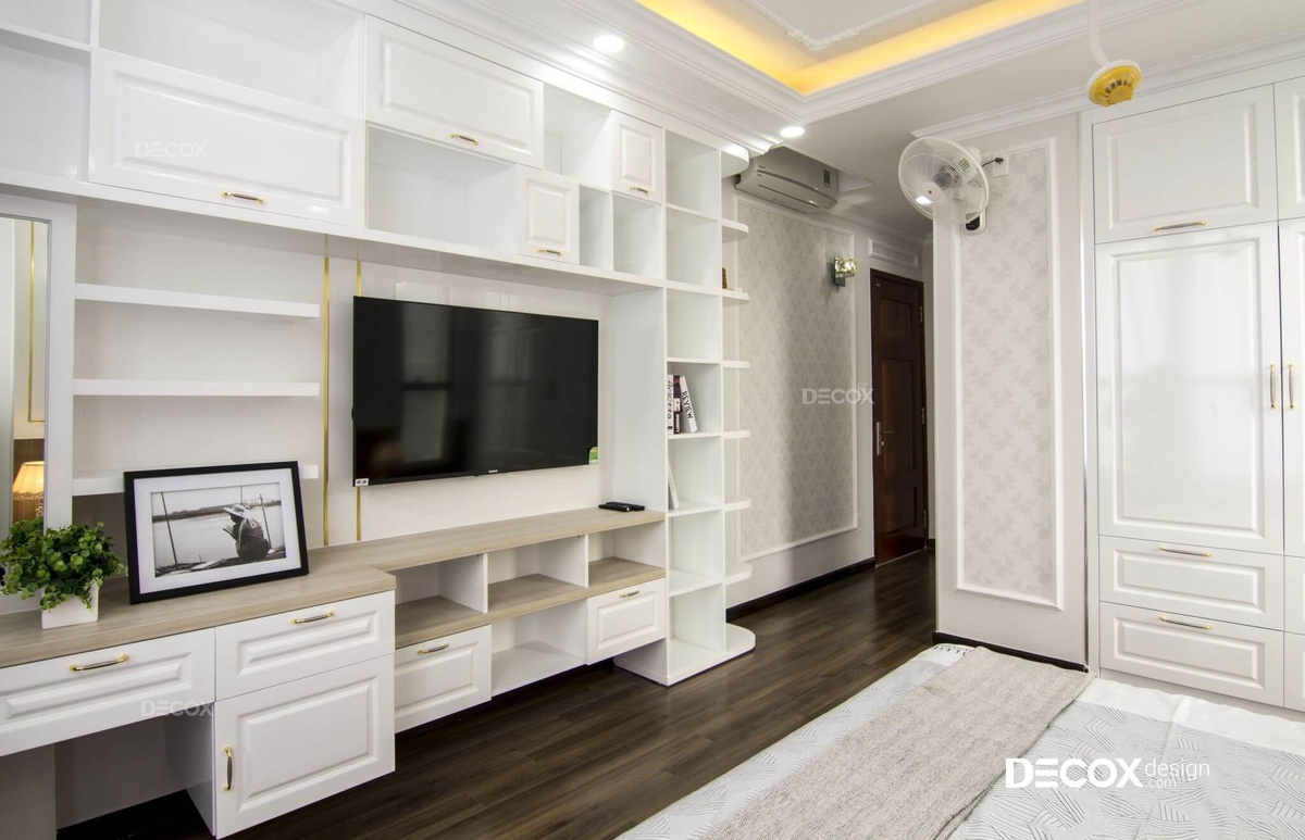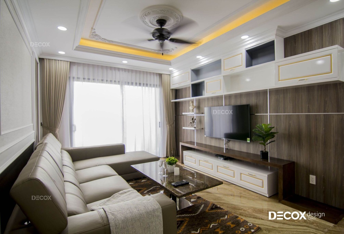 Là căn hộ được thiết kế theo phong cách bán cổ điển, có nét xa xưa, hoài niệm nhưng vẫn rất hiện đại và hợp thời. Nếu mảng tường ở sau sofa được thực hiện đơn giản với những đường phào chỉ trắng – nét đặc trưng của phong cách này, thì vách TV là hệ tủ màu nâu gỗ cực sang trọng và đẹp mắt.
