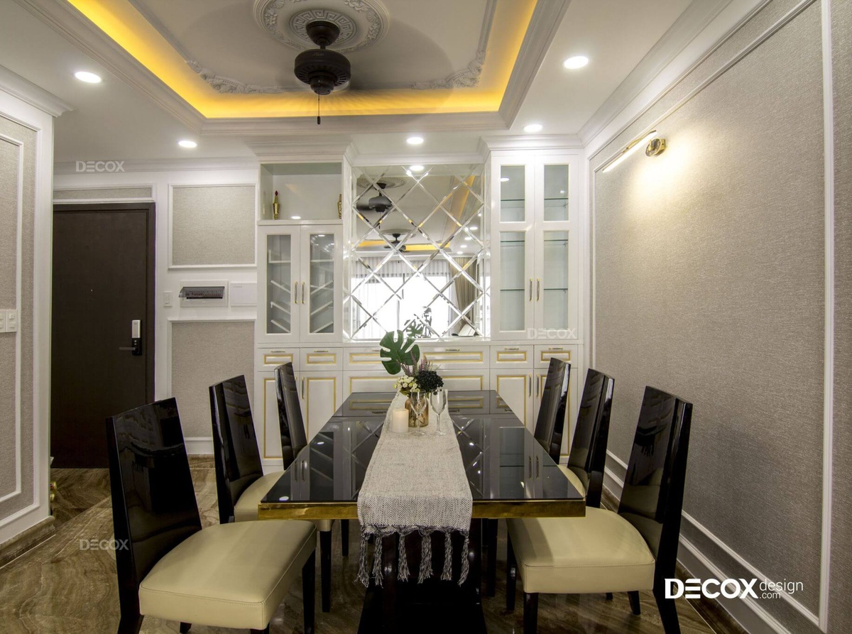 Không gian bàn ăn của dự án thi công nội thất căn hộ Garden Gate được ốp kính thủy cao cấp với chức năng phản chiếu tạo cảm giác rộng rãi, thoáng mát cho gian phòng này. Bên cạnh đó, thạch cao ốp trần nhà được sử dụng những hoa văn điêu khắc độc đáo và đẹp mắt.