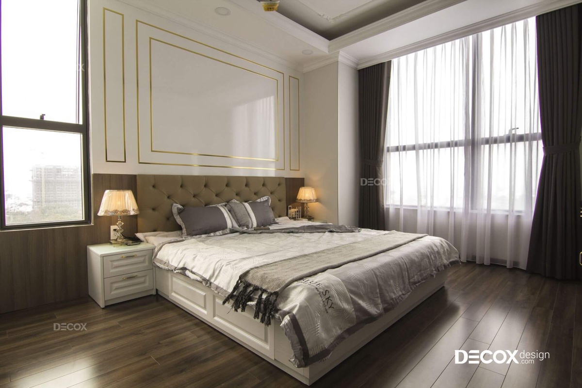 Để tạo nên dấu ấn đặc biệt hơn cho không gian phòng ngủ master, vách đầu giường được chạy đường kim loại màu vàng đồng. Đồng thời, phòng được sử dụng tối đa ánh sáng tự nhiên để mang đến không gian sống nhẹ nhàng và tinh tế cho gia đình của chị.