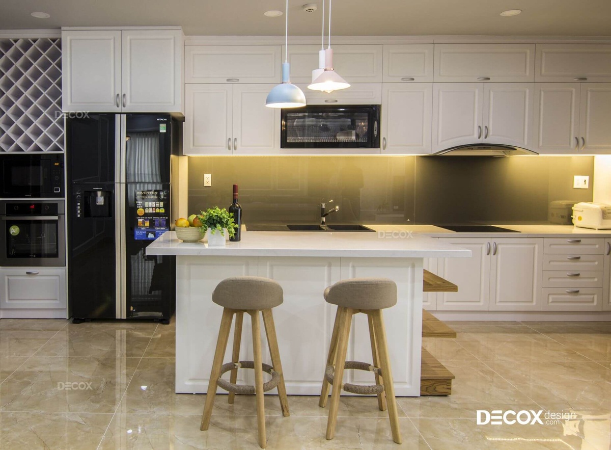 Không gian bếp và bàn ăn trong dự án lần này sử dụng màu trắng làm chủ đạo, kết hợp ánh sáng vàng mang lại cảm giác ấm áp dễ chịu cho gia đình. Với không gian khá rộng rãi, bếp được bố trí thêm quầy đảo có chức năng như quầy bar nhỏ tại nhà, để gia chủ có thể sử dụng mỗi khi có tiệc hay có khách đến nhà chơi.