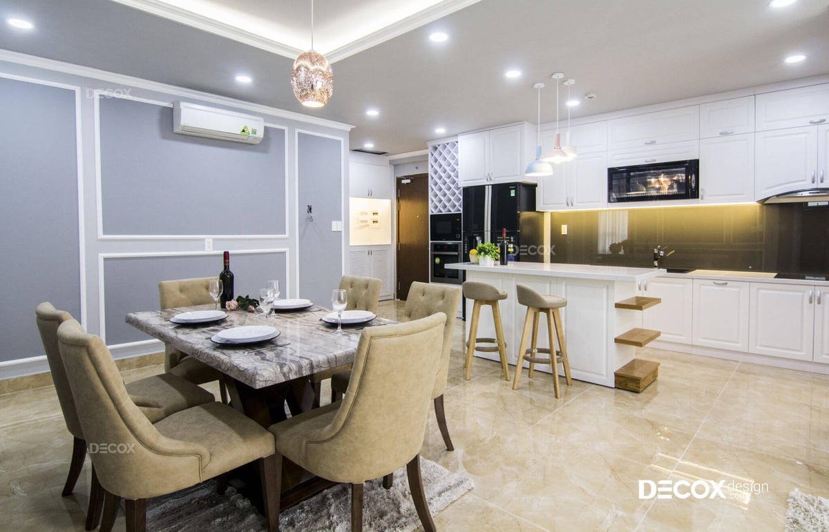 Từ phong cách thiết kế hiện đại kết hợp bán cổ điển, Decox Design đã thi công thiết kế nội thất chung cư Gold View với các chi tiết nội thất gam màu trung tính bật lên phong cách sống tinh tế cho gia chủ. Bên cạnh đó, sử dụng ánh sáng vàng ở những nơi có tủ gỗ để tạo cảm giác ấm áp hơn cho ngôi nhà.
