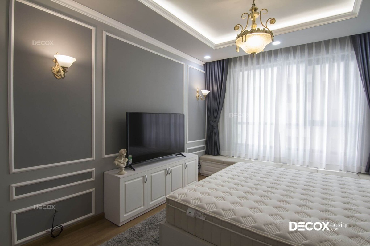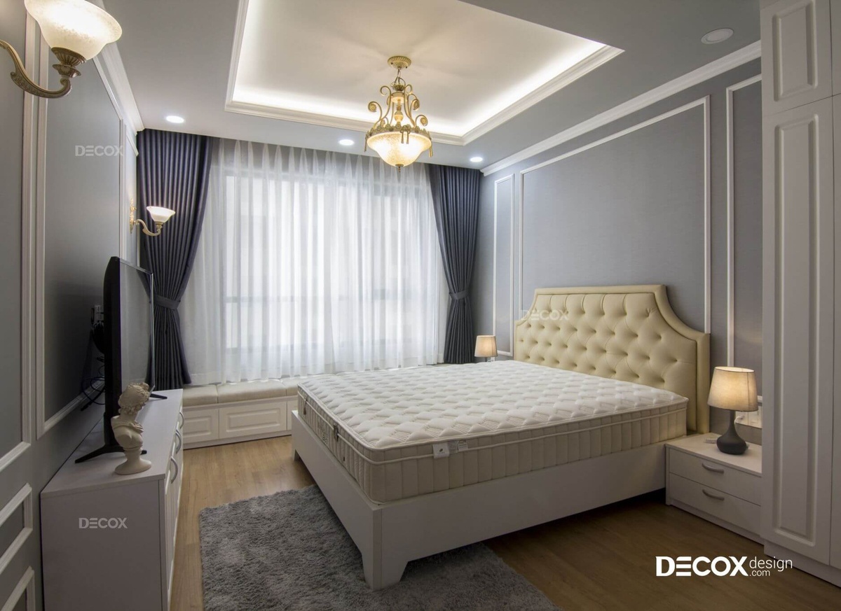 Không gian phòng ngủ master được thực hiện theo phong cách bán cổ điển với gam màu trung tính hiện đại và những đường phào chỉ trắng sang trọng cùng các chi tiết đèn trần, đèn bàn có hoa văn cầu kì, uyển chuyển. Bên cạnh đó, baywindow còn mang đến cho gia chủ cảm giác thư giãn tuyệt vời vào những buổi tối sau một ngày dài làm việc mệt mỏi.