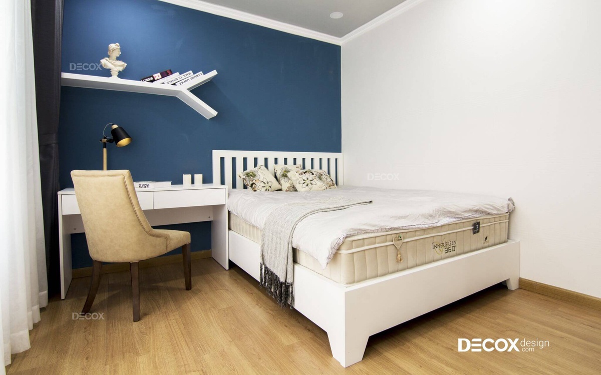 Với dự án thi công nội thất căn hộ Gold View lần này, không gian phòng bé được bố trí các chi tiết nội thất rất tiện nghi như giường lớn, bàn học và kệ sách, tủ quần áo kết hợp kệ TV để tiết kiệm được diện tích cho gian phòng. Với gam màu trắng-xanh, đây chắc chắn sẽ là không gian yêu thích cho bé những giờ phút nghỉ ngơi và học tập thoải mái.