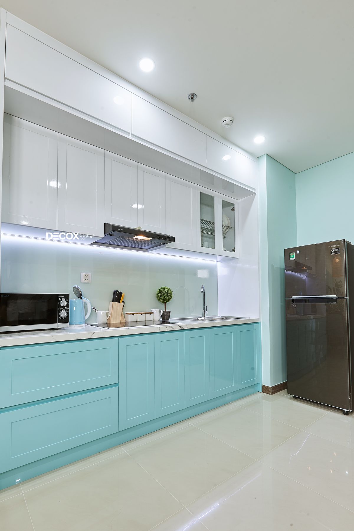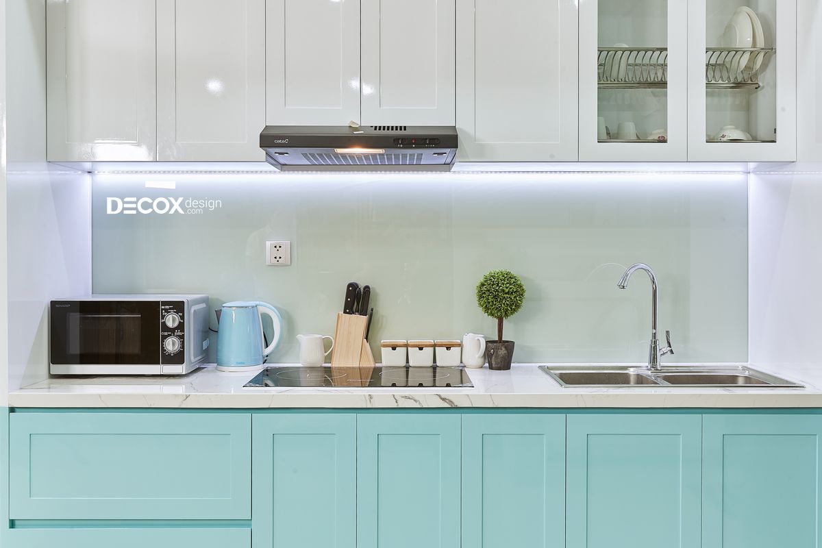 Từ tủ bếp đến tường nhà đều được khoác chiếc áo màu xanh bầu trời, kết hợp hài hòa và sử dụng kèm nội thất gỗ tạo ra được phong cách tropical xanh mát.