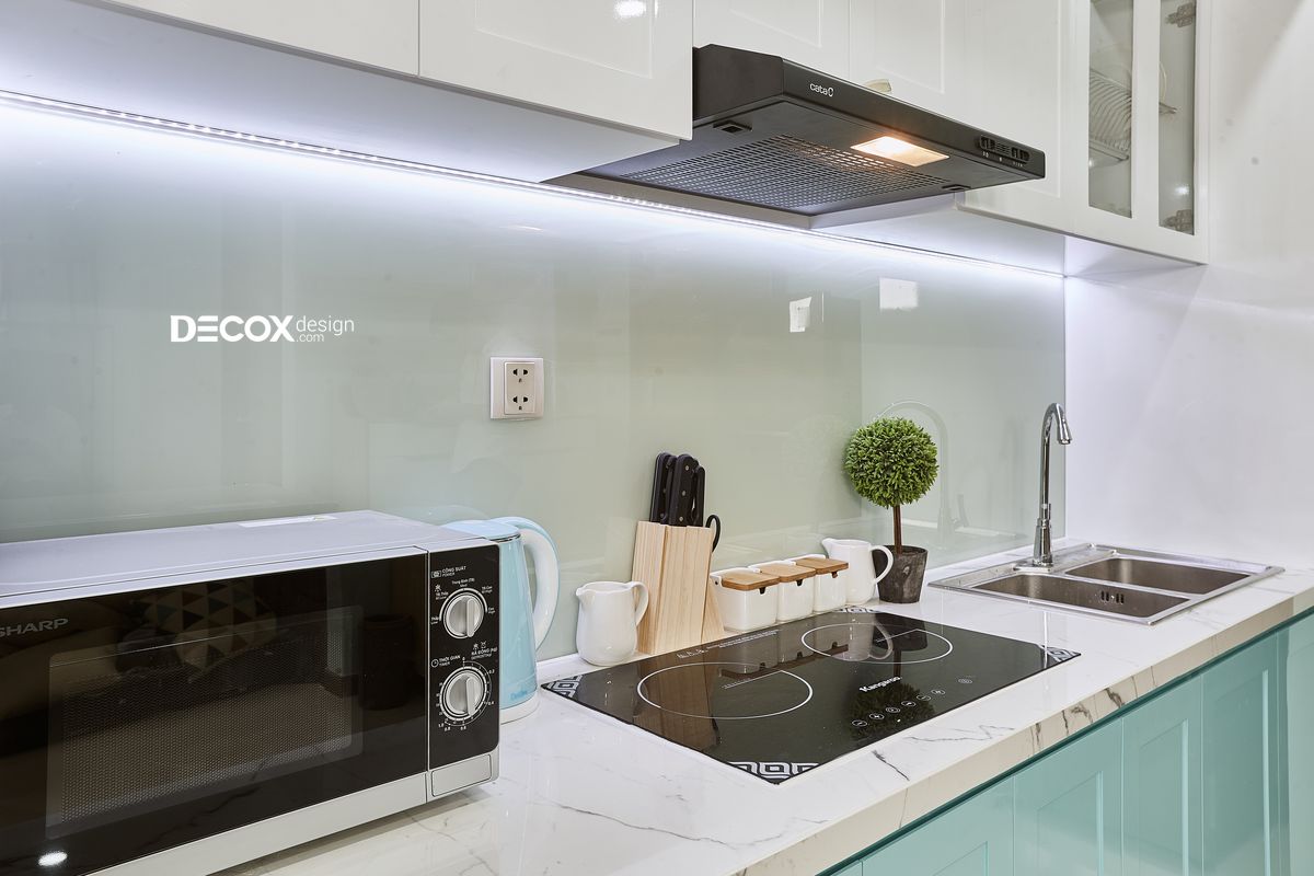Không gian và cách thiết kế nội thất căn hộ được sử dụng tông màu chủ đạo là xanh và trắng. Màu xanh tươi mát của bầu trời và màu trắng tinh khôi đã giúp cho căn hộ nhiều sắc màu.