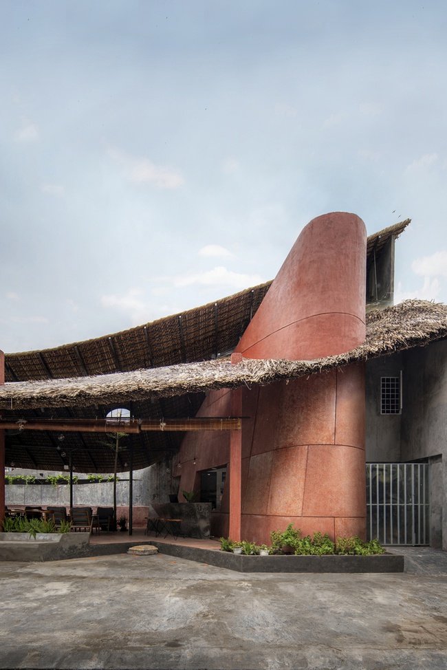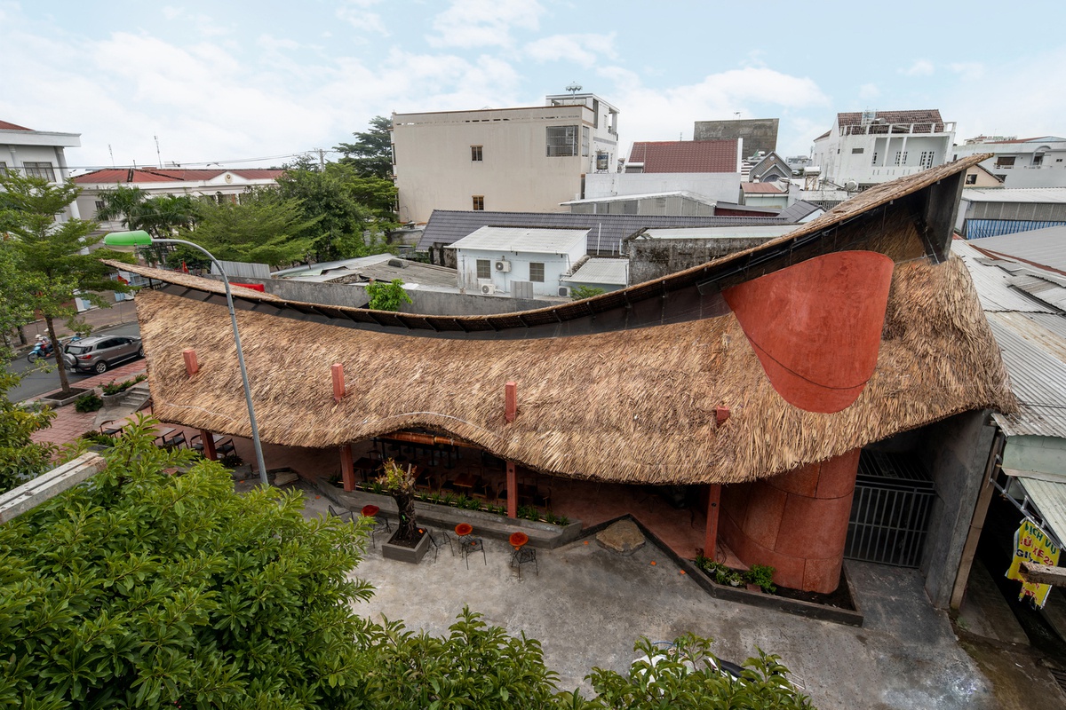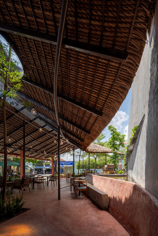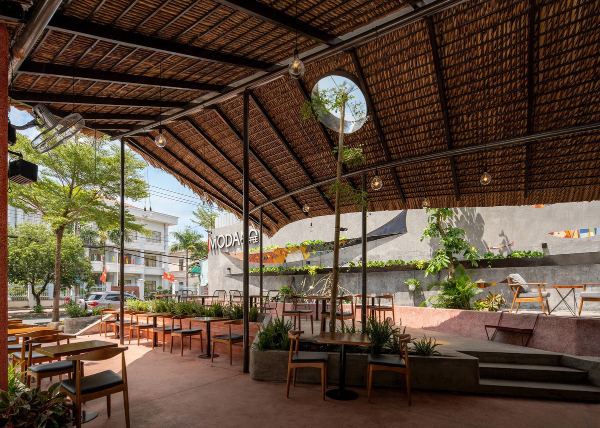 Đồng bằng sông Cửu Long là vùng sông nước thế nên đặc tính, tập quán xây nhà sàn, nhà đá vẫn còn được bảo tồn nguyên vẹn cho đến hôm nay. Điều này đã giúp cho các KTS có ý tưởng về một công trình có cấu trúc bản địa đơn giản và chất liệu hòa hợp với bối cảnh xung quanh. Modano Coffee đã ra đời như thế, hệ mái dài và nặng được nâng đỡ bởi hệ thống khung thép nhẹ uốn lượn như một chiếc diều đang đón gió lơ lửng giữa không trung.