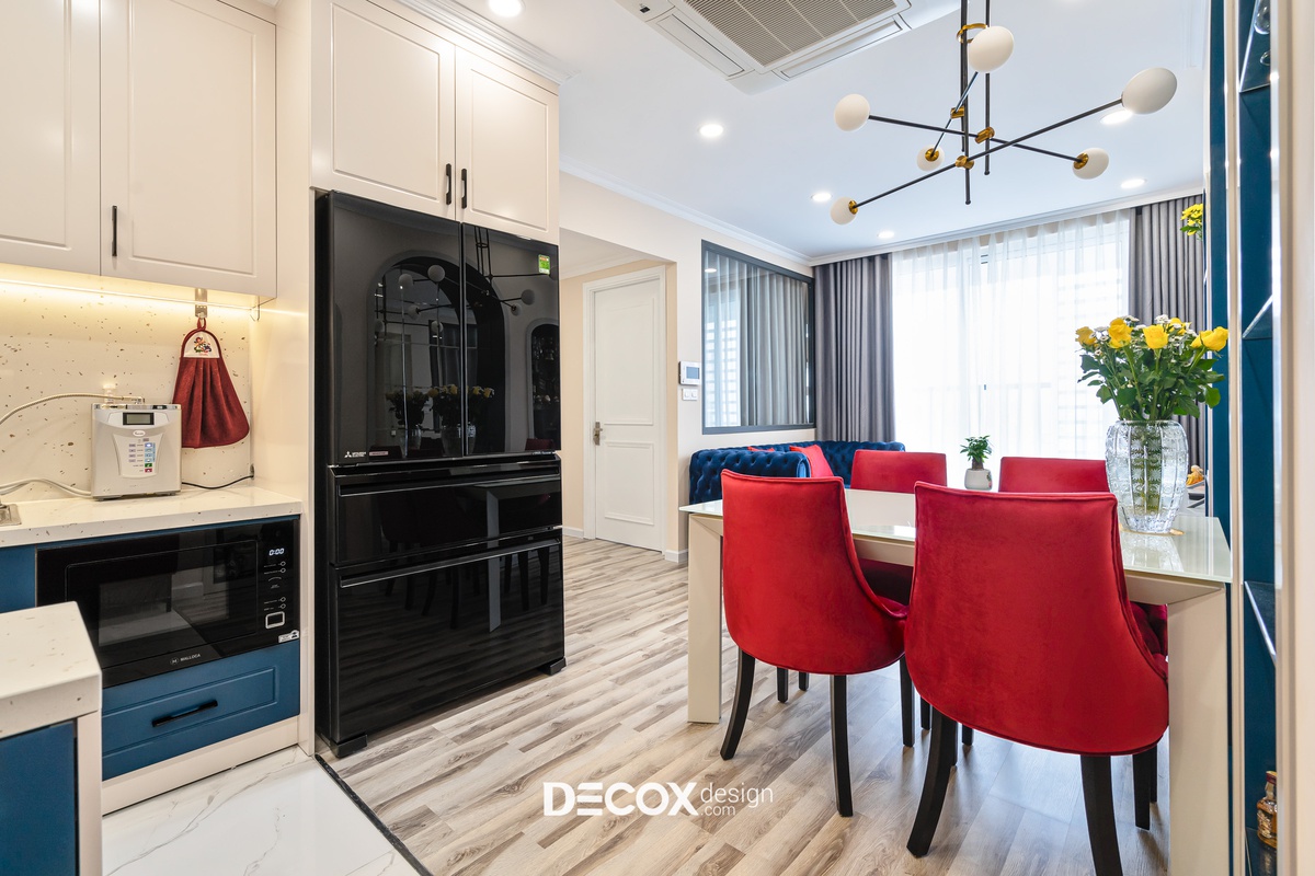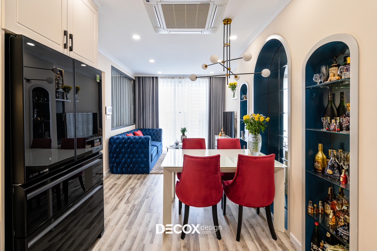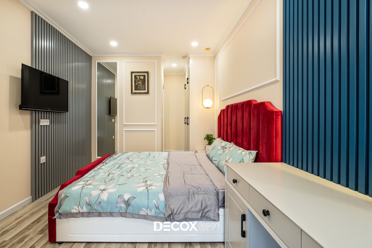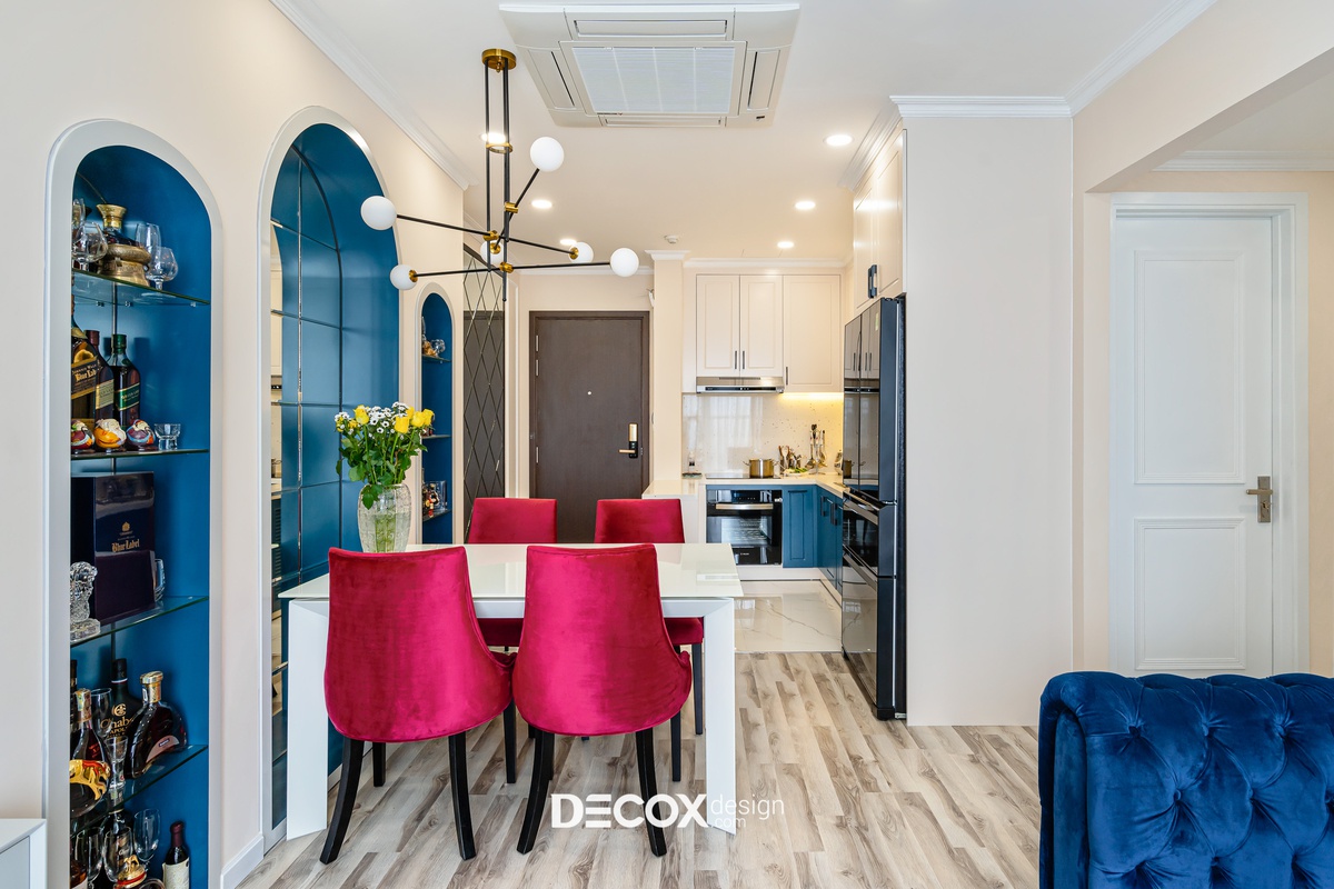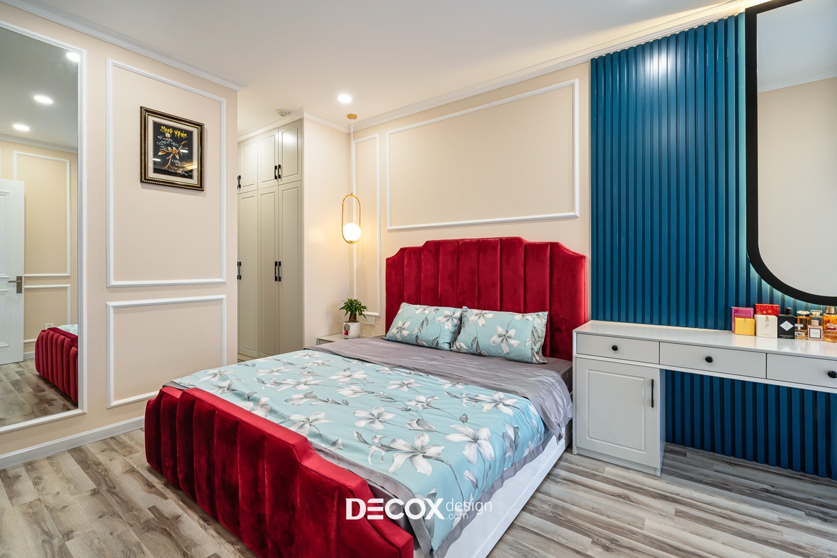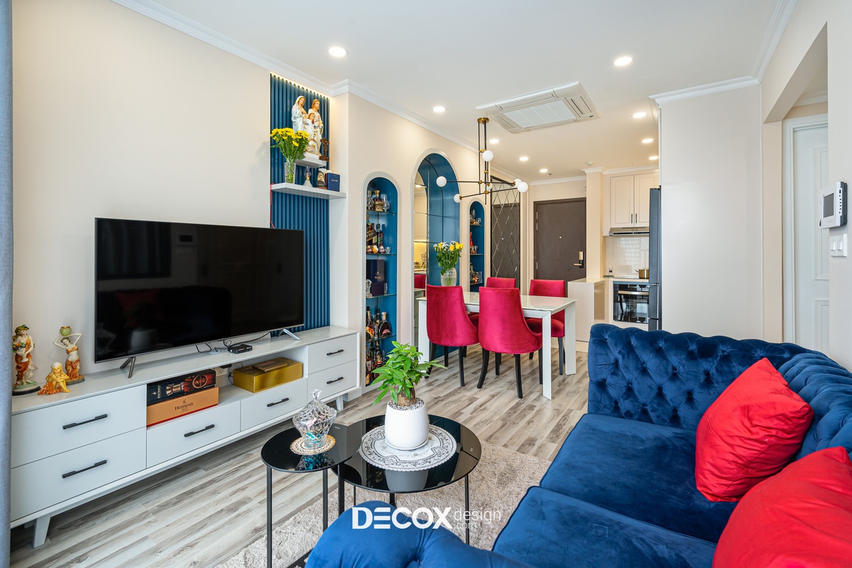 Màu sắc chính là điểm nhấn ấn tượng nhất trong căn hộ này vì KTS của Decox Design đã khéo léo ứng dụng kỹ thuật nhấn khối màu (Colour Block) bằng hai màu xanh - đỏ đối lập ở phòng khách, bàn ăn và phòng ngủ. Điều này sẽ giúp cho không gian thêm phần ấm cúng ấn tượng và lạ mắt hơn so với các thiết kế Bán cổ điển trước đây.