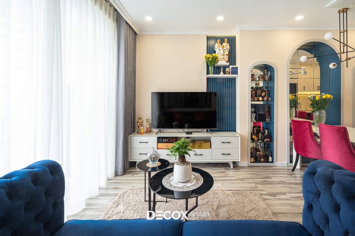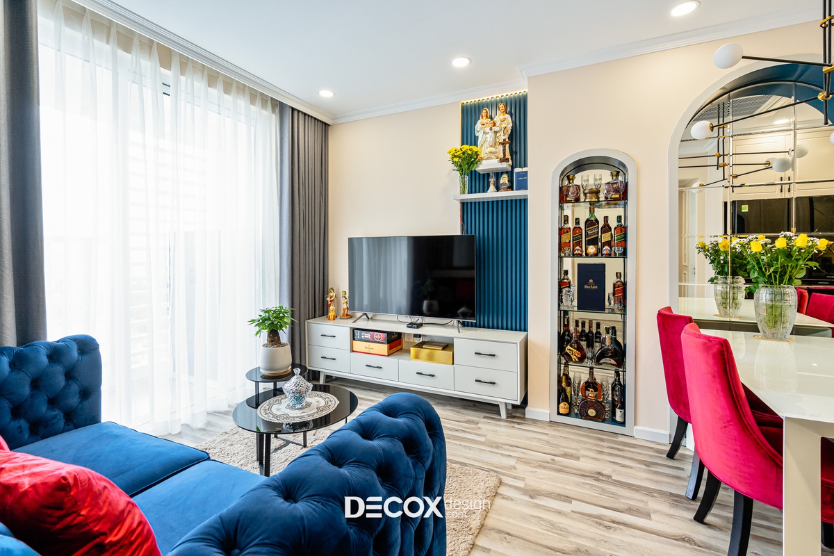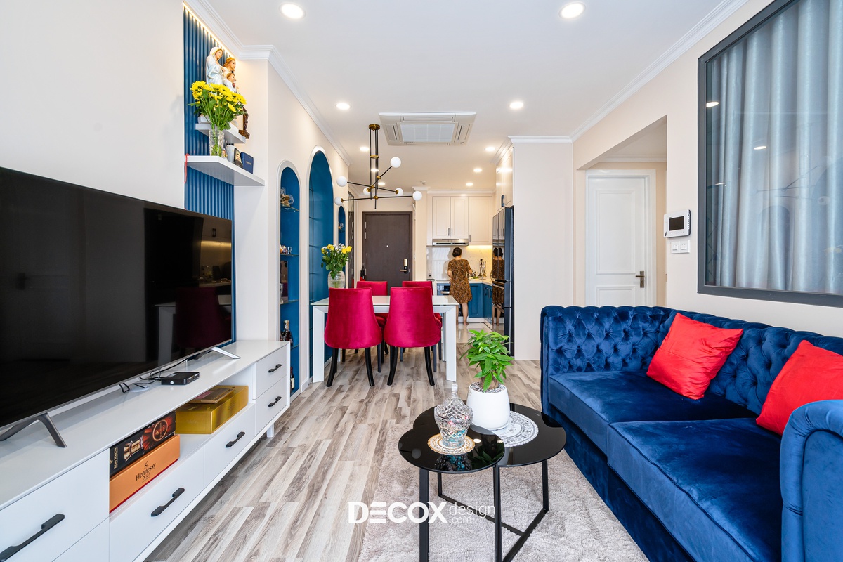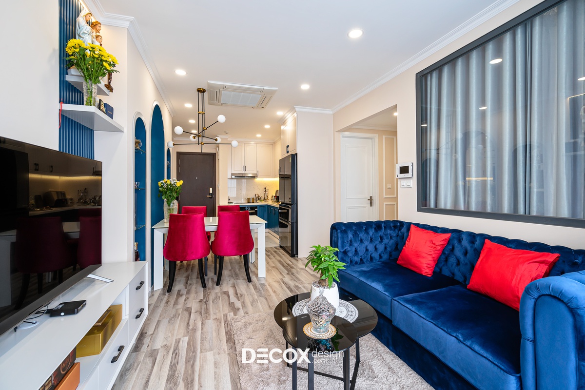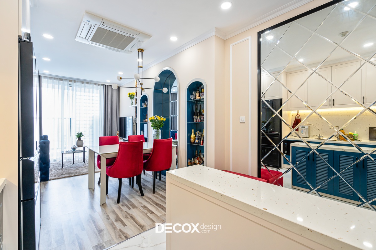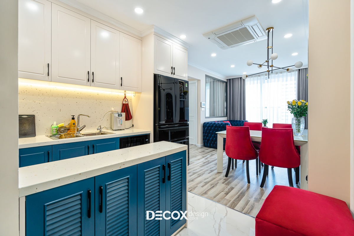 Màu sắc chính là điểm nhấn ấn tượng nhất trong căn hộ này vì KTS của Decox Design đã khéo léo ứng dụng kỹ thuật nhấn khối màu (Colour Block) bằng hai màu xanh - đỏ đối lập ở phòng khách, bàn ăn và phòng ngủ. Điều này sẽ giúp cho không gian thêm phần ấm cúng ấn tượng và lạ mắt hơn so với các thiết kế Bán cổ điển trước đây.