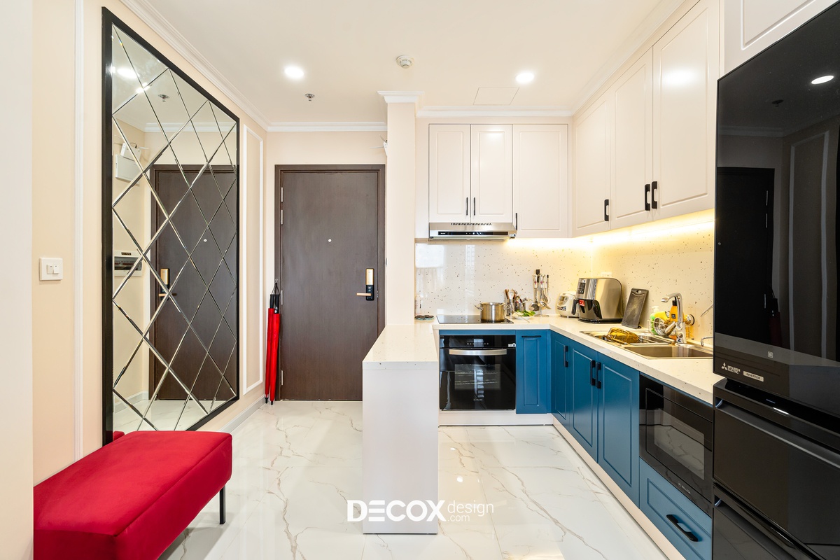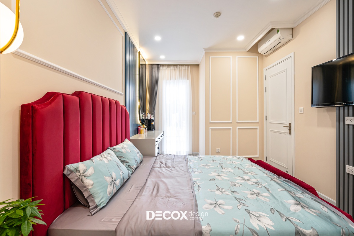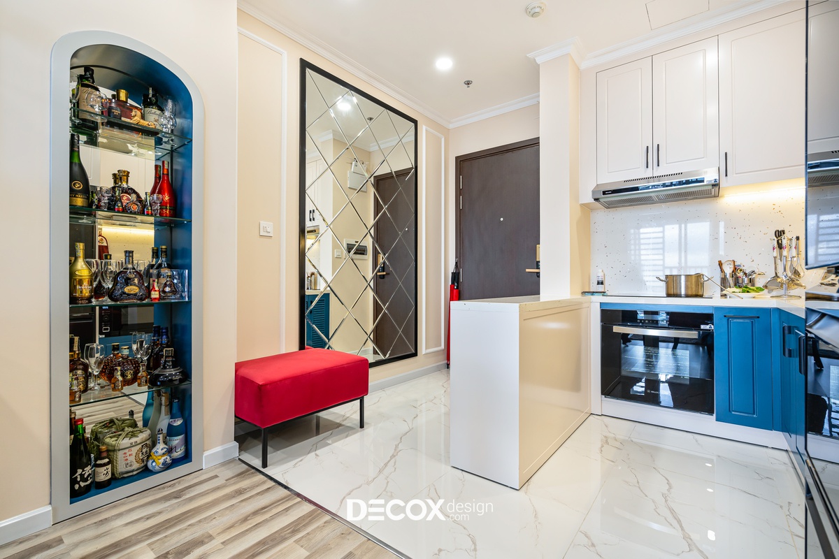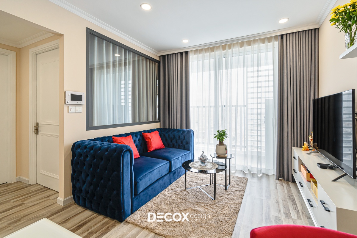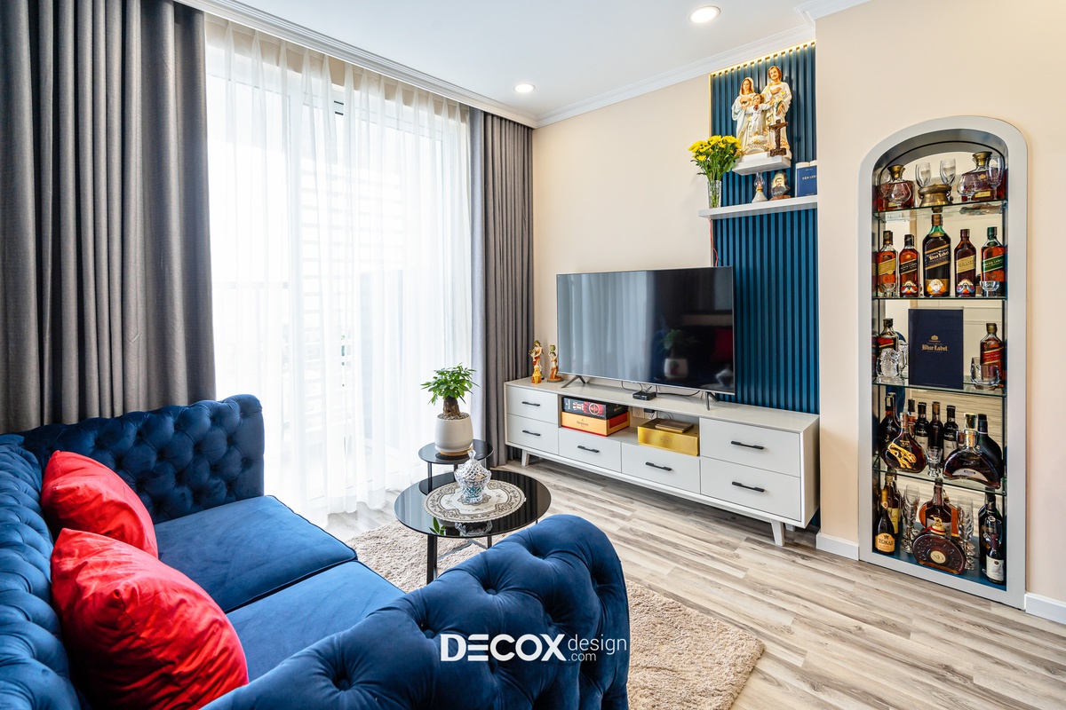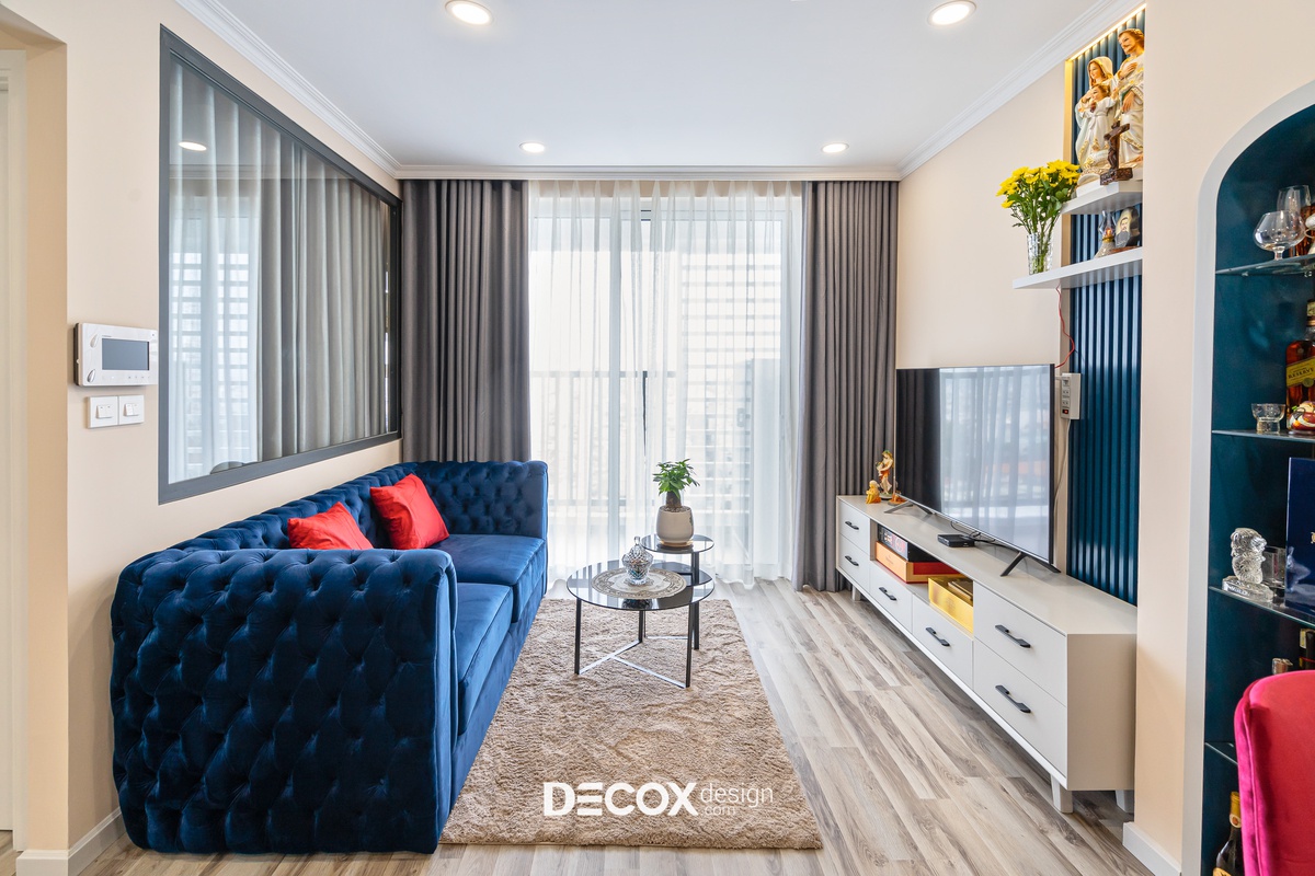 Màu sắc chính là điểm nhấn ấn tượng nhất trong căn hộ này vì KTS của Decox Design đã khéo léo ứng dụng kỹ thuật nhấn khối màu (Colour Block) bằng hai màu xanh - đỏ đối lập ở phòng khách, bàn ăn và phòng ngủ. Điều này sẽ giúp cho không gian thêm phần ấm cúng ấn tượng và lạ mắt hơn so với các thiết kế Bán cổ điển trước đây.