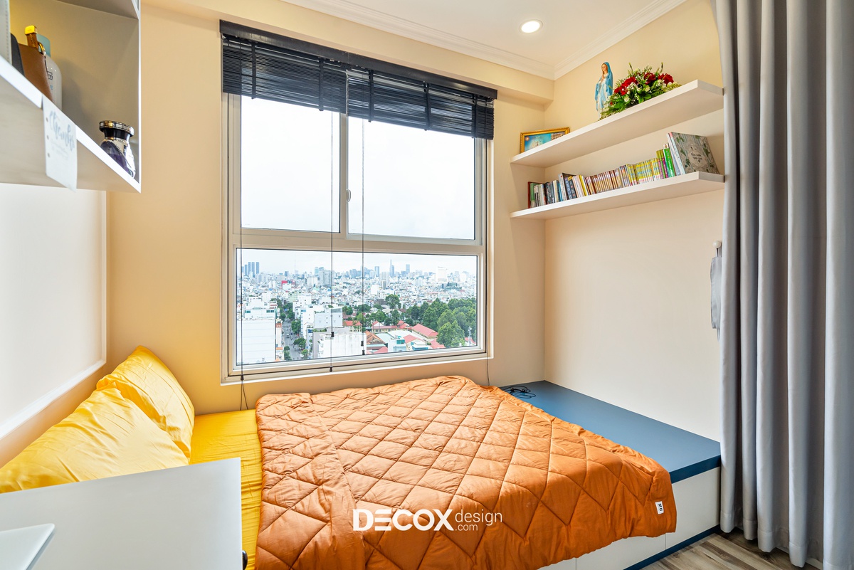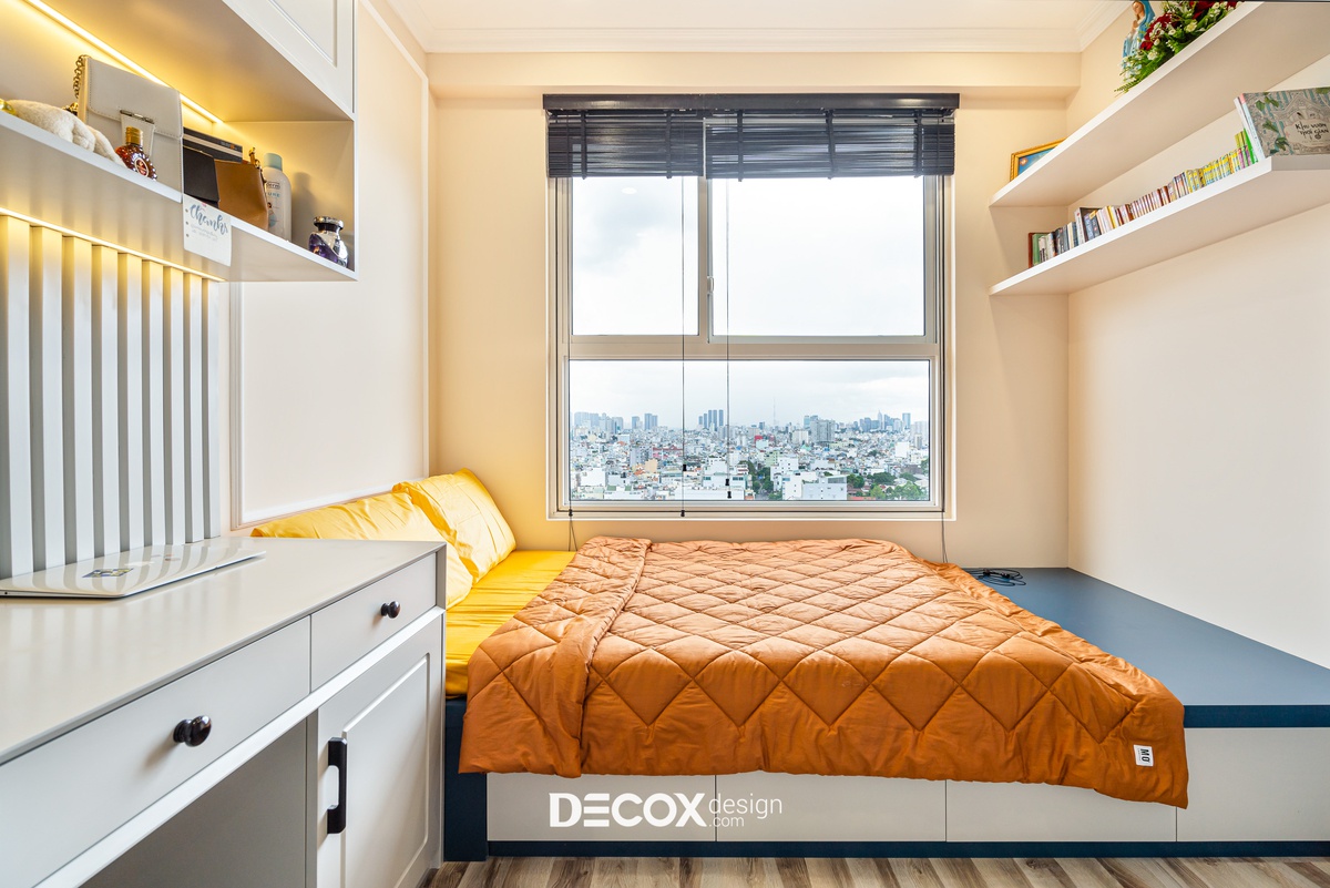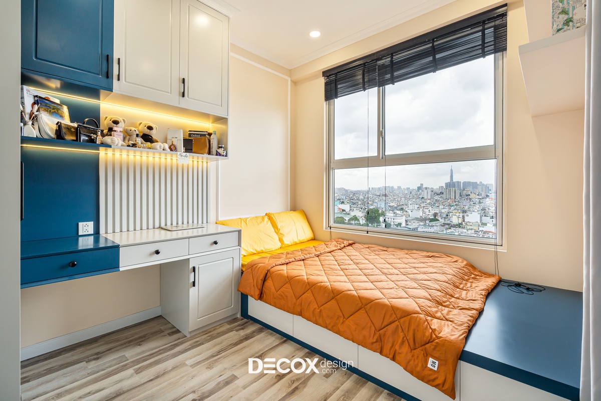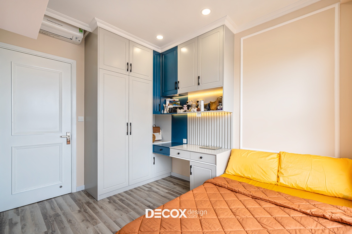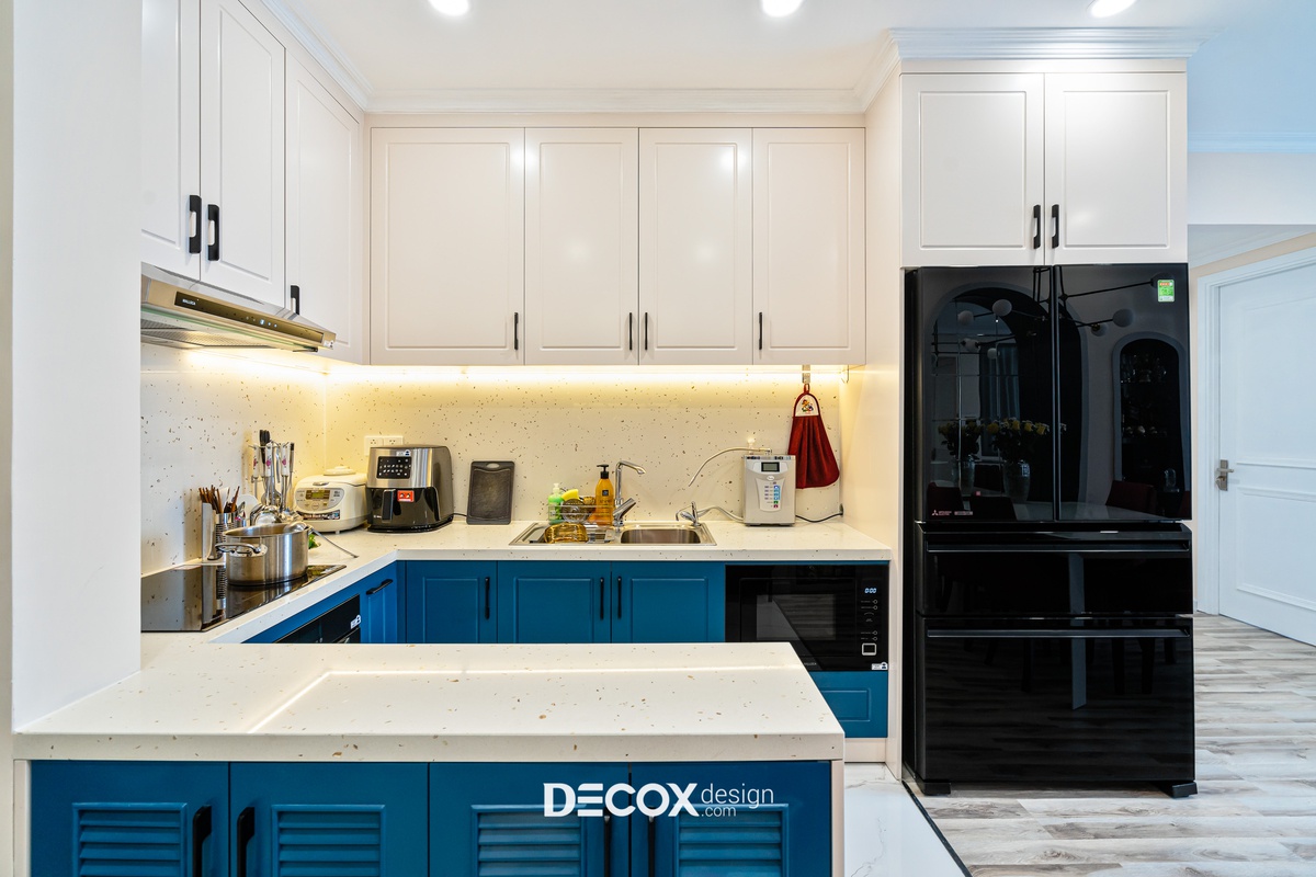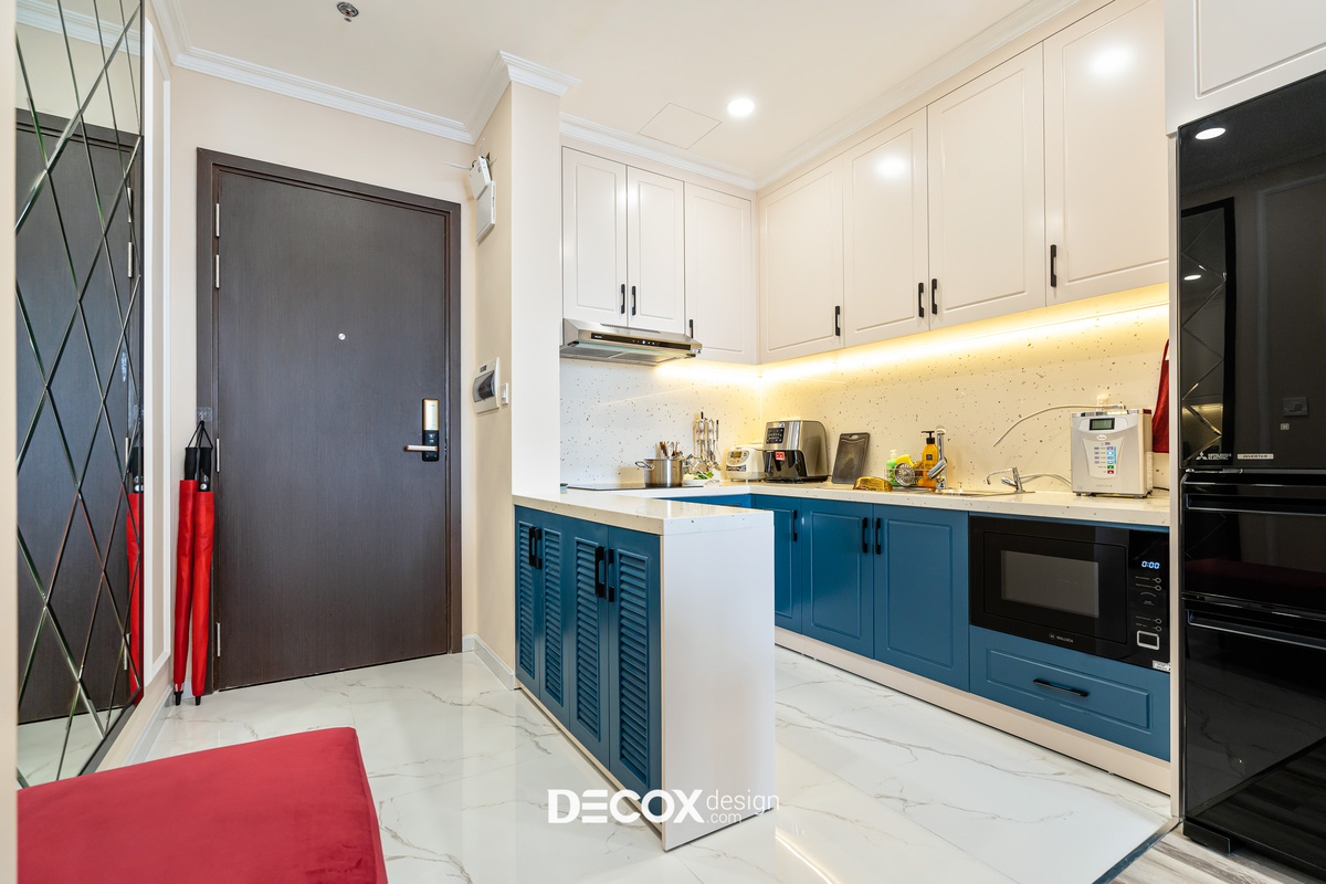 Màu sắc chính là điểm nhấn ấn tượng nhất trong căn hộ này vì KTS của Decox Design đã khéo léo ứng dụng kỹ thuật nhấn khối màu (Colour Block) bằng hai màu xanh - đỏ đối lập ở phòng khách, bàn ăn và phòng ngủ. Điều này sẽ giúp cho không gian thêm phần ấm cúng ấn tượng và lạ mắt hơn so với các thiết kế Bán cổ điển trước đây.